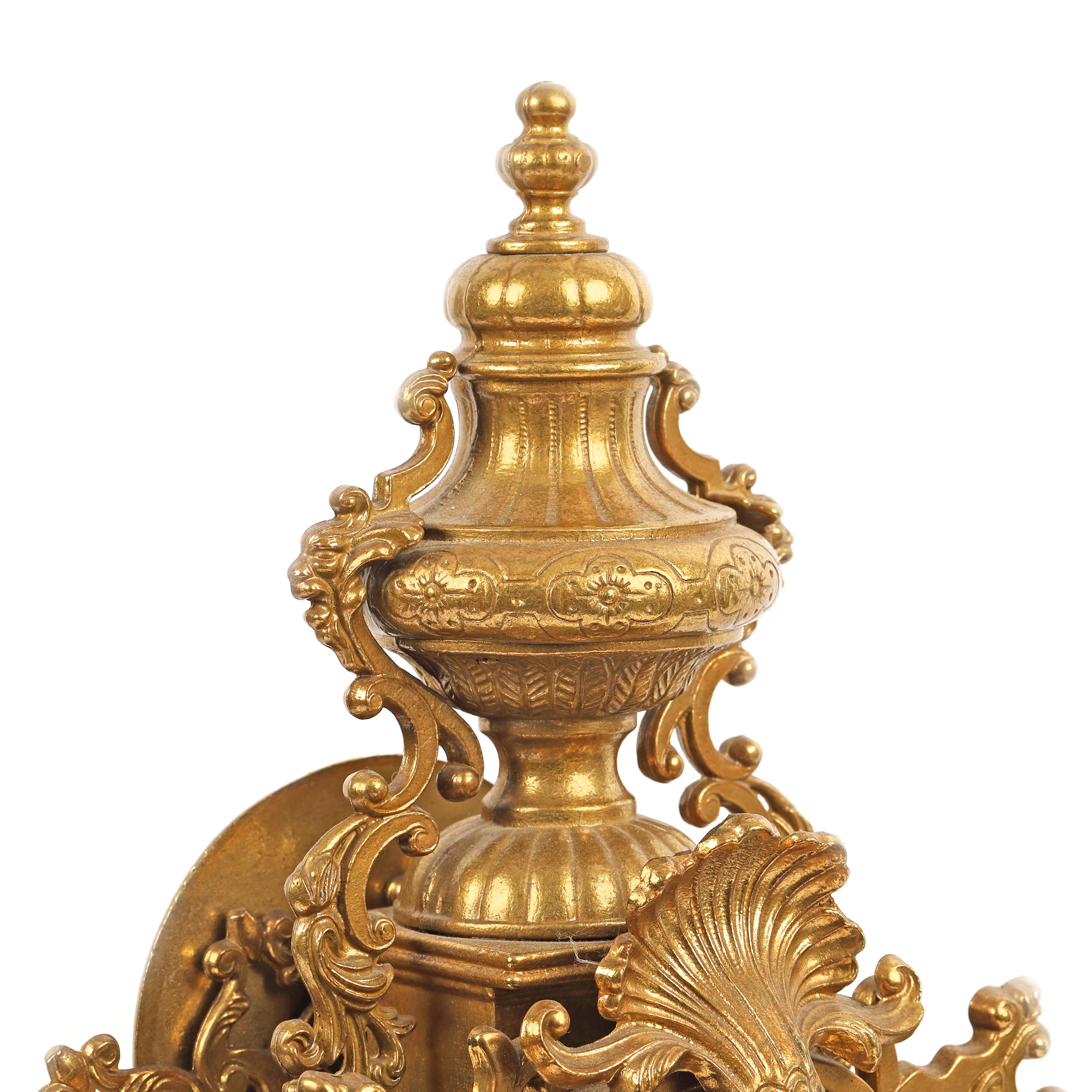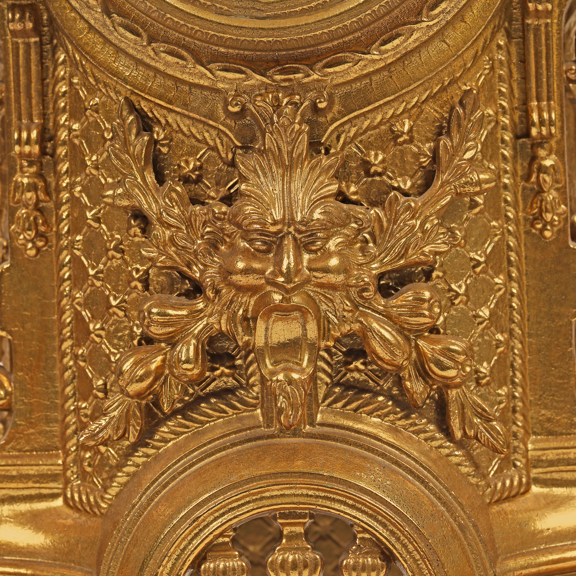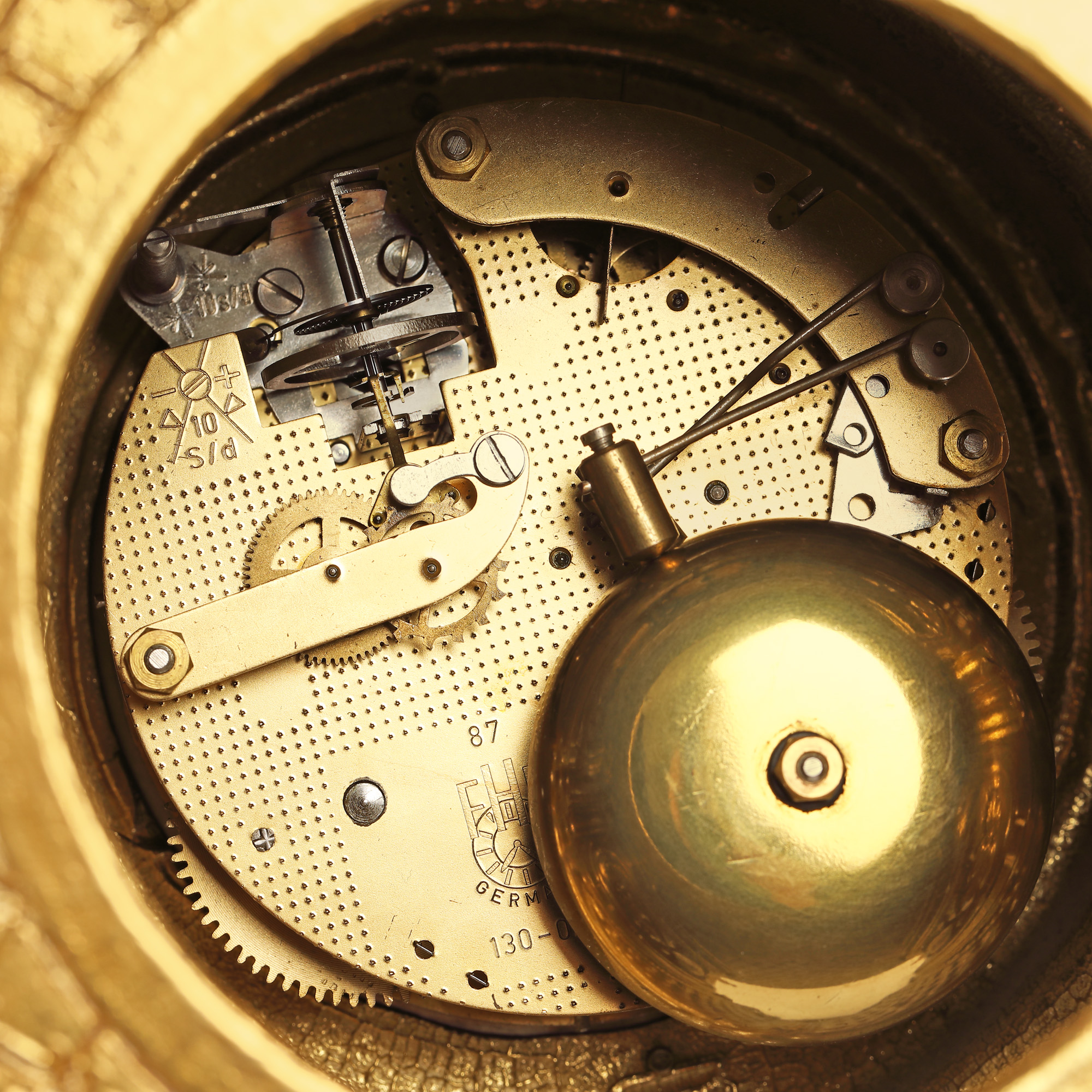 Ceas Imperial, de birou. Mecanism Franz Hermle & Sons, cu armare manuală, cu funcție de alarmă. Carcasă decorată în stil Neo-Rococo.Ceas, bogat decorat cu grifoni și mascaroni, din bronz dore.