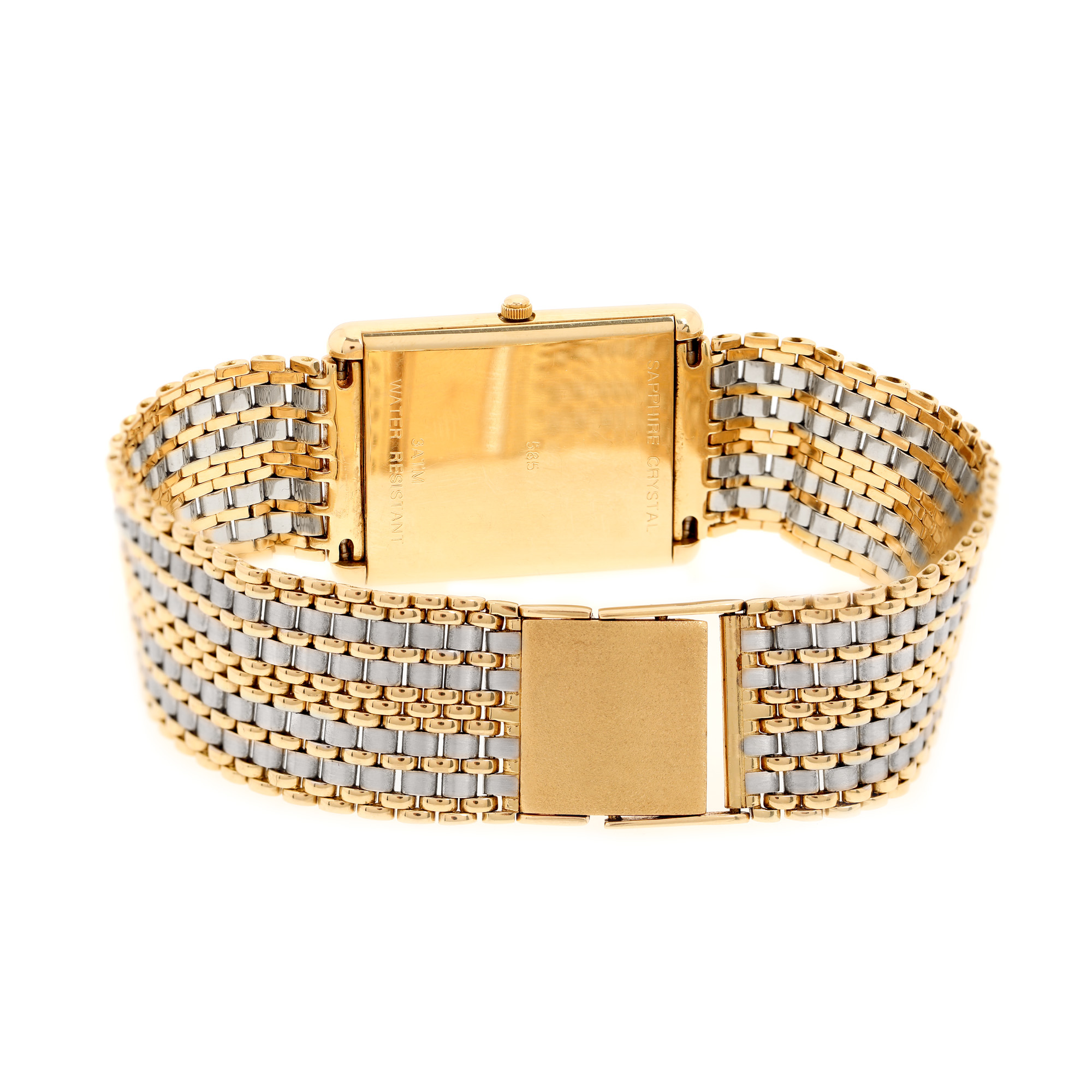 Ceas Geneve Quartz din aur, de mână, de damă. Mecanism quartz. Cadran de culoare alb, indici numerale romane. Brățară originală, din aur, cu sistem de închidere de tip deployant.