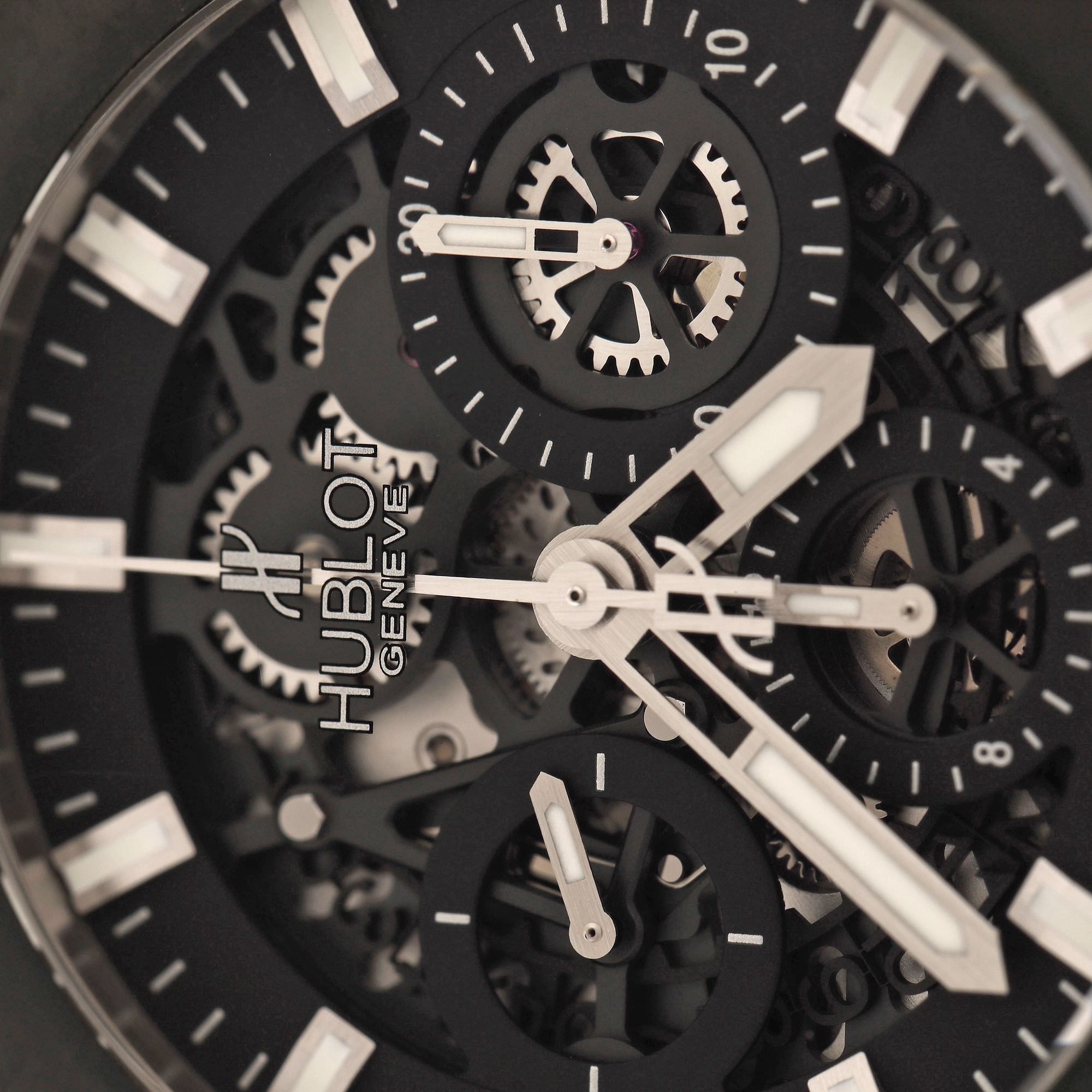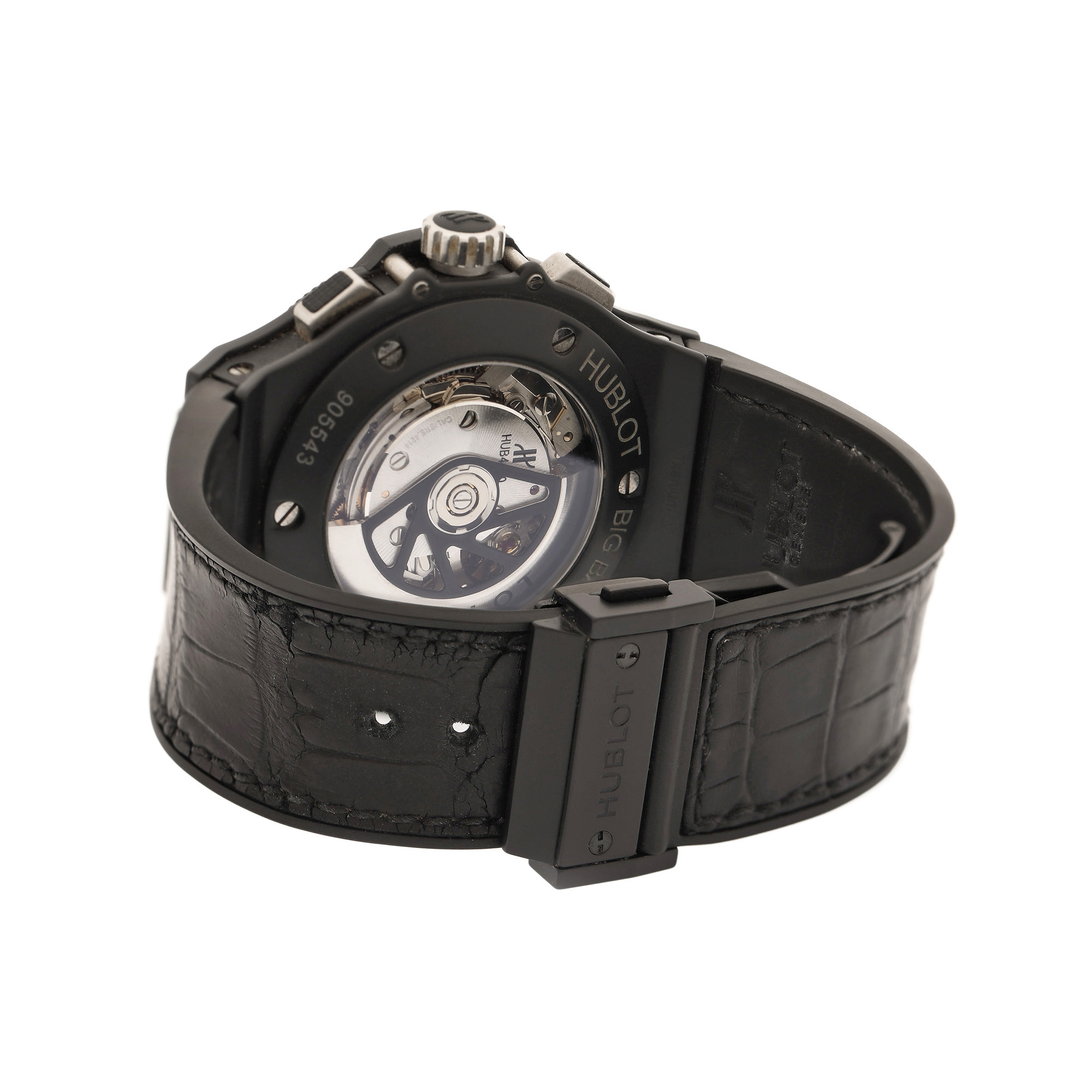Ceas Hublot Big Bang Skeleton, de mână, bărbătesc. Mecanism automatic cu funcție de chronograph. Cadran transparent, de tip skeleton, cu două registre pentru chronograph în dreptul orelor 3 și 6, cu registru pentru secundar în dreptul orei 9. Curea originală, de culoare neagră.