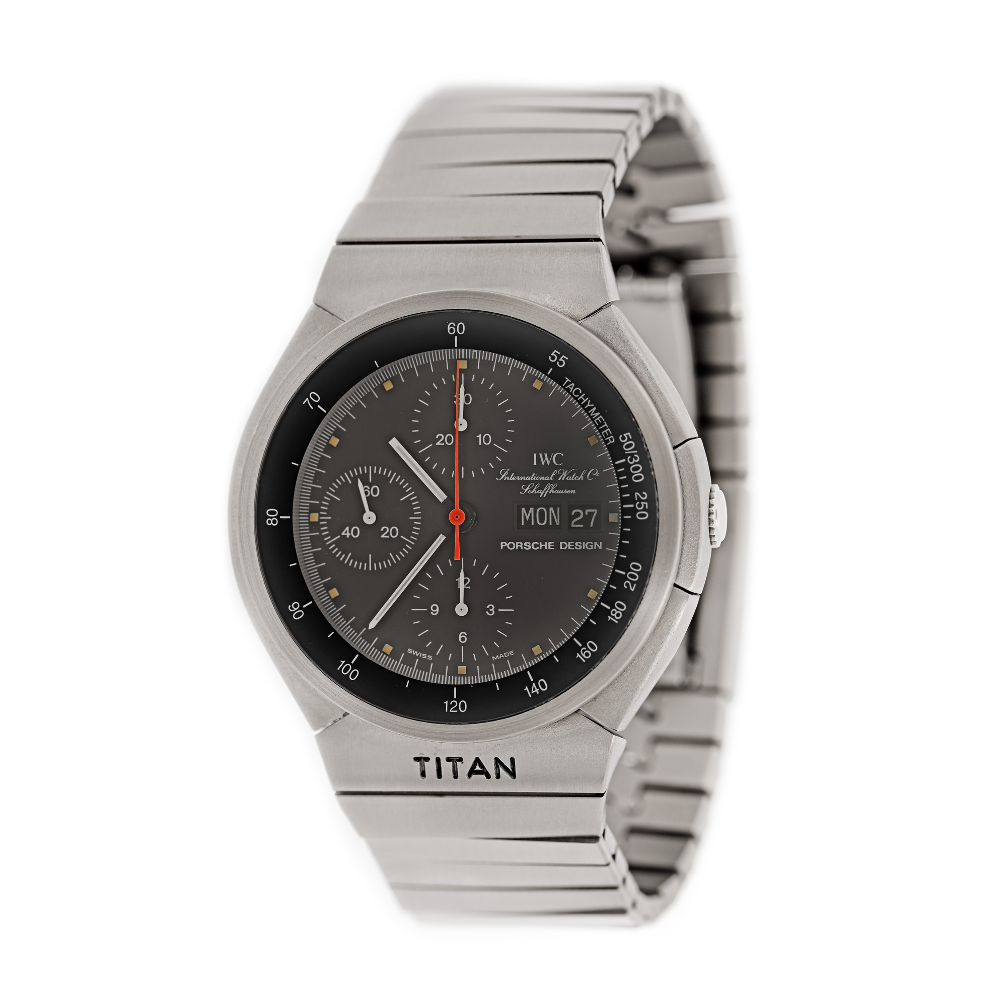 Ceas IWC Porsche Design din titan, de mână, bărbătesc, referință IW3700. Mecanism automatic calibrul IWC 790 bazat pe un mecanism ETA 7750 (Valjoux), cu funcție chronograph. Cadran de culoare negru, cu două registre pentru chronograph în dreptul orelor 6 și 12, cu registru pentru secundar în dreptul orei 9, registru pentru ziua săptămânii și dată în dreptul orei 3. Brățară originală din titan cu sistem de închidere de tip deployant.