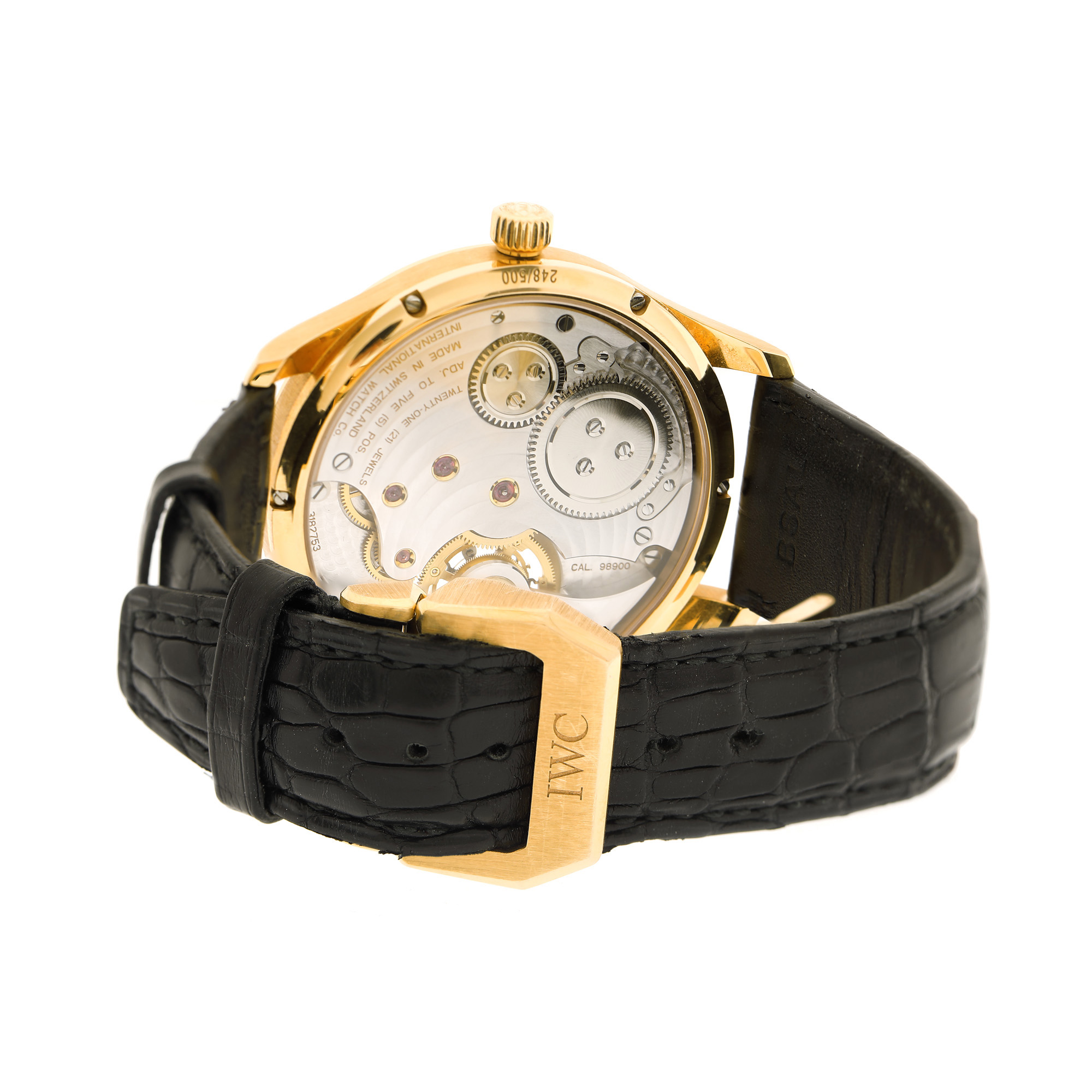 Ceas IWC Portuguese, ediție limitată dedicată lui F.A. Jones, fondatorul companiei, nr 248/500, din aur, de mână, bărbătesc, referință IW 5447-05. Mecanism tourbillon, cu armare manuală, calibrul 98900, cu 21 de rubine, anterior vitrat. Cadran de culoare negru, cu indici numerale arabe, registru pentru secundar în dreptul orei 6, registru deschis pentru tourbilion în dreptul orei 9. Curea adăugată aftermarket, din piele de crocodil, de culoare neagră, cu sistem de închidere de tip deployant, din aur, original.
