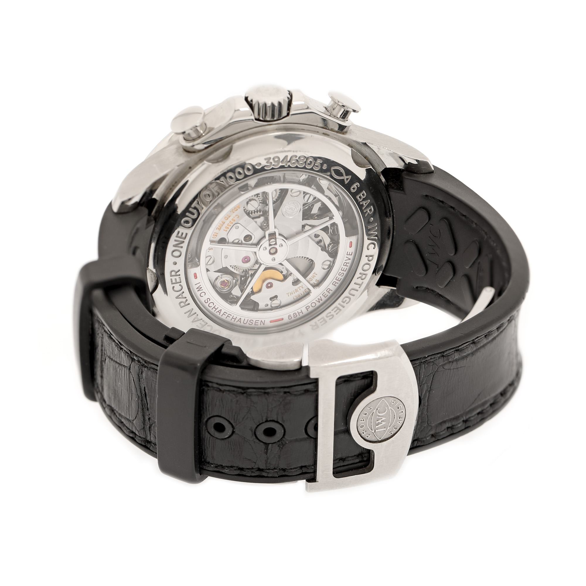 Ceas IWC Portuguese Yacht Club Ocean Racer, de mână, bărbătesc, referință IW390216, ediție limitată 1000 buc. Mecanism automatic, calibrul 89361, cu 38 de rubine, cu funcție de chronograph, anterior vitrat. Cadran de culoare gri deschis, cu indici numerale arabe, cu registru pentru chronograph în dreptul orei 12, registru pentru secundar în dreptul orei 6, registru pentru dată în dreptul orei 3. Curea originală, din piele și cauciuc, de culoare neagră, cu sistem de închidere de tip deployant.