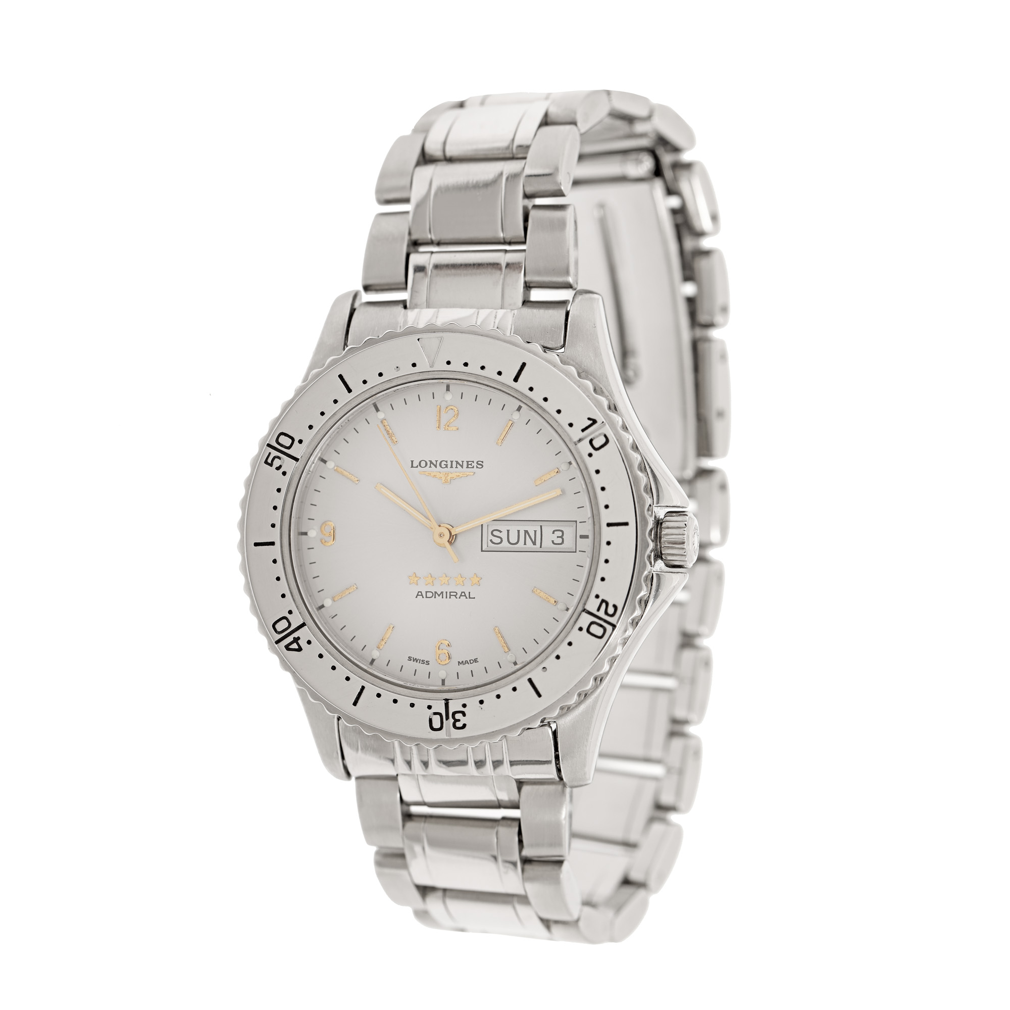 Ceas Longines Admiral, de mână, bărbătesc, referință L 3.600.4. Mecanism automatic, calibrul L.636.5, bezel rotativ, unidirecțional. Cadran de culoare argintiu, cu indici numerale arabe pentru orele 6, 9 și 12 și. registru pentru ziua săptămânii și dată în dreptul orei 3. Brățară originală, din oțel, cu sistem de închidere de tip deployant. Accesorii: cutia originală.