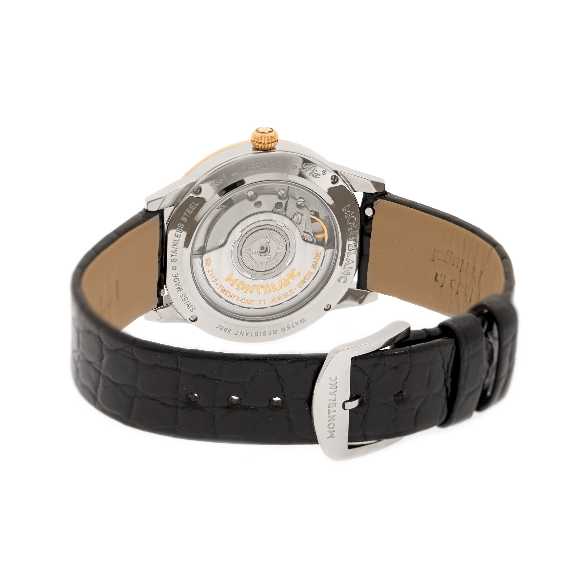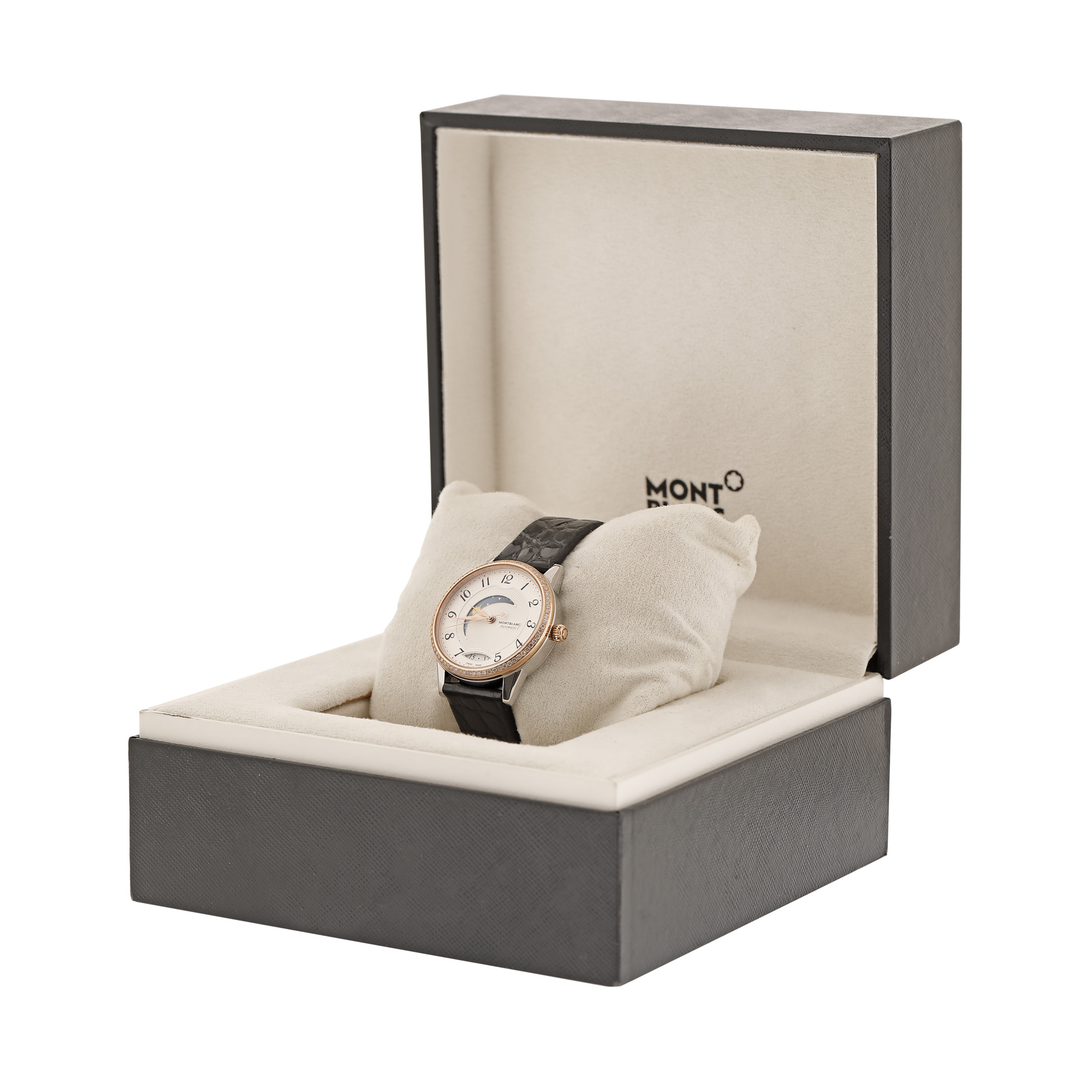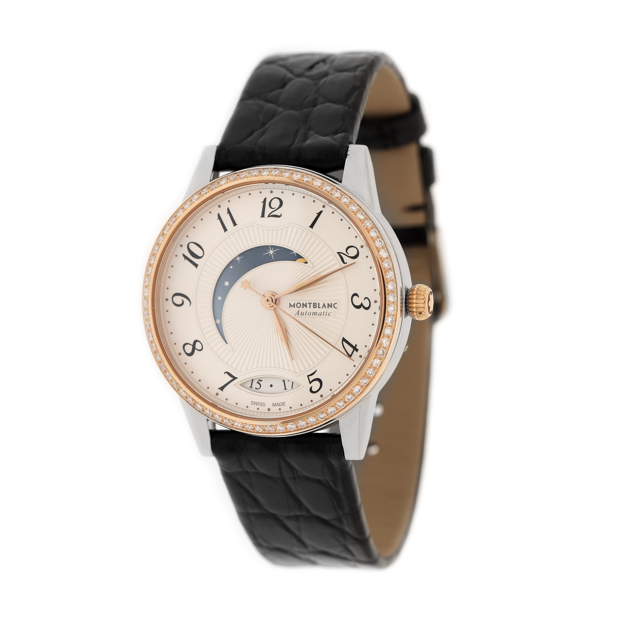 Ceas Montblanc Boheme Day & Night, din aur și oțel, cu diamante, de mână, de damă, referință 112499. Mecanism automatic, calibrul MB 2410, cu 21 de rubine, cu funcții de afișare a datei și a perioadei zilei, anterior vitrat. Cadran de culoare alb, cu indici numerale arabe, cu registru pentru dată în dreptul orei 6 și registru pentru momentul zile in formă de semilună, dispus între orele 8 și 12. Bezel din aur decorat integral cu diamante. Curea originală, din piele, de culoare neagră, cu sistem de închidere clasic cu cataramă originală. Accesorii: cutia originală, ghid de service.