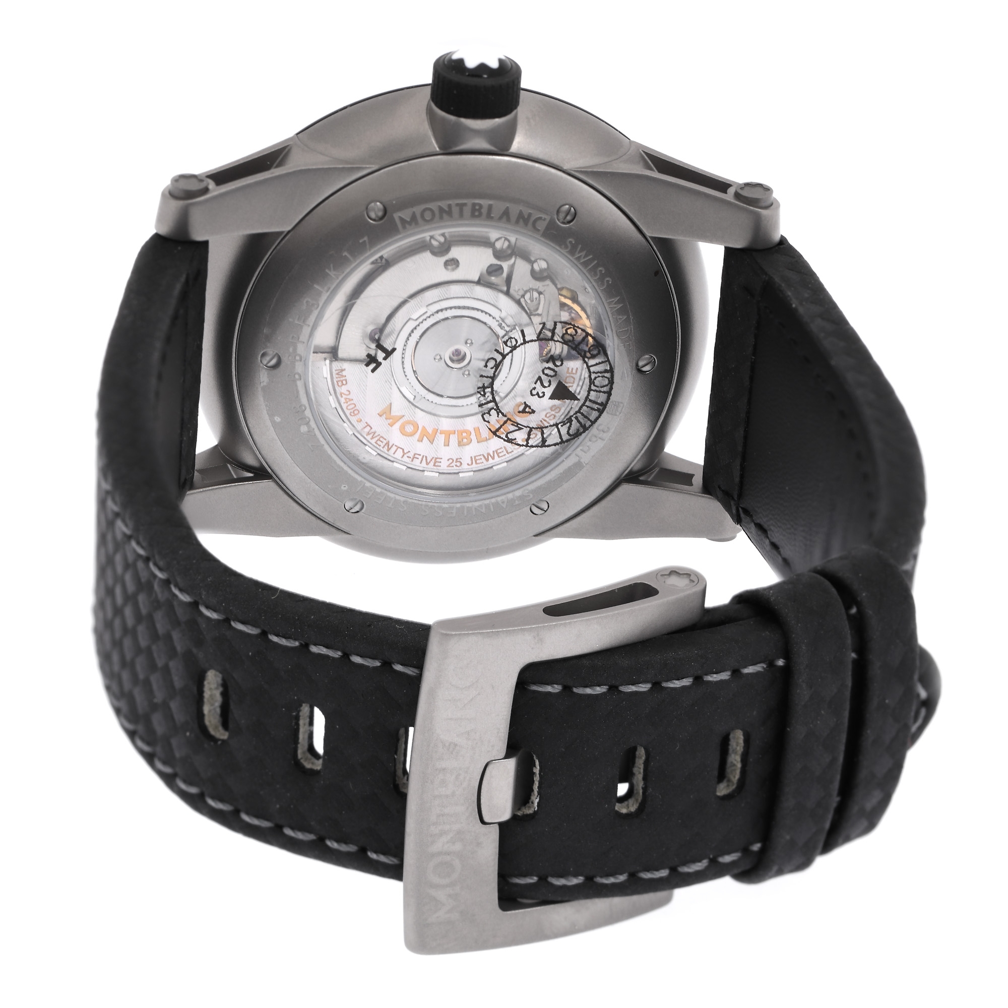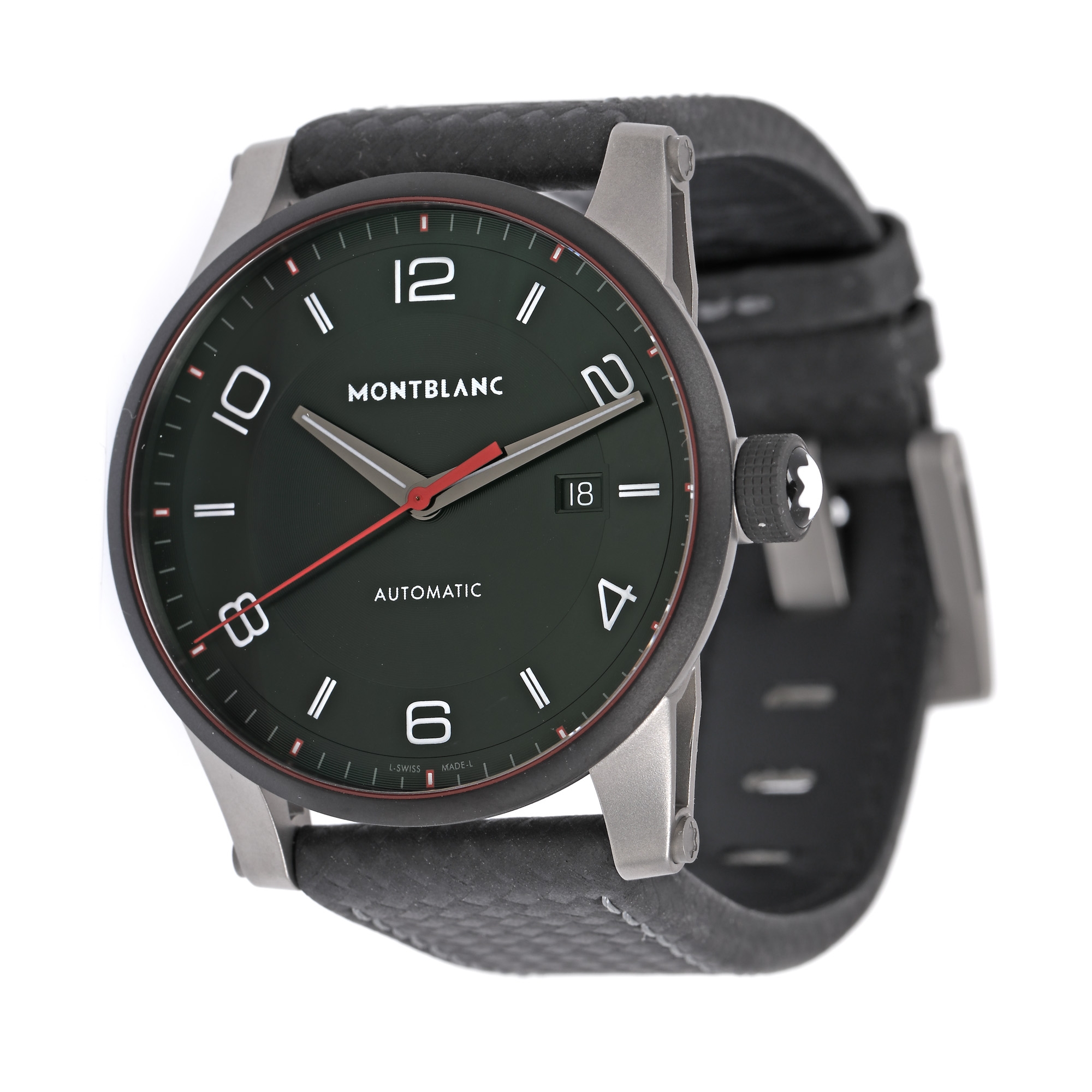 Ceas Timewalker Montblanc, de mână, bărbătesc, referință 115079. Mecanism automatic, calibrul MB 2409, anterior vitrat. Cadran de culoare negru cu indici luminiscenți cifre arabe doar pentru orele pare și baghete pentru cele impare, registru pentru dată în dreptul orei 3. Curea originală, din piele, acoperită cu material textil de culoare negru, sistem de închidere cu cataramă clasică. Vine însoțit de cardul de garanție datat 09/10/22.