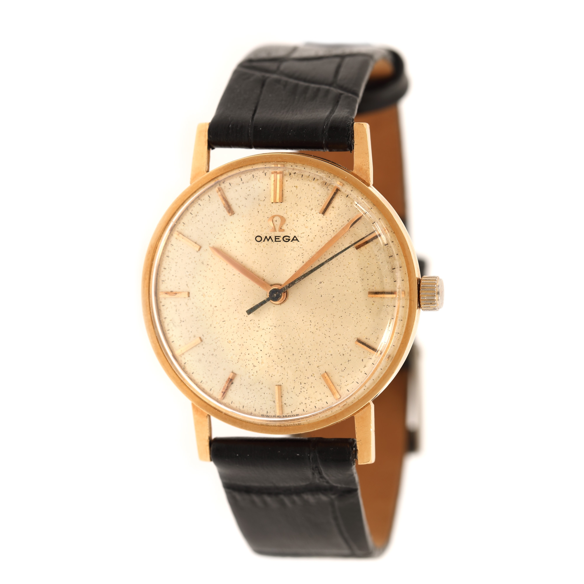 Ceas Omega, de mână, bărbătesc. Mecanism cu armare manuală. Cadran de culoare auriu, indici baghete. Curea adăugată aftermarket, din piele, de culoare neagră, sistem de închidere clasic cu catarama originală.