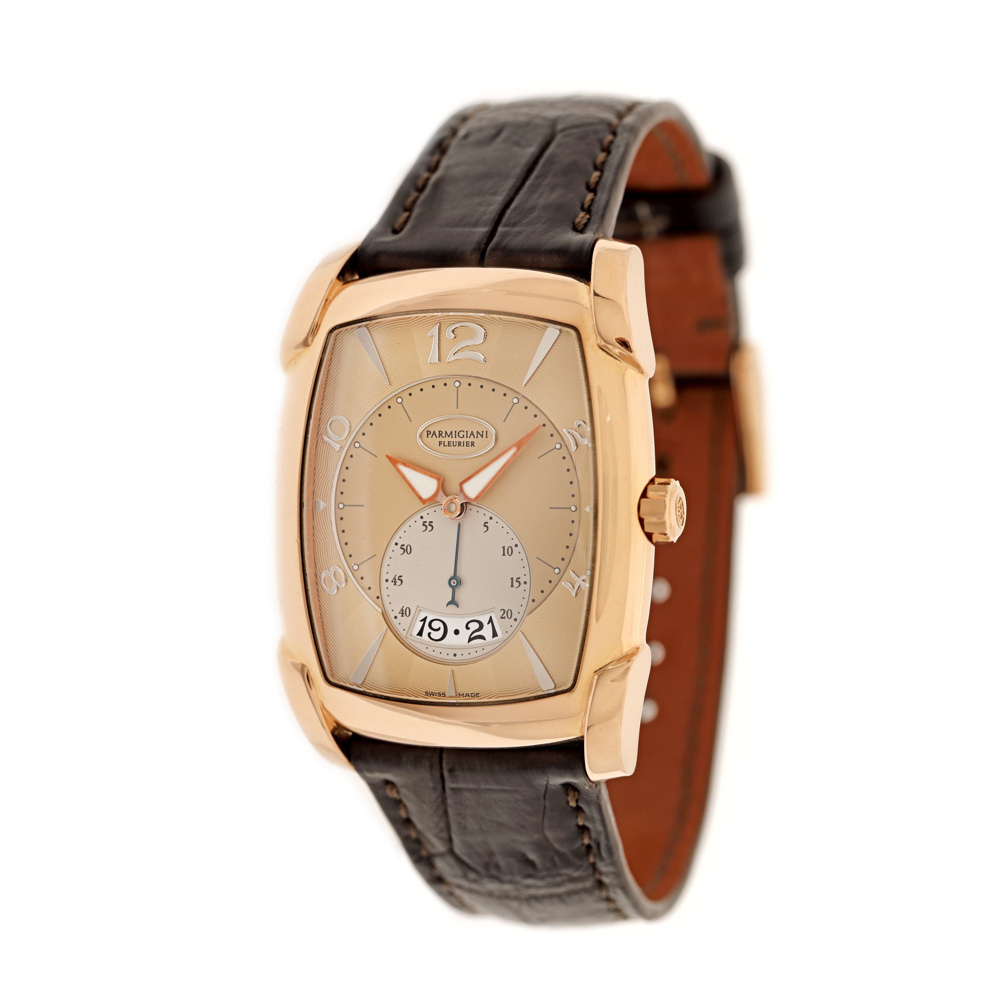 Ceas Parmigiani Fleurier Kalpa Grande, din aur, de mână, bărbătesc, referință PFC124. Mecanism automatic, calibrul 331, cu 32 de rubine, anterior vitrat. Cadran de culoare auriu, idicatori luminiscenți tip săgeată, indici numerale arabe pentru orele pare și săgeți pentru cele impare, cu registru pentru secundar și pentru dată în dreptul orei 6. Curea originală din piele de crocodil, de culoare brun închis, sistem de închidere clasic cu cataramă originală, din aur. Accesorii: cutia originală.