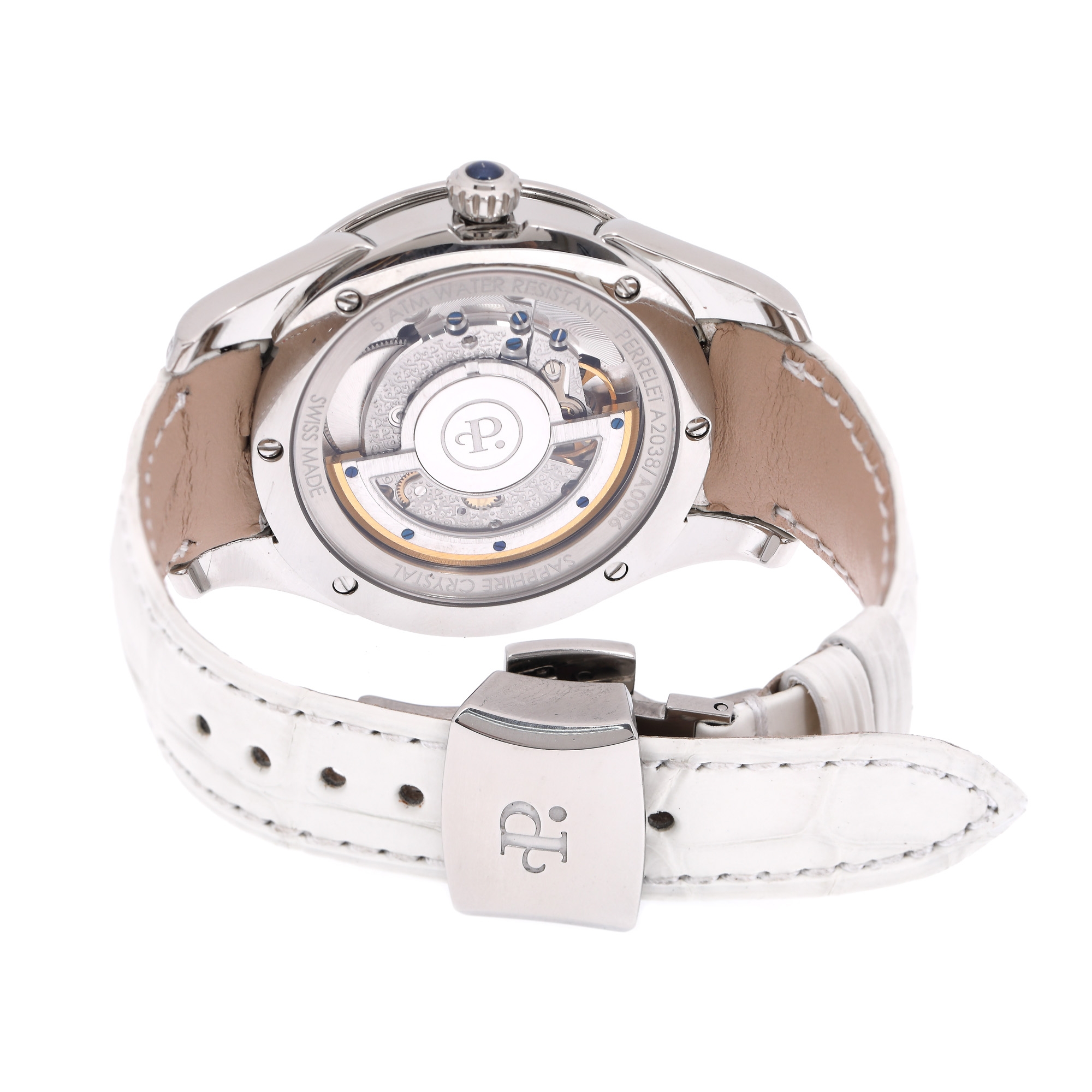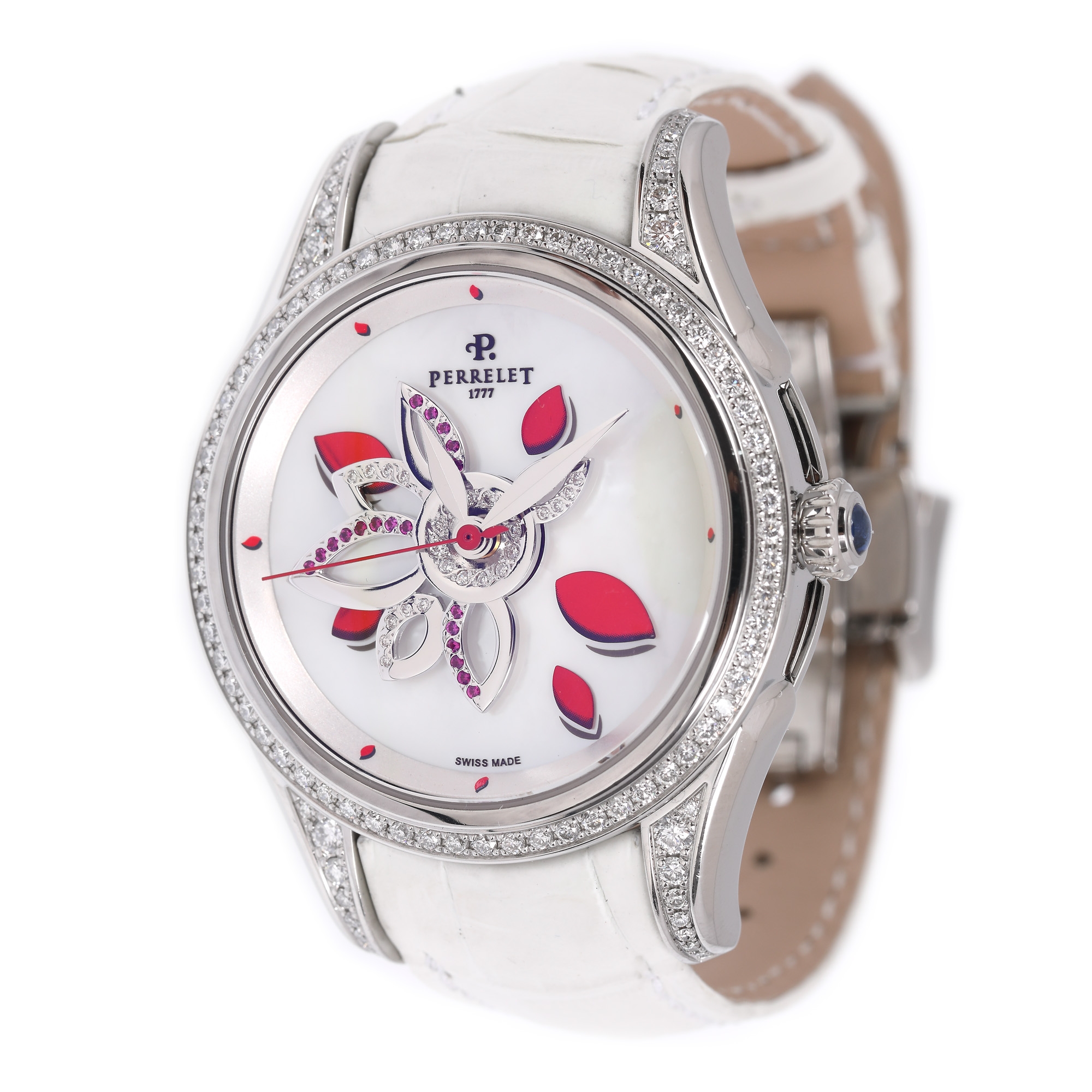 Ceas Perrelet Diamond Flower, cu bezelul și ansele ornate cu diamante, de mână, de damă, referință A 2038. Mecanism automatic, calibrul P-181, anterior vitrat. Cadran din sidef, fără numerali, decorat cu o floare metalică mobilă ce pivotează in jurul axului indicatorilor. Cureaua originală, din piele de aligator, de culoare albă cu sistem de închidere de tip deployant.