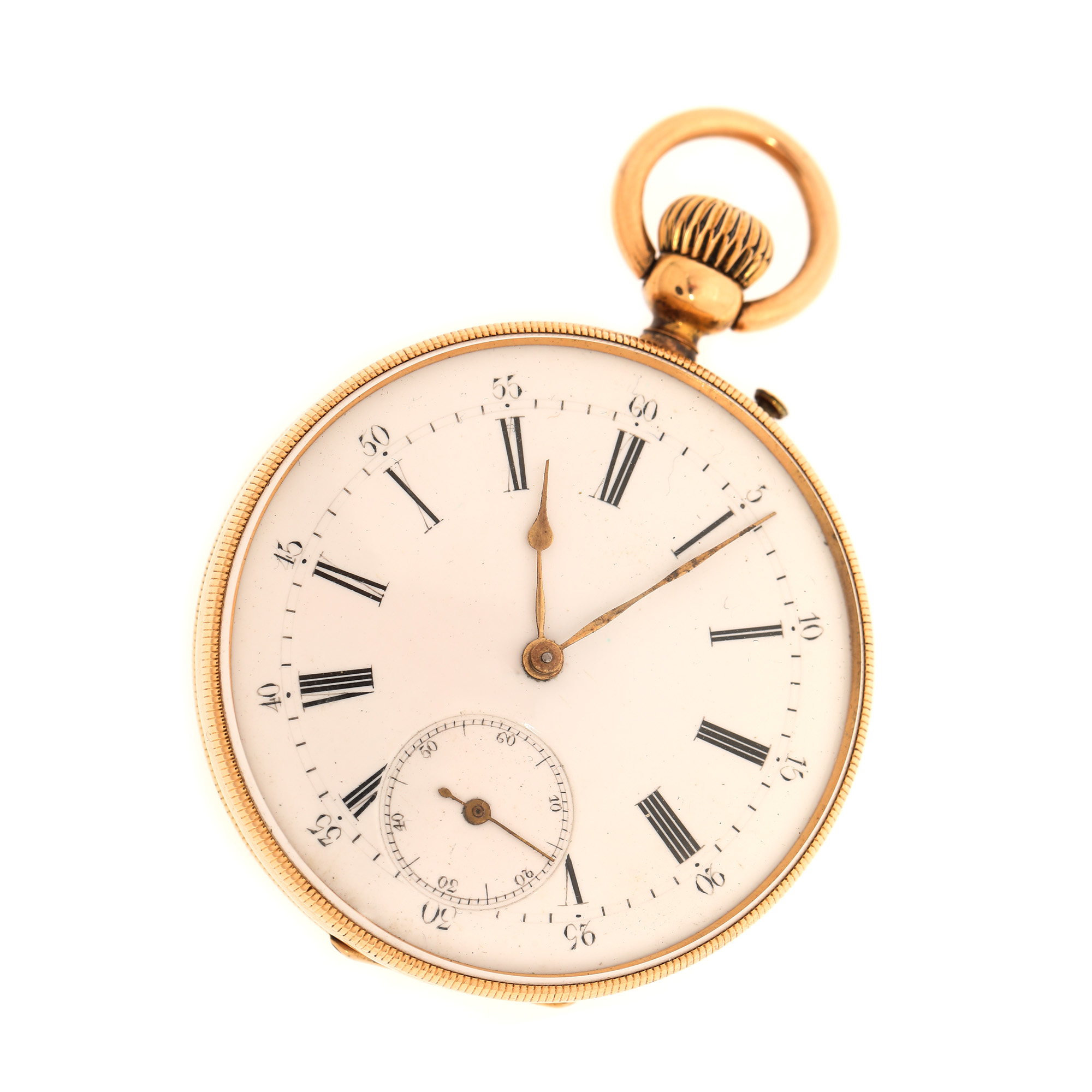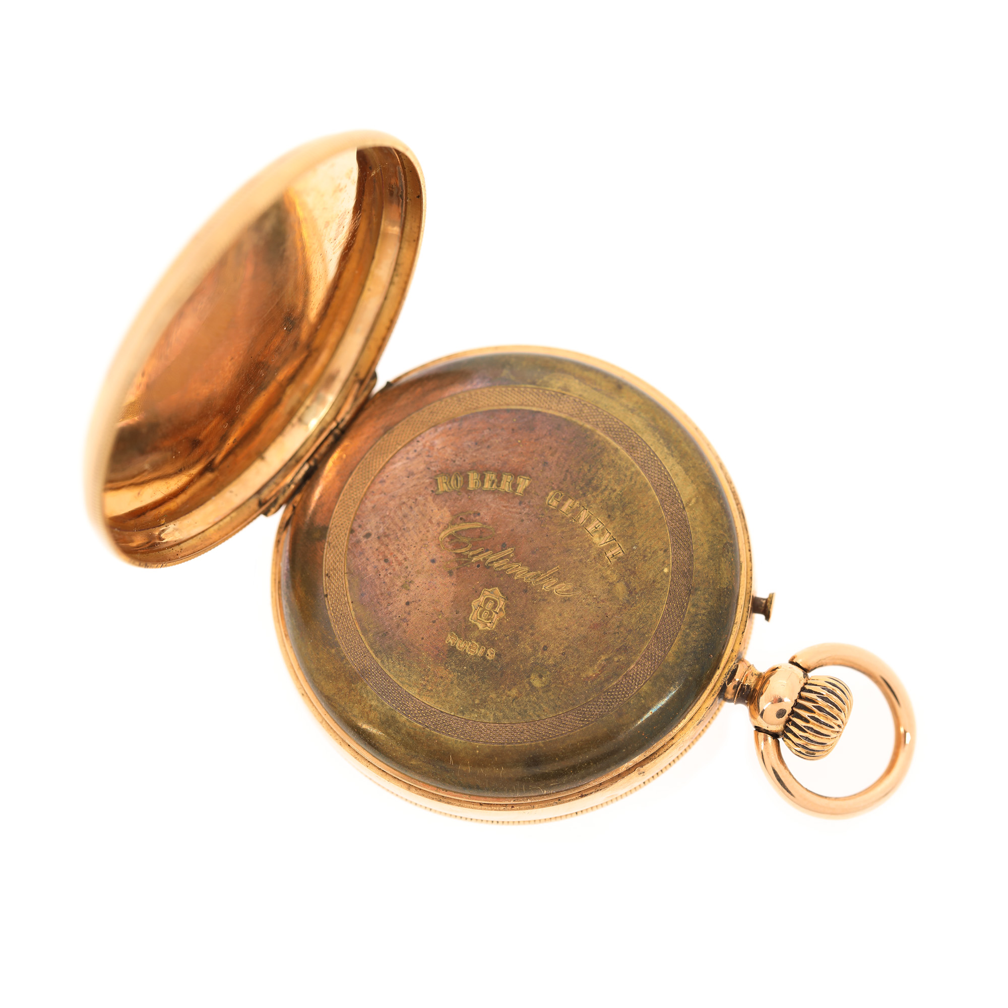 Ceas Robert Geneve Cylindre din aur, de buzunar, bărbătesc. Mecanism cu armare manuală cu 8 rubine. Cadran de culoare alb, indici numerale romane pentru ore și numerale arabe pentru minute, registru pentru secundar în dreptul orei 6.