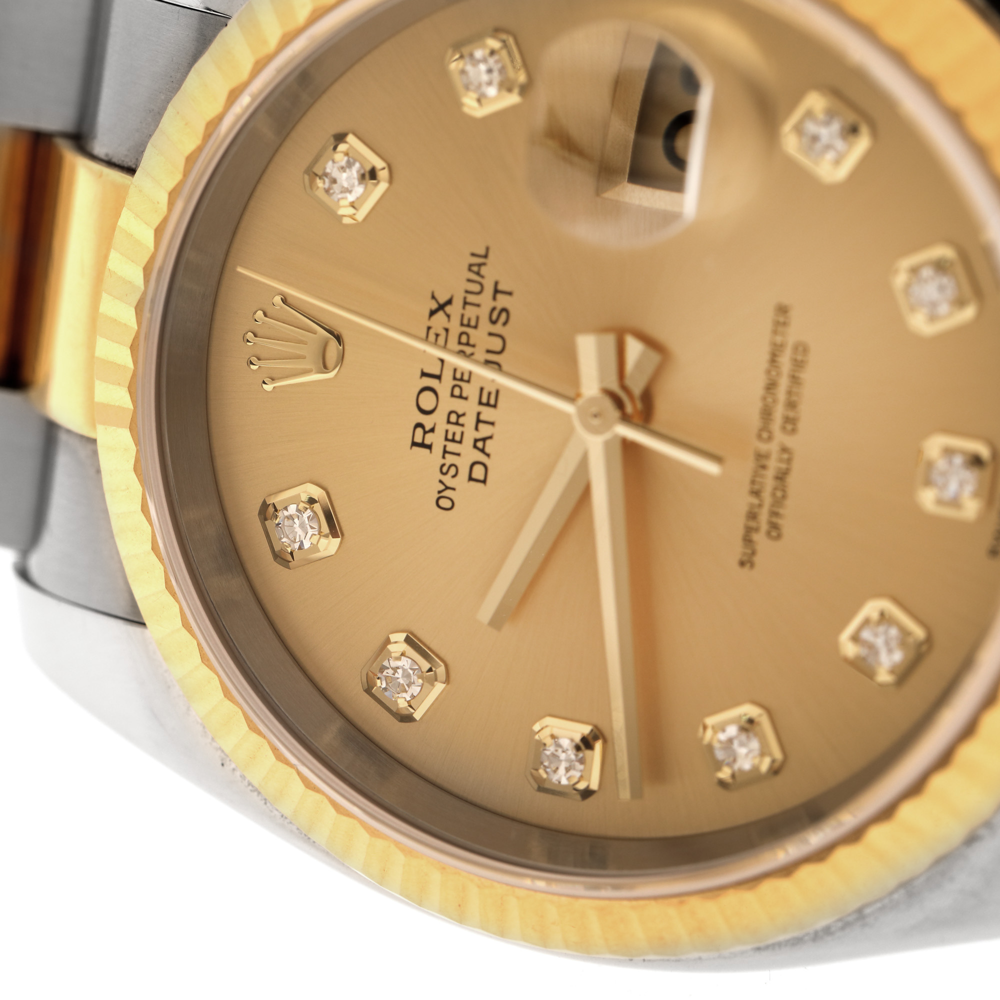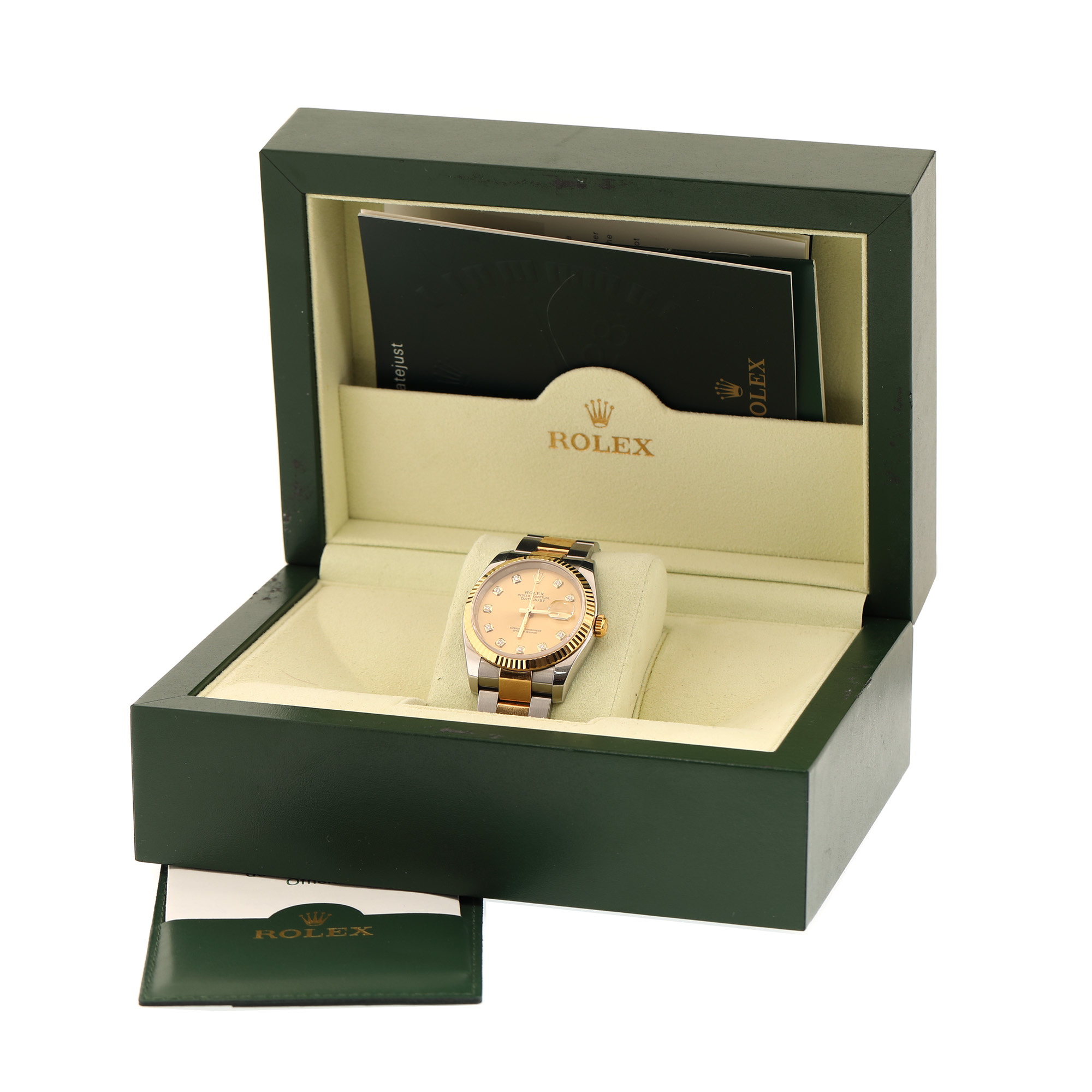 50. Ceas Rolex Datejust, din aur și oțel, decorat cu diamante, de mână, unisex, vine însoțit de actele de proveniență și cutia originală