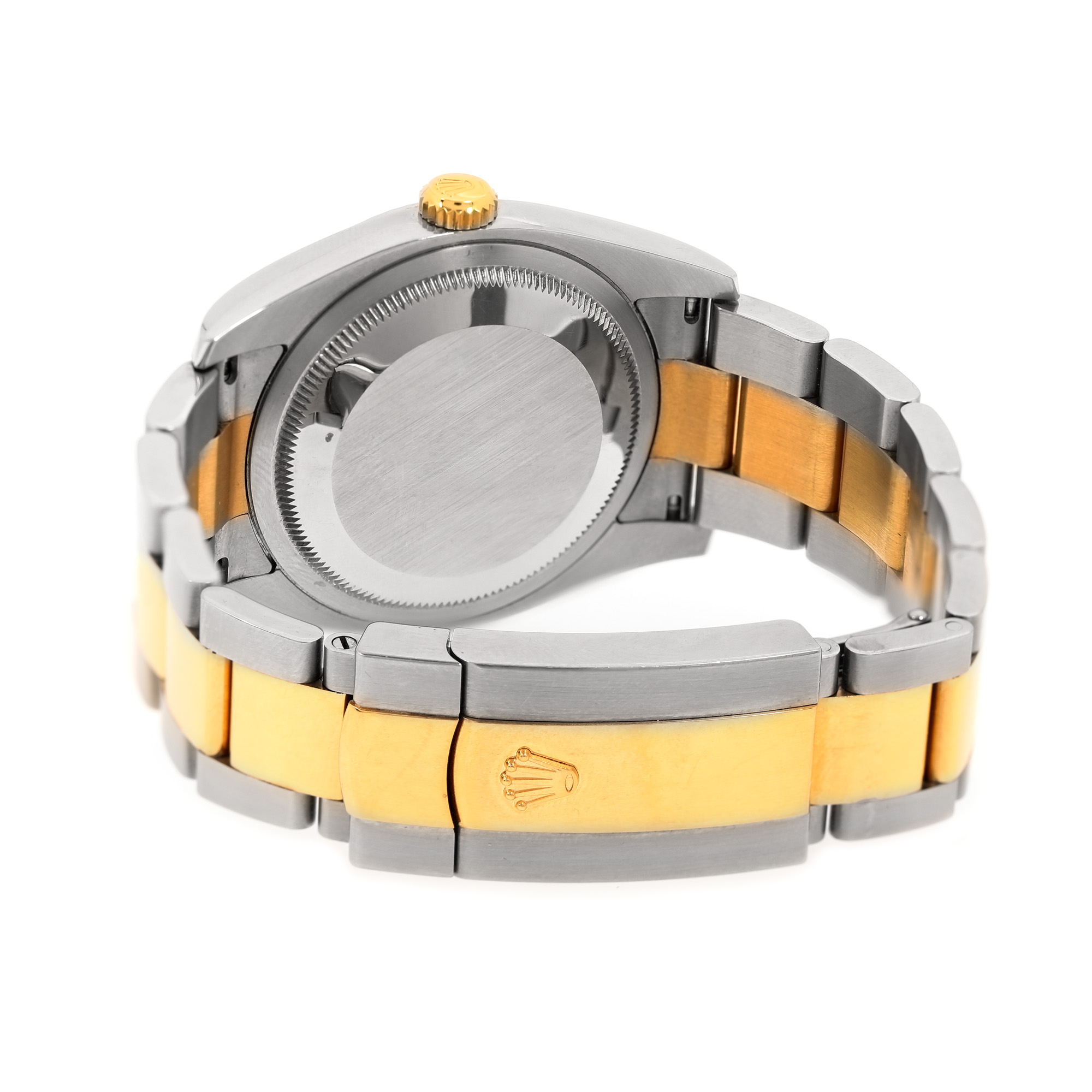 Ceas Rolex Datejust, din aur și oțel, decorat cu diamante, de mână, unisex, referință 116233. Mecanism automatic, calibrul 3135. Cadran de culoare auriu, indici diamante, registru pentru dată, cu lupă, în dreptul orei 3. Brățară originală, din aur și oțel, cu sistem de închidere de tip deployant. Accesorii: cutie originală, acte de proveniență.