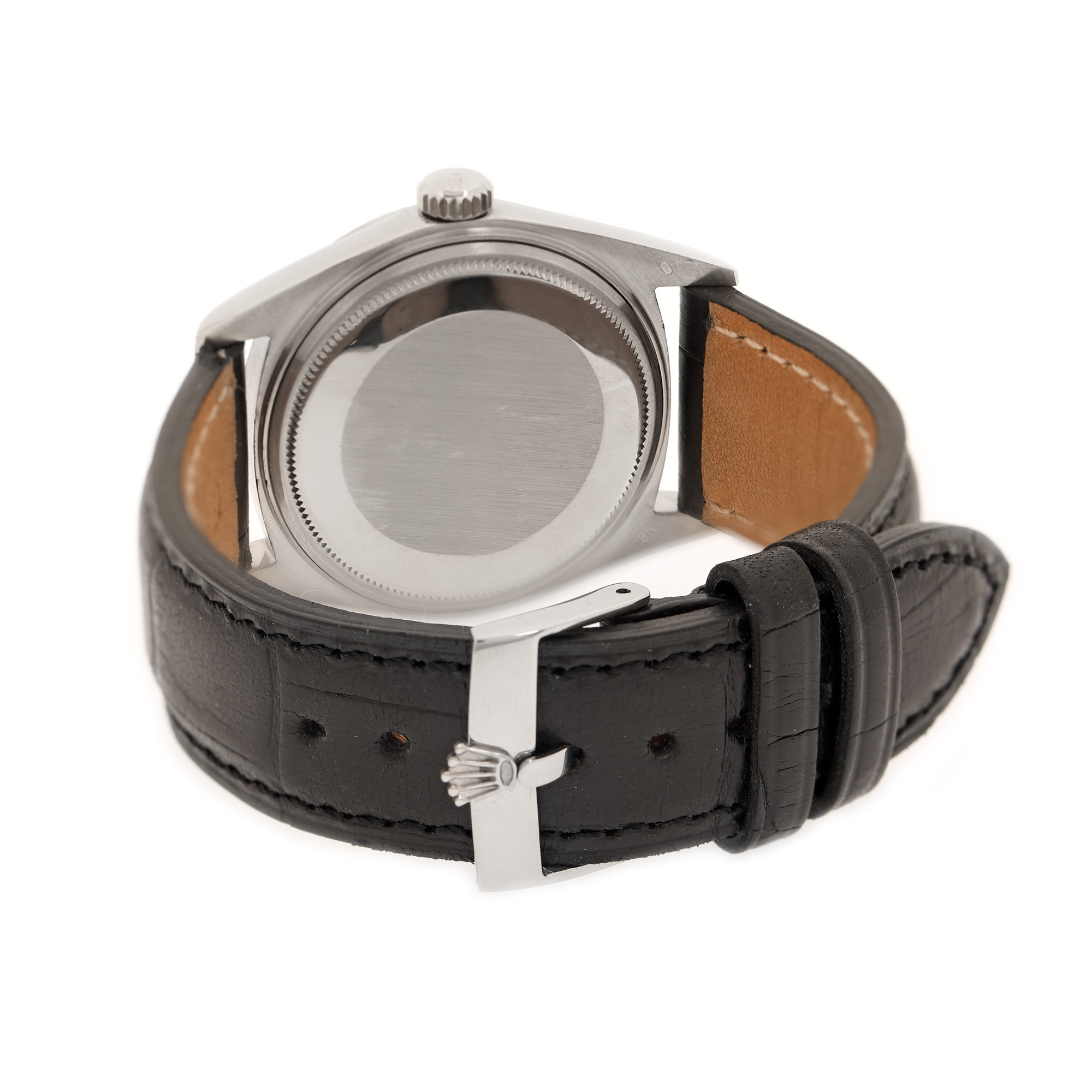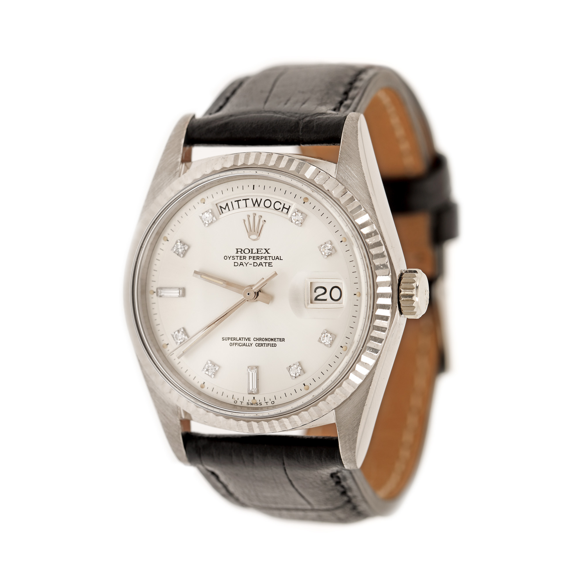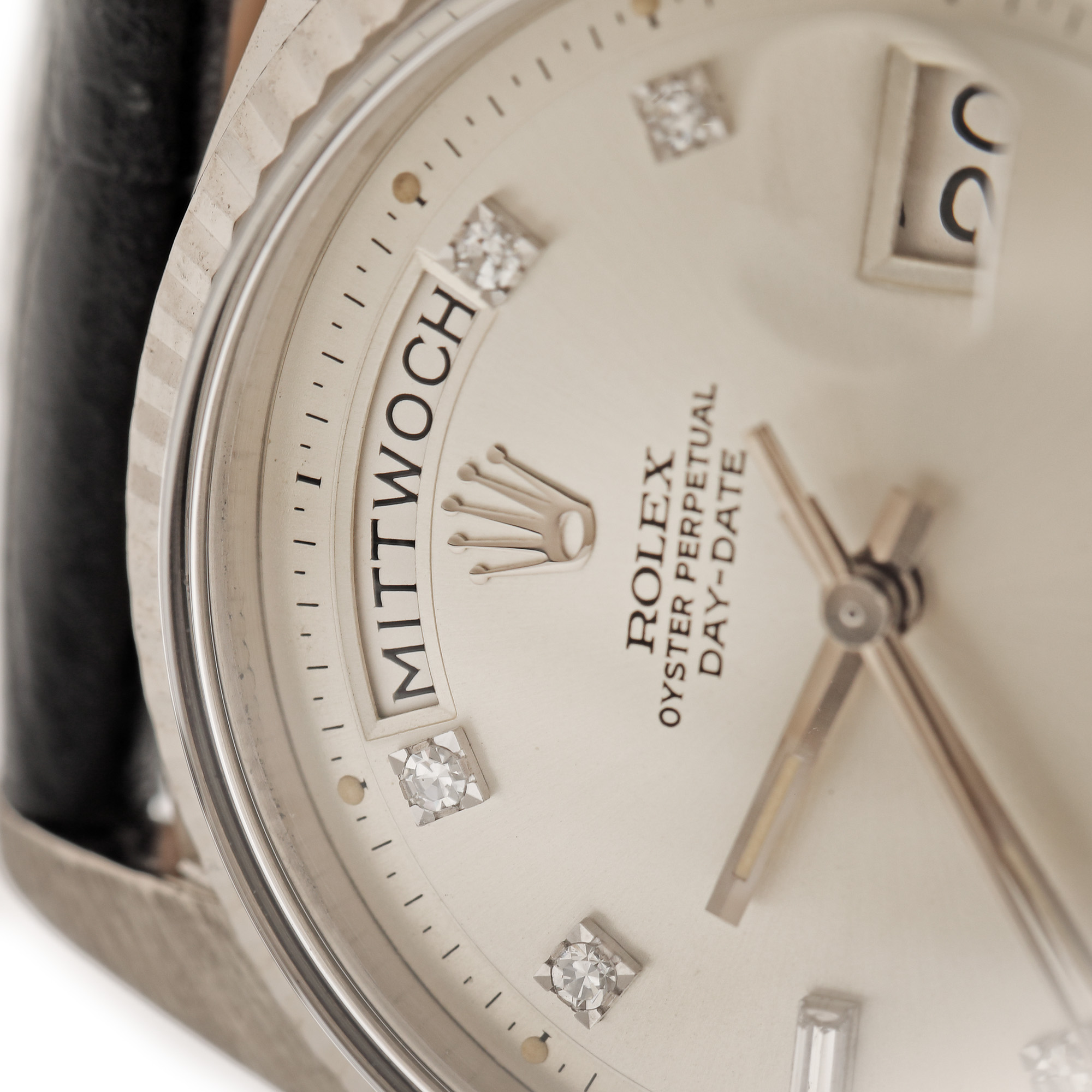 Ceas Rolex DayDate, din aur, cu diamante, de mână, bărbătesc, referință 1803/9. Mecanism automatic. Cadran de culoare argintiu, cu indici diamante, registru pentru dată, cu lupă, în dreptul orei 3, registru pentru ziua săptămânii în dreptul orei 12. Curea din piele, de culoare neagră, cu sistem de închidere clasic.