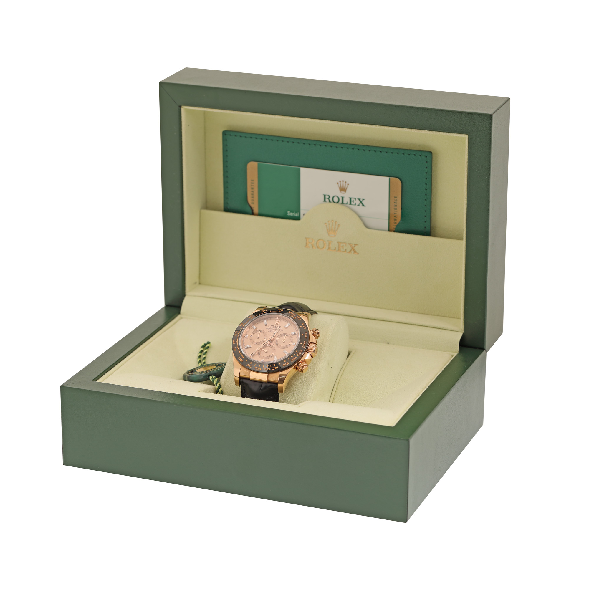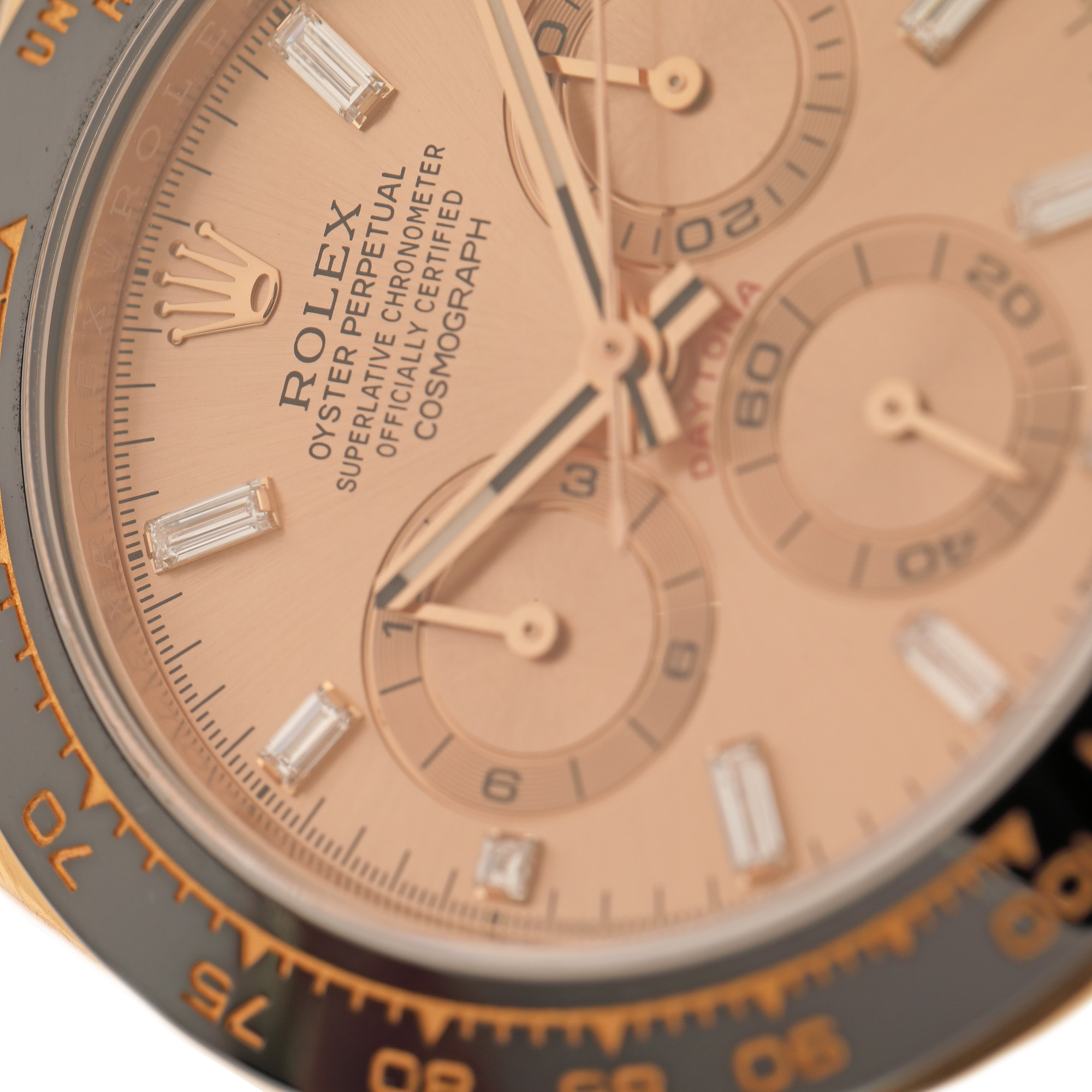 Ceas Rolex Daytona, din aur, cu diamante, de mână, bărbătesc, referință 116515LN. Mecanism automatic, cu funție chronograph. Cadran de culoare auriu, cu indici diamante, cu două registre pentru chronograph în dreptul orelor 3 și 9, registru pentru secundar în dreptul orei 6. Accesorii: cutia originală, card de garanție.