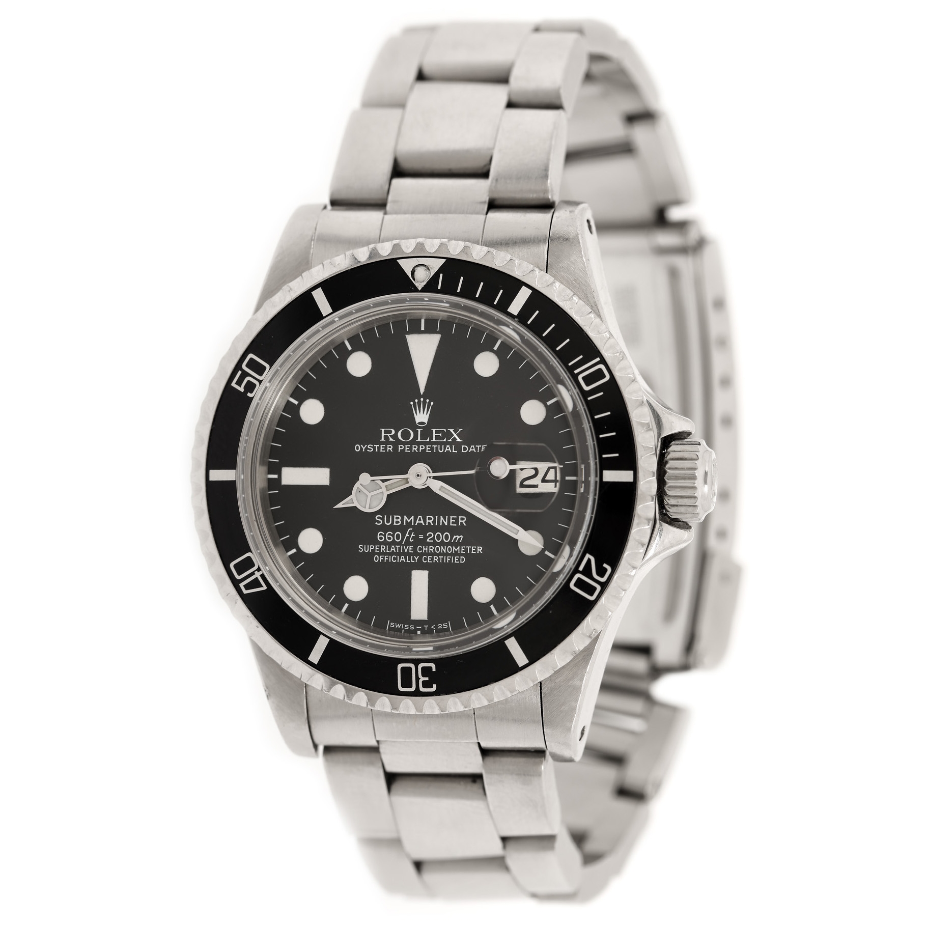 Ceas Rolex Submariner Date, de mână, bărbătesc, referință 1680. Mecanism automatic, calibrul 1570 cu 26 de rubine, bezel rotativ, unidirecțional. Cadran de culoare negru, indici luminiscenți, registru cu lupă pentru dată în dreptul orei 3. Brățară originală cu sistem de închidere de tip deployant.