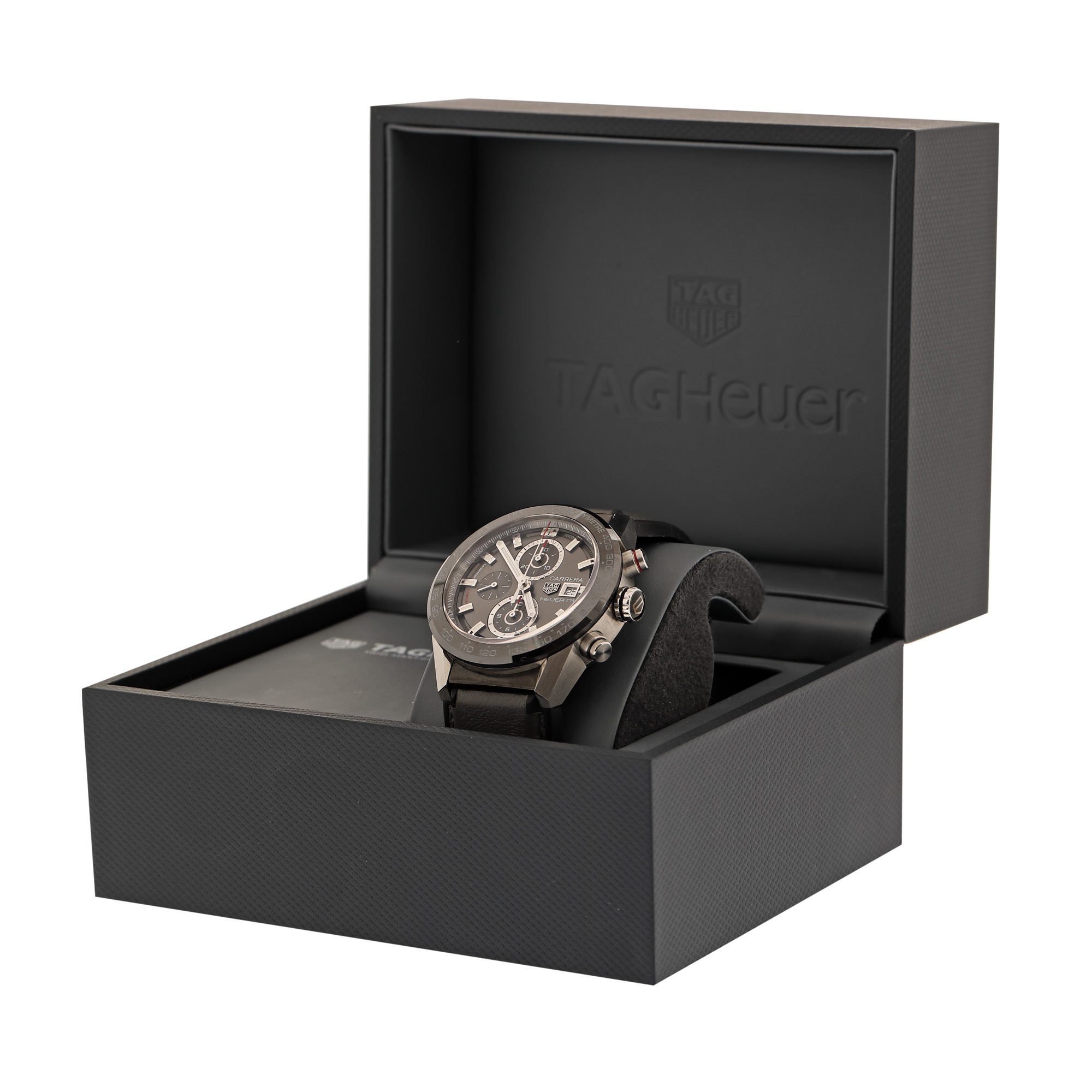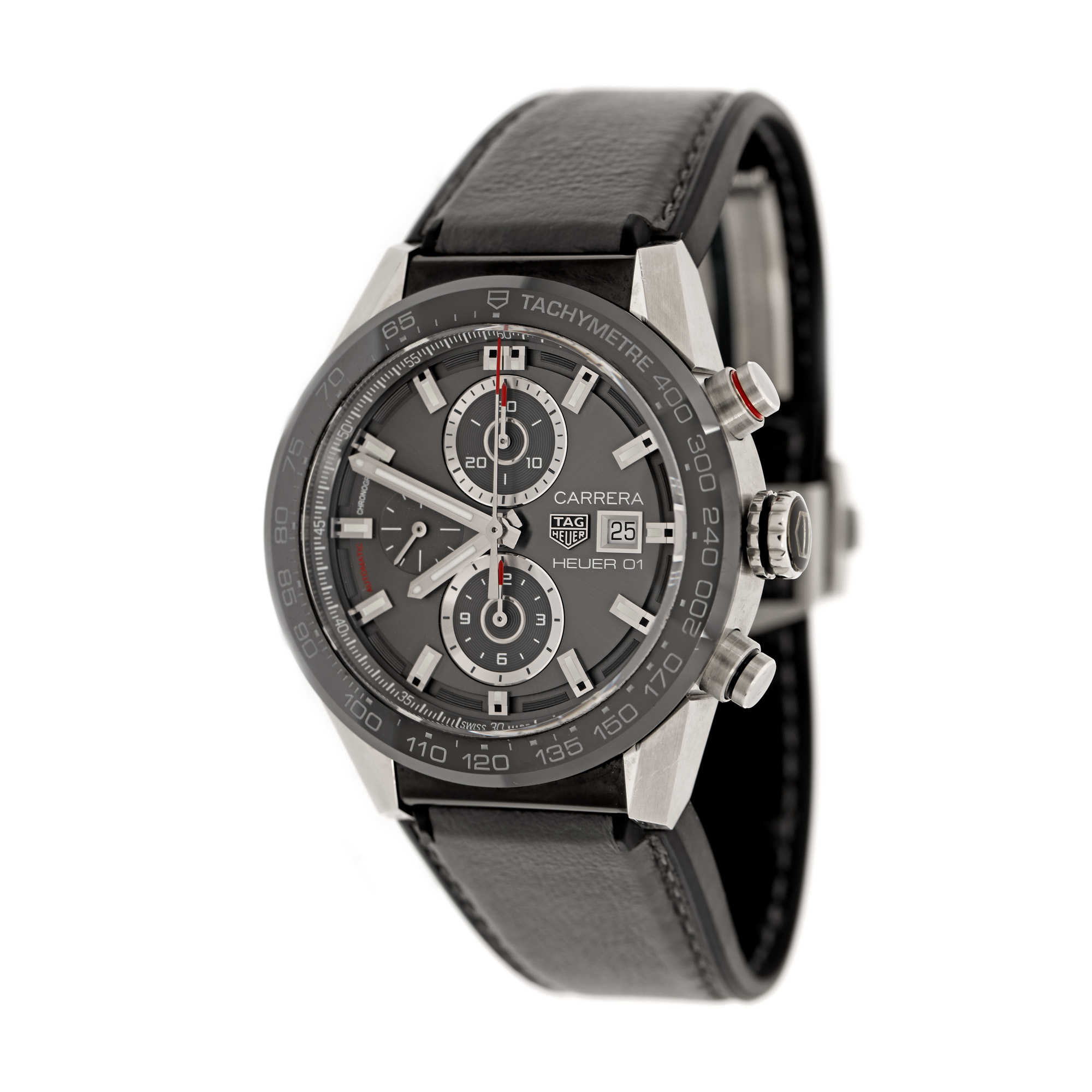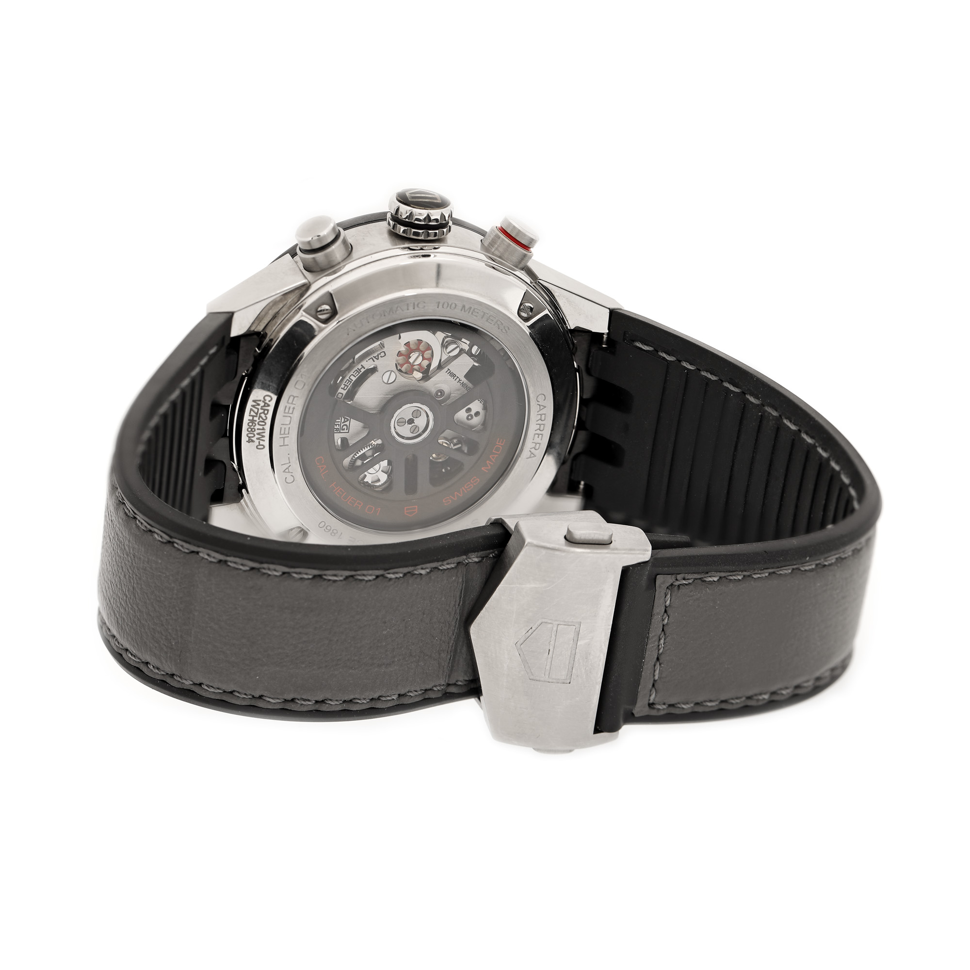 Ceas Tag Heuer Carrera, de mână, bărbătesc, referință CAR201W-0. Mecanism automatic, calibrul Heuer 01, cu 39 de rubine, cu funcție de chronograph, anterior vitrat. Bezel ceramic, gradat tahimetru. Cadran de culoare gri închis, cu două registre pentru chronograph în dreptul orelor 6 și 12, cu registru pentru secundar în dreptul orei 9, cu registru pentru dată în dreptul orei 3. Curea originală, din silicon și piele, de culoare gri, cu sistem de închidere de tip deployant original. Accesorii: cutia originală.