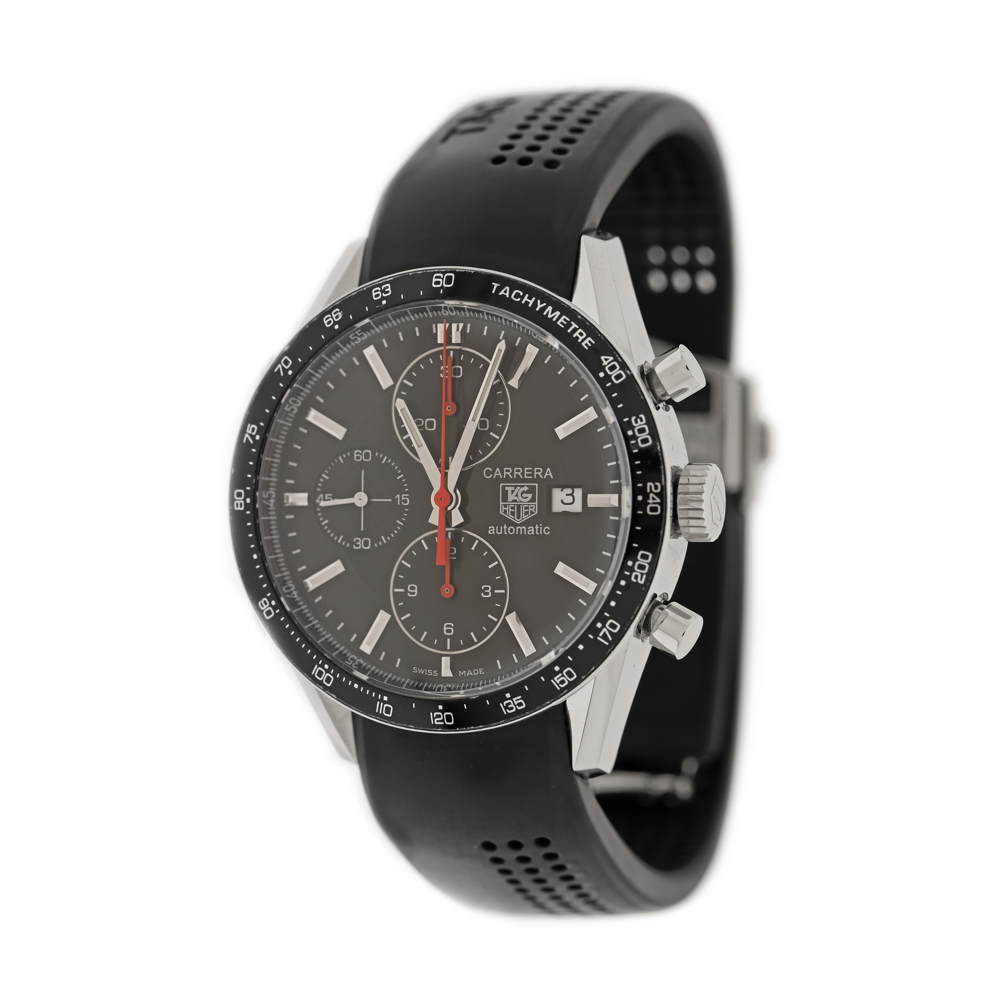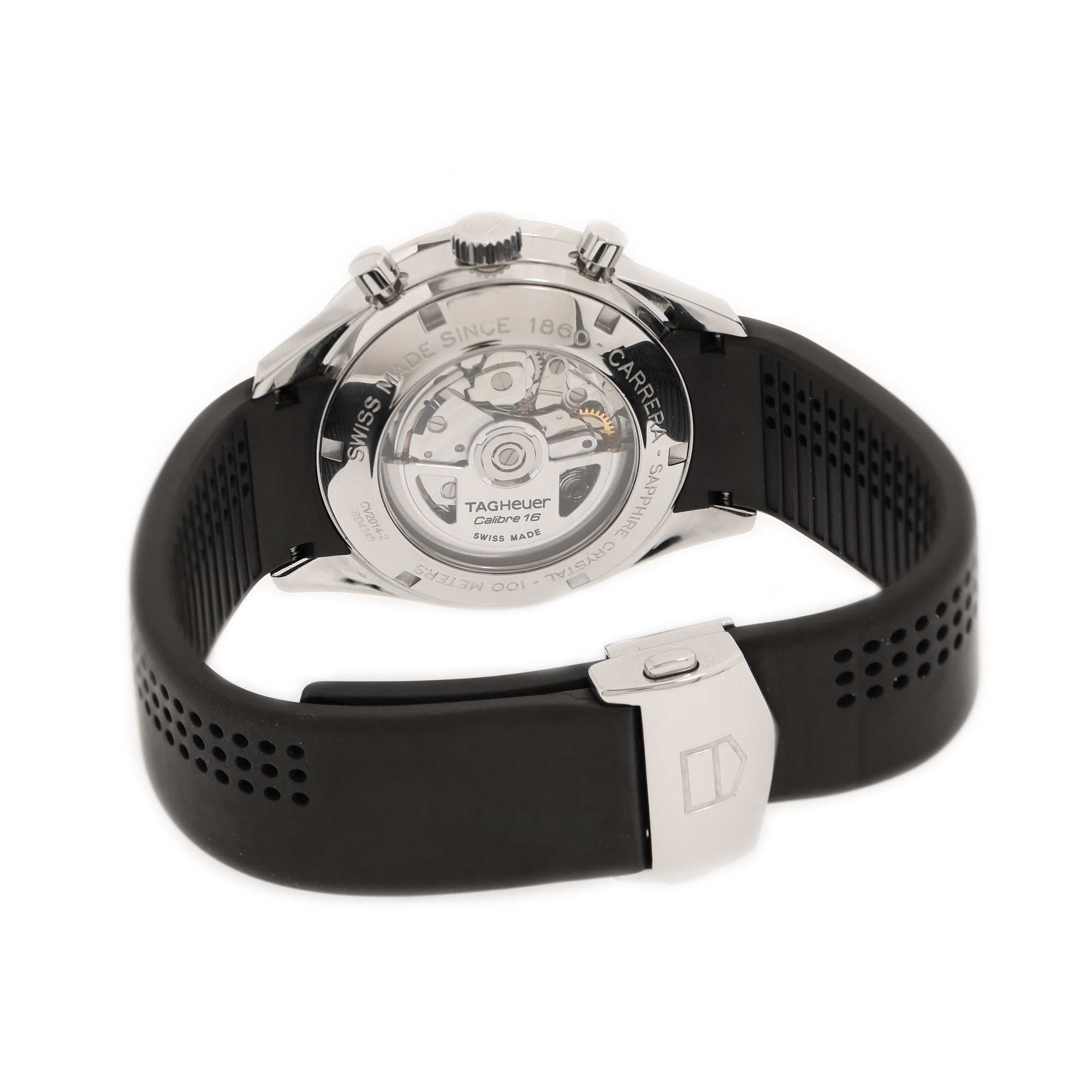 Ceas Tag Heuer Carrera, de mână, bărbătesc, referință CV2014-2. Mecanism automatic, calibrul 16, cu funcție chronograph, anterior vitrat. Cadran de culoare negru, cu indici baghete luminiscente, cu două registre pentru chronograph în dreptul orelor 6 și 12, cu registru pentru secundar în dreptul orei 9 și registru pentru dată în dreptul orei 3. Curea originală din silicon cu sistem de prindere de tip deployant, original.