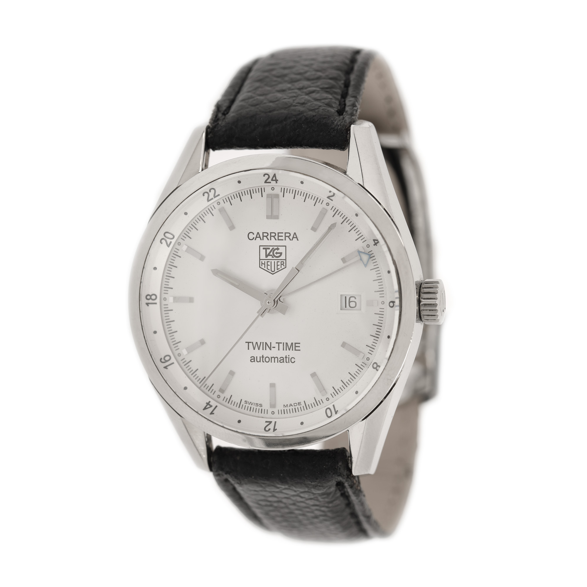 Ceas Tag Heuer Carrera Twin Time, de mână, bărbătesc. Mecanism automatic, cu funcție GMT. Cadran de culoare alb, indici baghete, registru pentru dată în dreptul orei 3. Curea din piele, de culoare neagră.