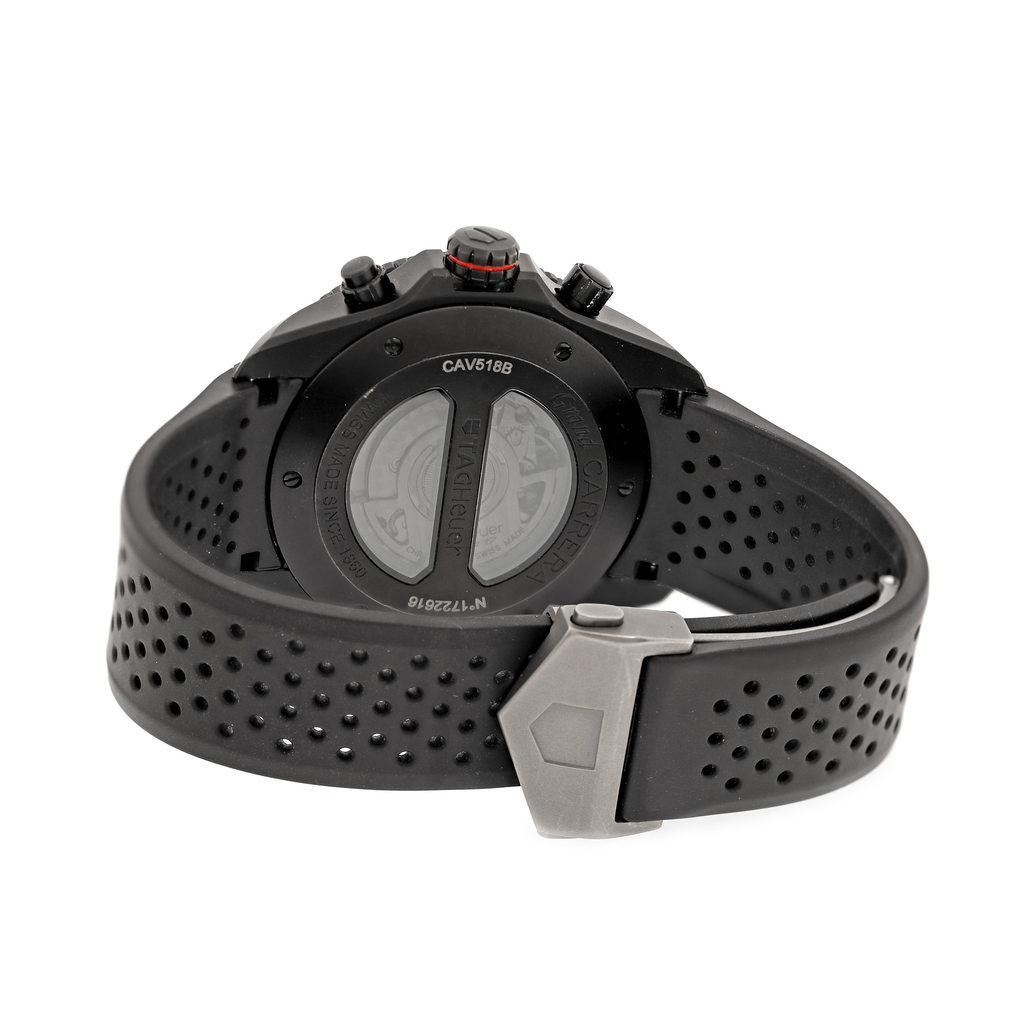Ceas Tag Heuer Grand Carrera Calibre17 RS2,din titan, de mână, bărbătesc, referință CAV518B. Mecanism automatic, calibrul 17 RS-2 bazat pe ETA 2894-2, cu funcție de chronograph, anterior vitrat. Cadran de culoare negru, indici baghete, cu registru pentru chronograph în dreptul orei 9, registru pentru secundar în dreptul orei 3, registru pentru dată în dreptul orei 6. Curea originală, din cauciuc, de culoare neagră, cu sistem de închidere de tip deployant. Accesorii: cutia originală și card de garanție datat 20.06.2021.