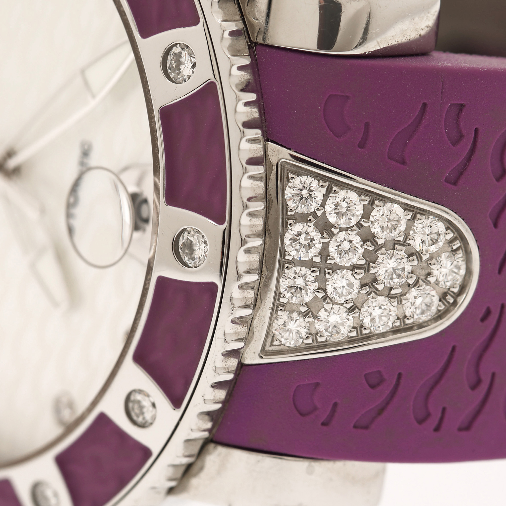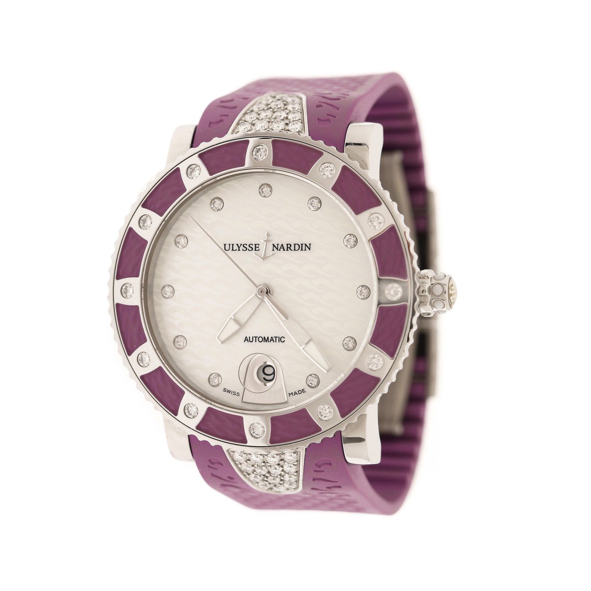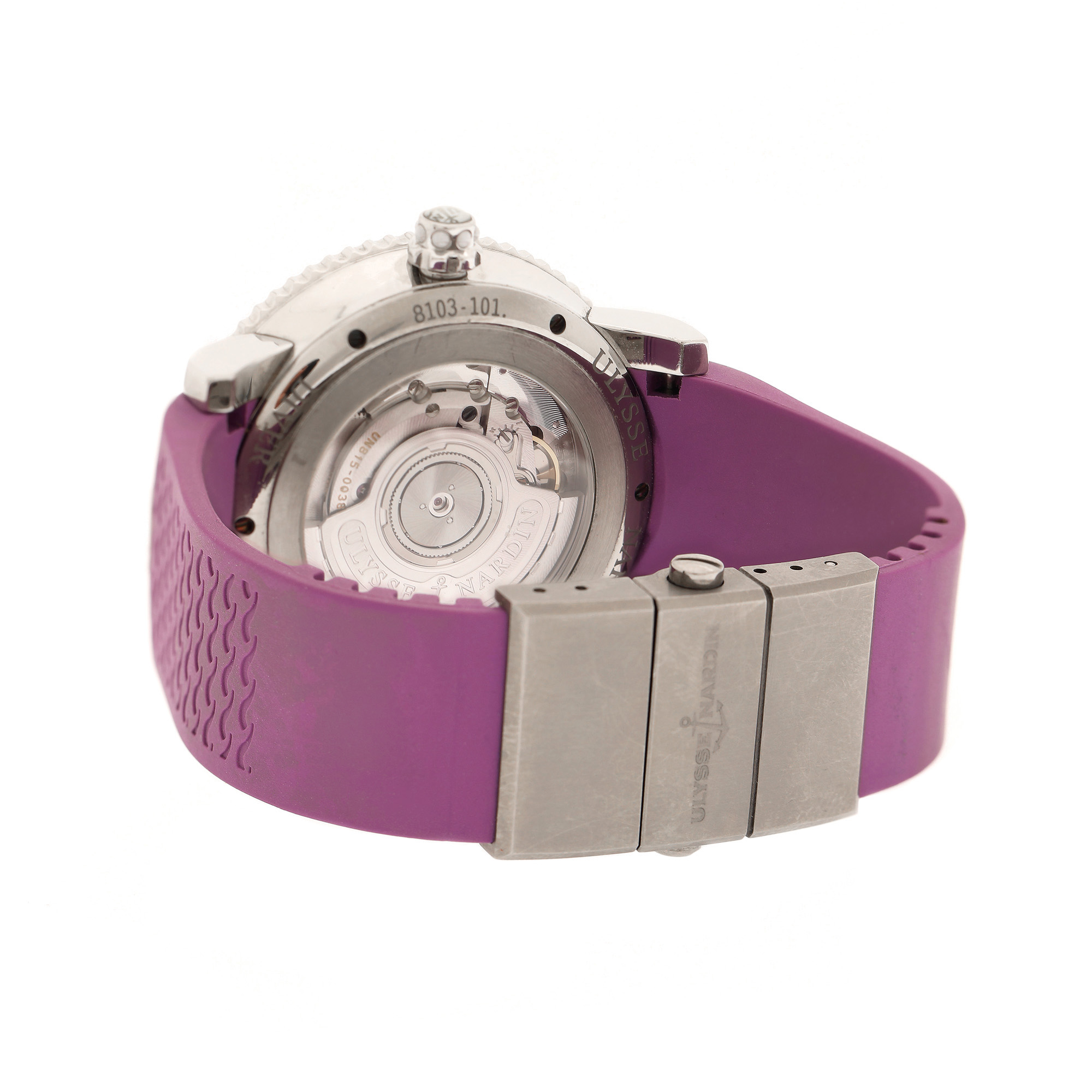 Ceas Ulysse Nardin Lady Diver, din titan și oțel, cu diamante, de mână, de damă, referință 8103-101. Mecanism automatic, calibrul UN815, cu 25 de rubine, anterior vitrat. Cadran din sidef cu indici diamante , ragistru cu lupă pentru dată în dreptul orei 6. Curea originală, din cauciuc, de culoare violet, cu sistem de prindere de tip deployant, original, din titan.