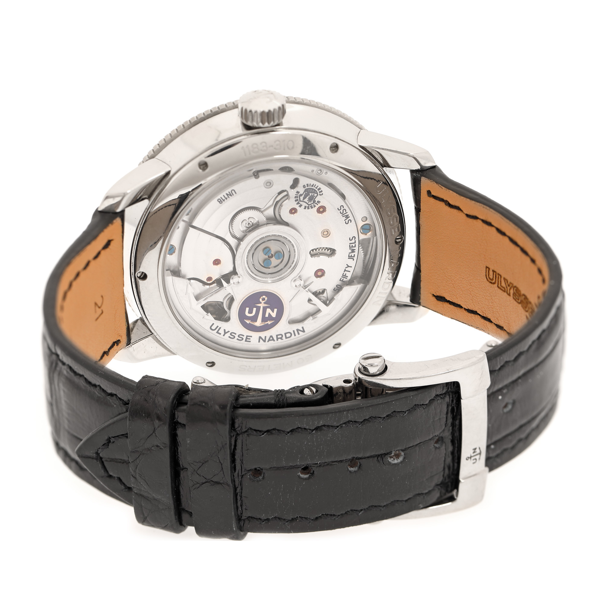 Ceas Ulysse Nardin Marine Torpilleur, de mână, bărbătesc, referință 1183-310. Mecanism automatic, calibrul UN 118, cu 50 de rubine, anterior vitrat. Cadran de culoare gri, indici numerale romane, registru pentru secundar și dată în dreptul orei 6, registru pentru rezerva de putere în dreptul orei 12. curea originală, din piele, de culoare neagră cu sistem de închidere de tip deployant.