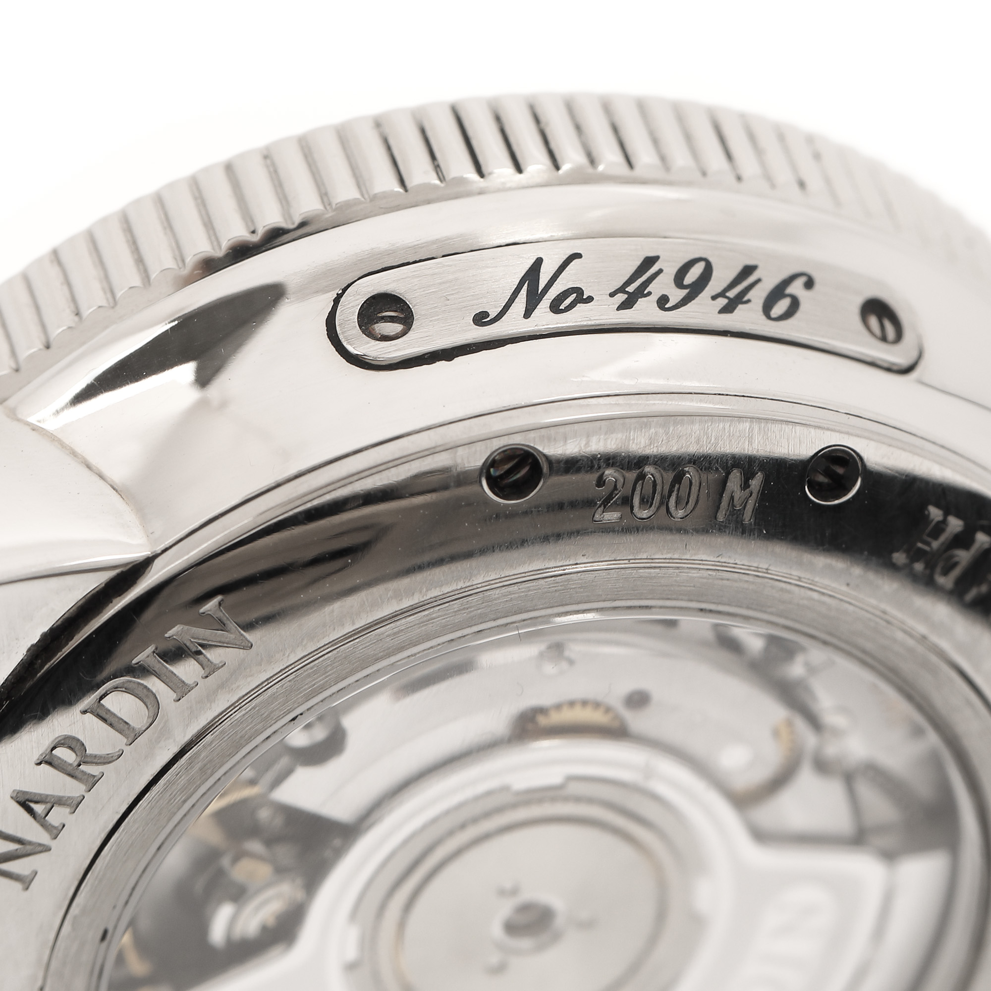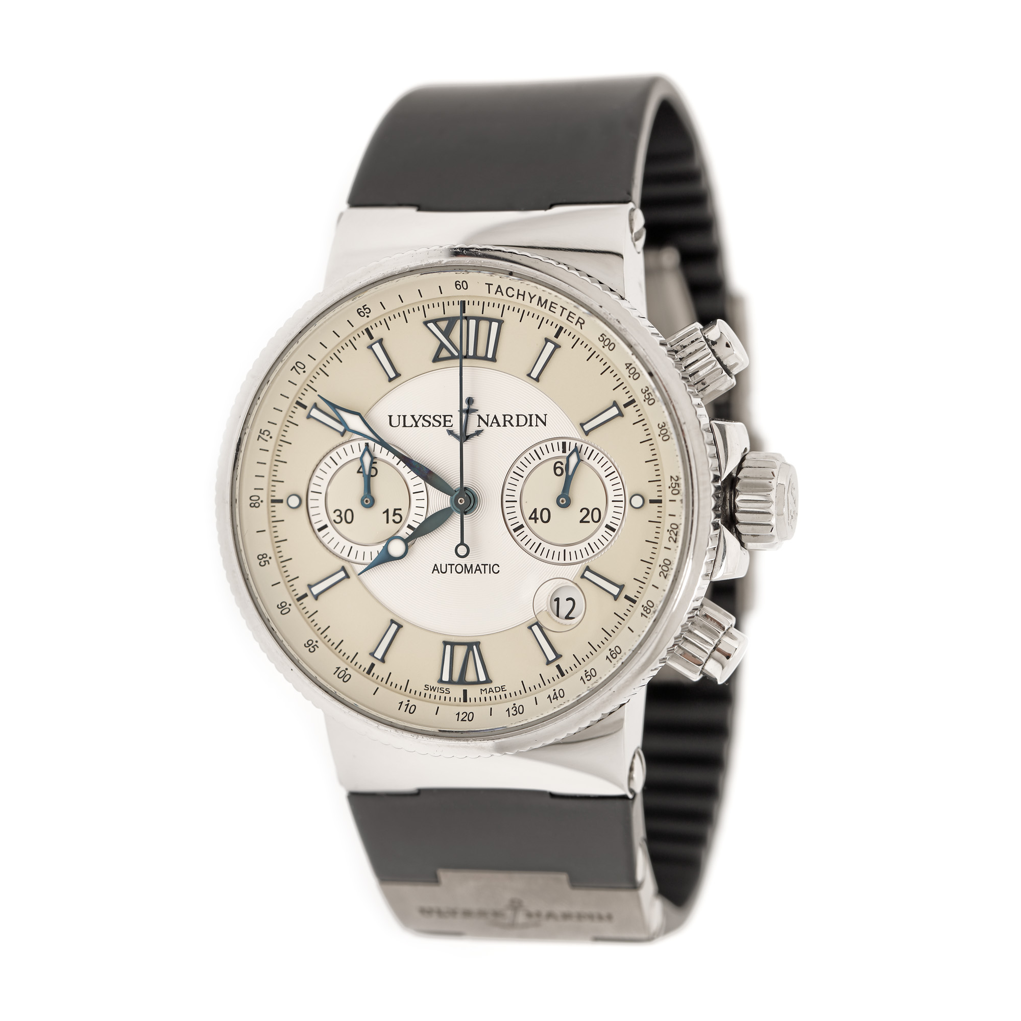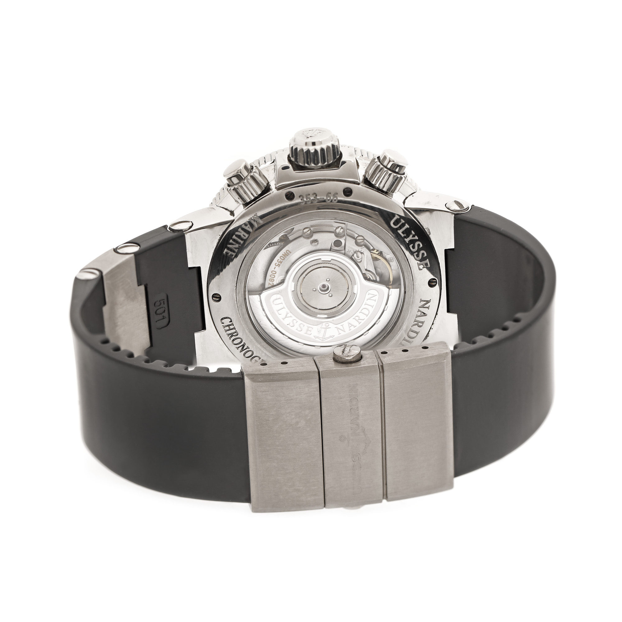 Ceas Ulysse Nardin Maxi Marine Chronograph, de mână, bărbătesc, referință 353-66. Mecanism automatic, cu funcție chronograph. Cadran de culoare crem, cu disc central de culoare gri, cu indici numerale romane, registru pentru chronograph în dreptul orei 9, registru secundar în dreptul orei 3, registru pentru dată poziționat între orele 4 și 5. Curea originală, din cauciuc, de culoare neagră, cu sistem de închidere de tip deployant.