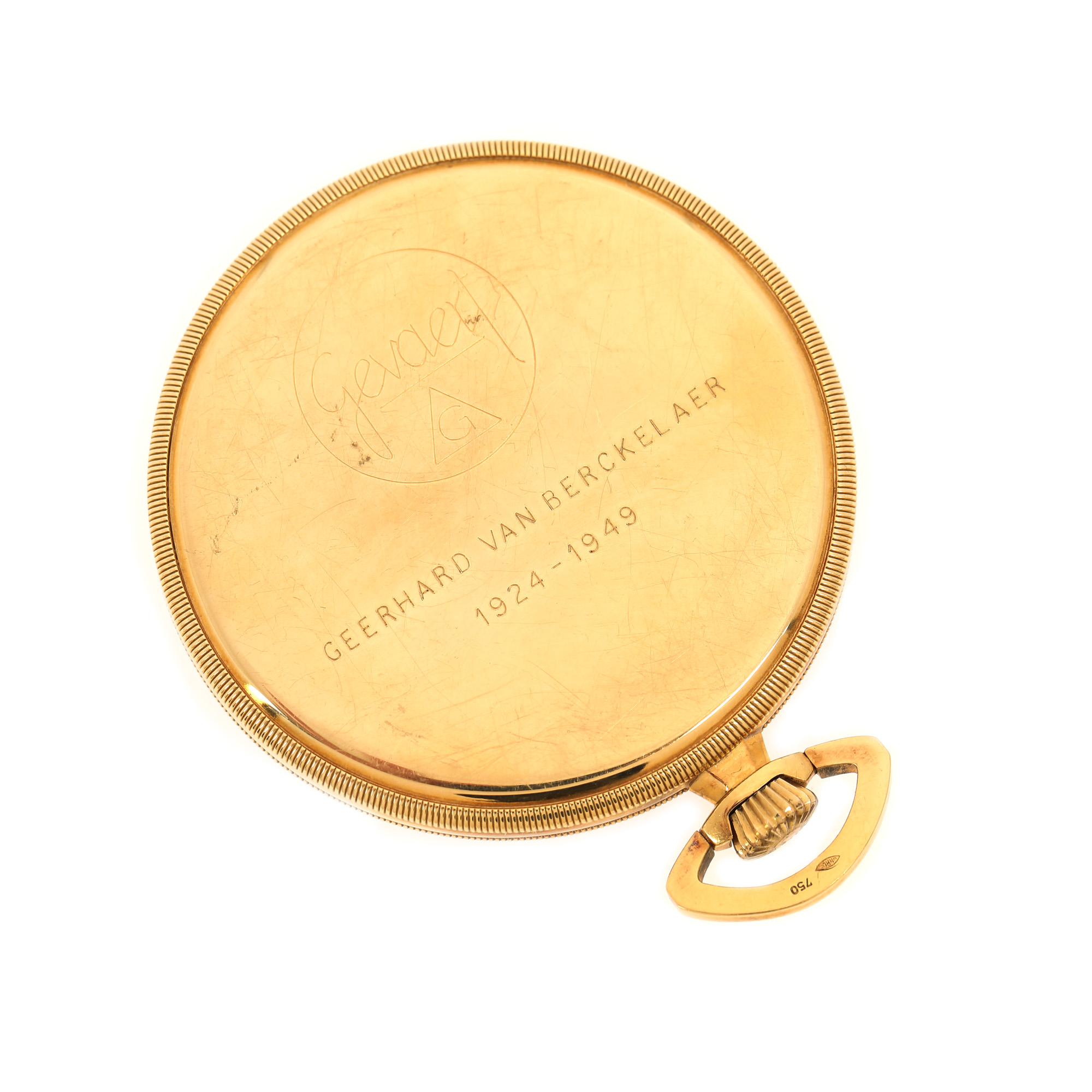 Ceas Zodiac, din aur, de buzunar, bărbătesc. Mecanism cu armare manuală. Cadran de culoare gri, indici numerale arabe doar pentru orele 3, 9 și 12, registru pentru secundar în dreptul orei 6. Anterior gravat "Geeerhard Van Berckelaer 1924-1949"