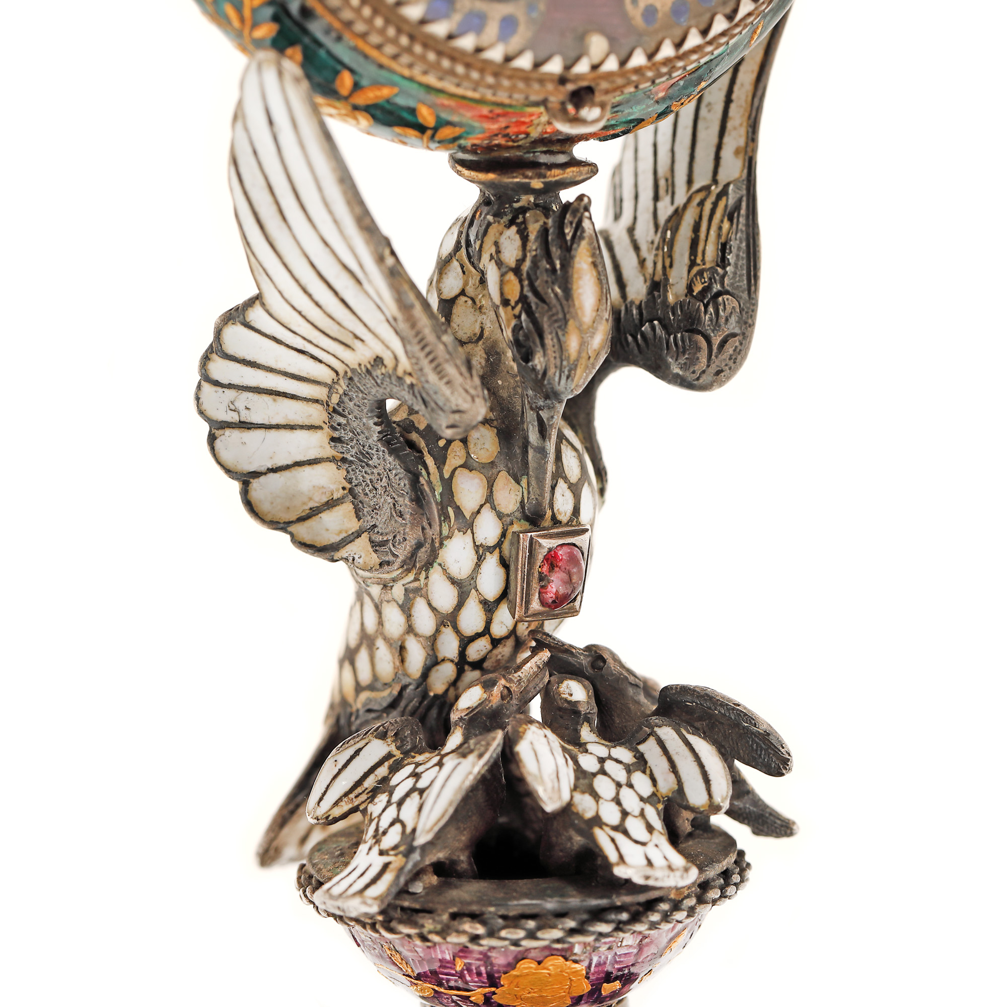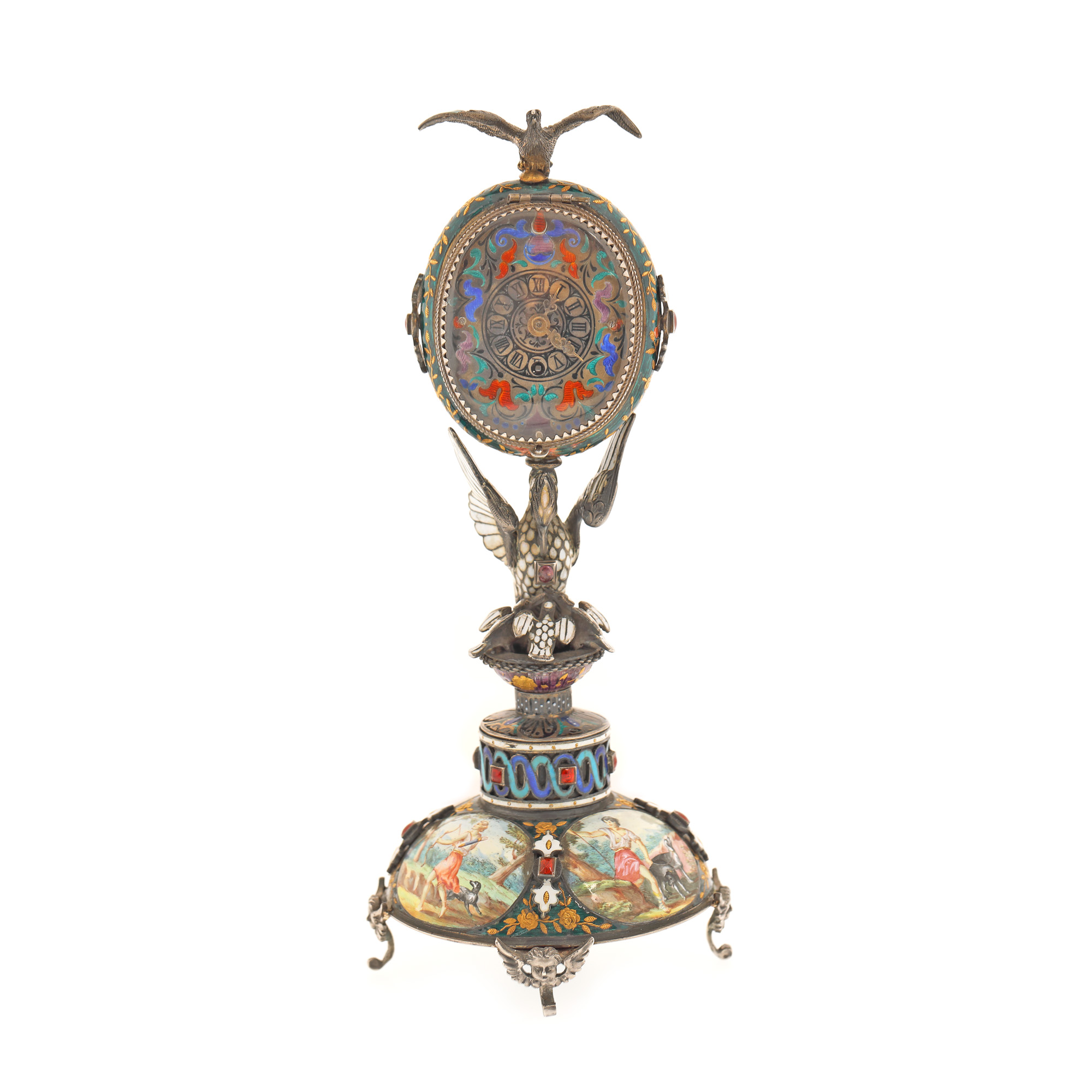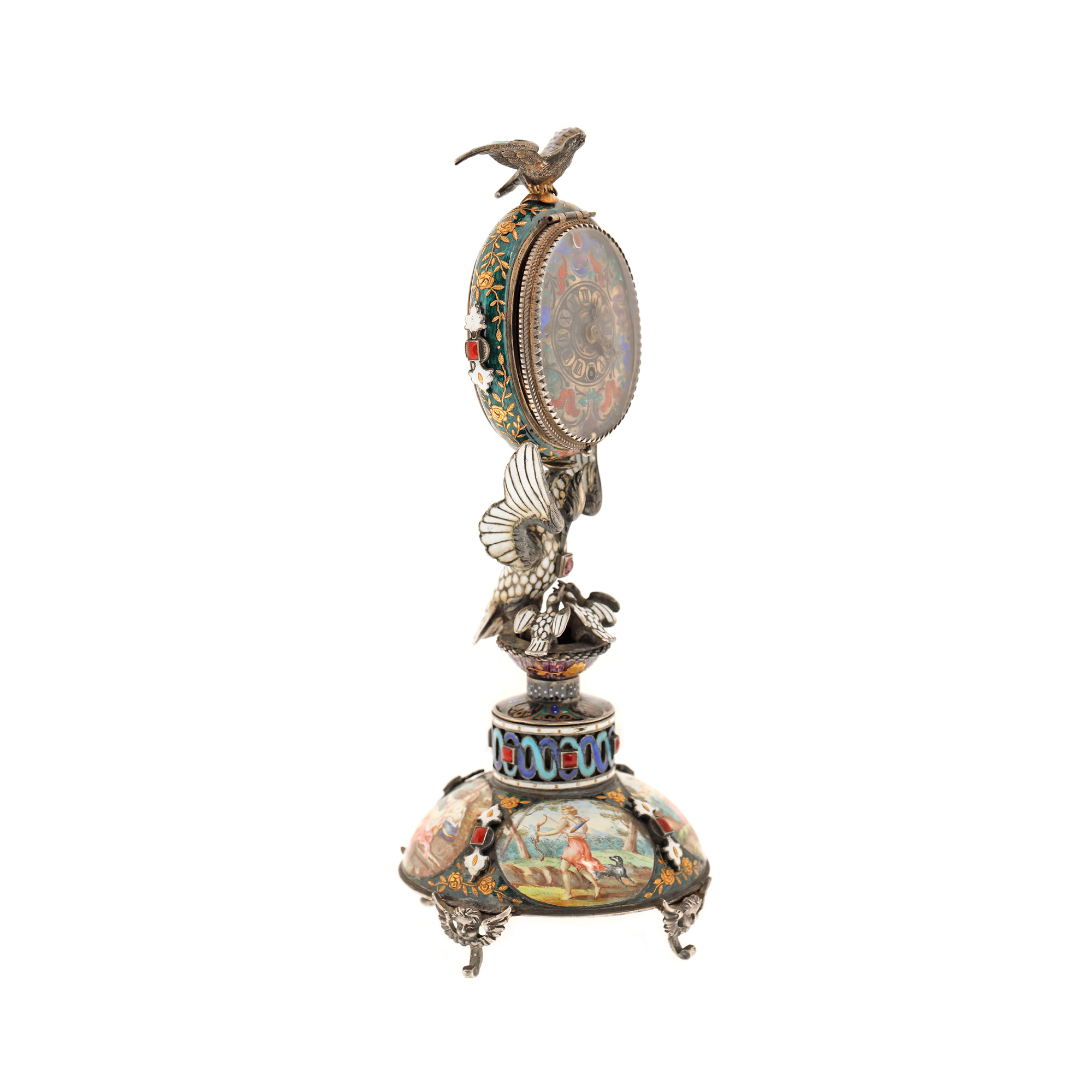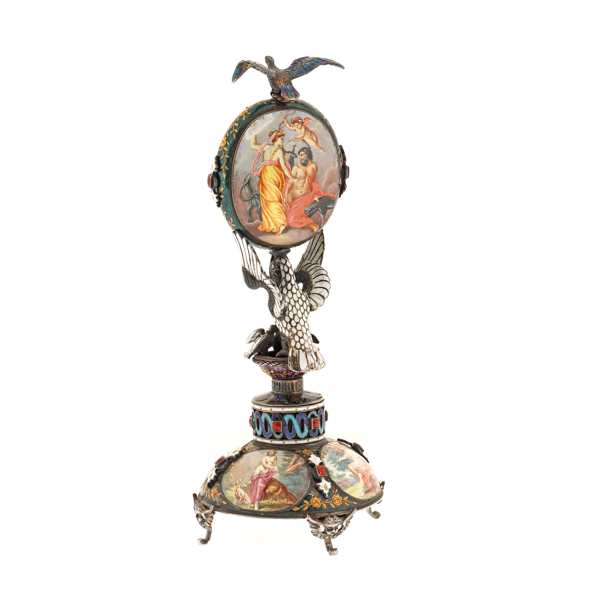 104. "Dragoste și credință" - spectaculoasă operă de ceasornicărie, din argint și email în varii tehnici, pentru birou, cu mecanism Lépine Paris, bogat pictat ori modelat cu motive religioase și mitologice (motivul Răpirii Europei de către Zeus, motivul dragostei între Adonis și Afrodita, legenda pelicanului care își hrănește puii cu sângele pieptului său), cca. 1880