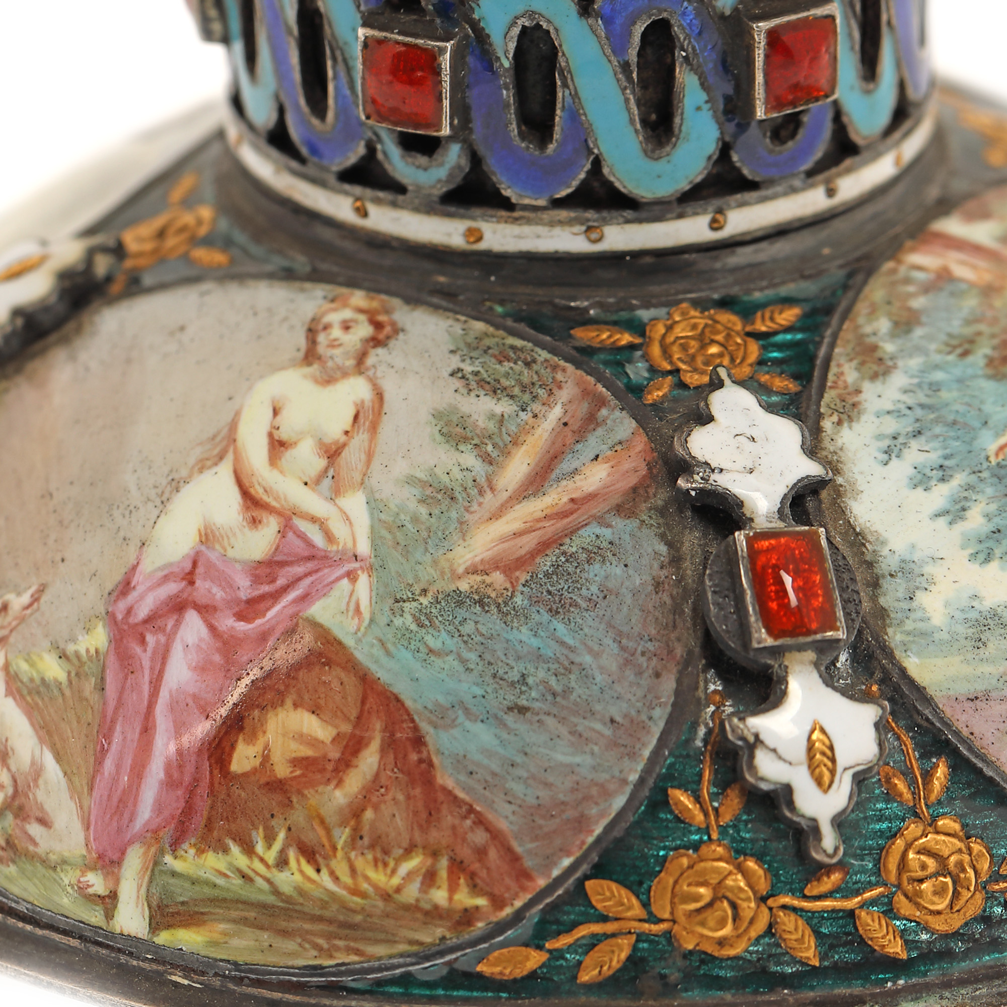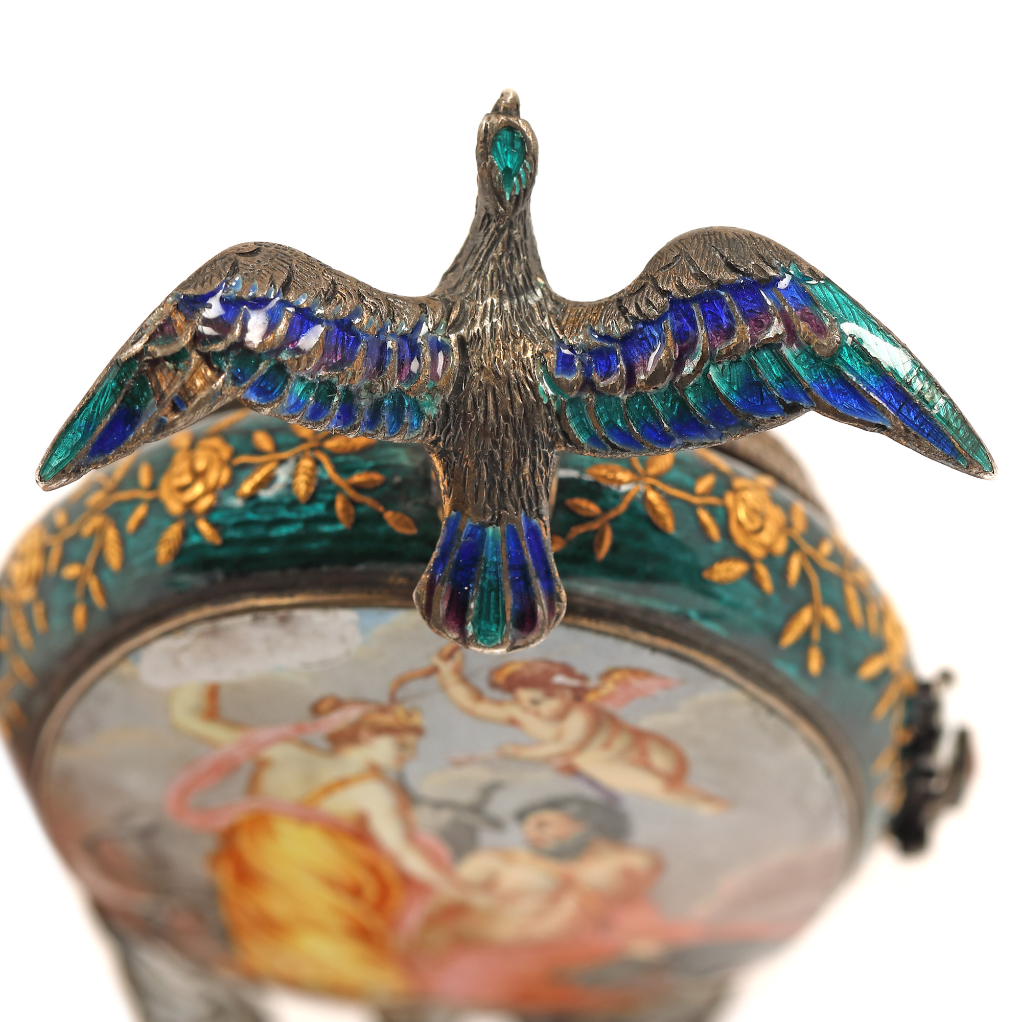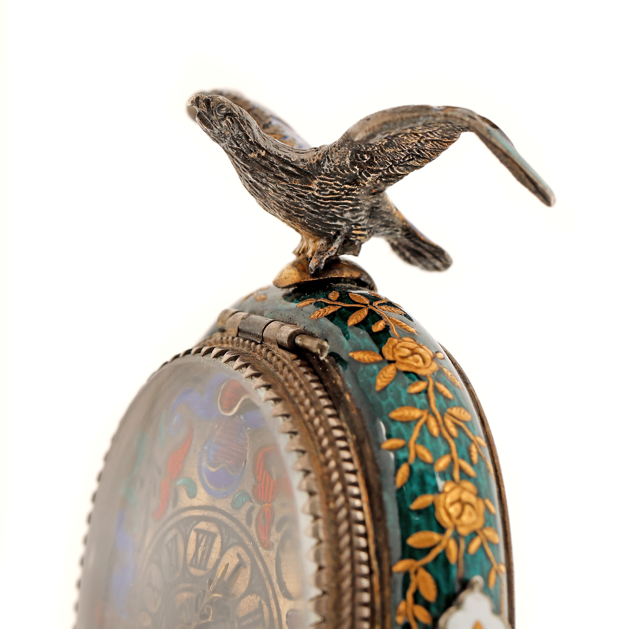 104. "Dragoste și credință" - spectaculoasă operă de ceasornicărie, din argint și email în varii tehnici, pentru birou, cu mecanism Lépine Paris, bogat pictat ori modelat cu motive religioase și mitologice (motivul Răpirii Europei de către Zeus, motivul dragostei între Adonis și Afrodita, legenda pelicanului care își hrănește puii cu sângele pieptului său), cca. 1880
