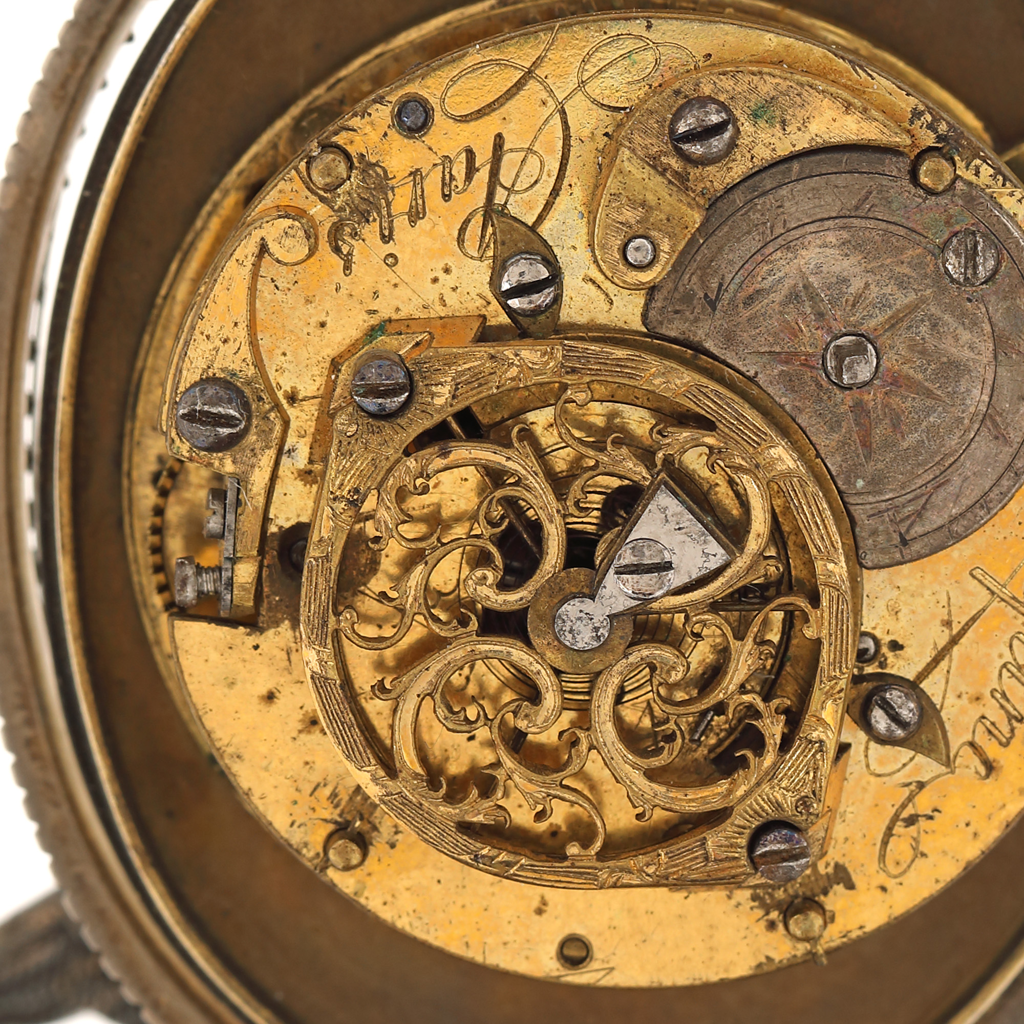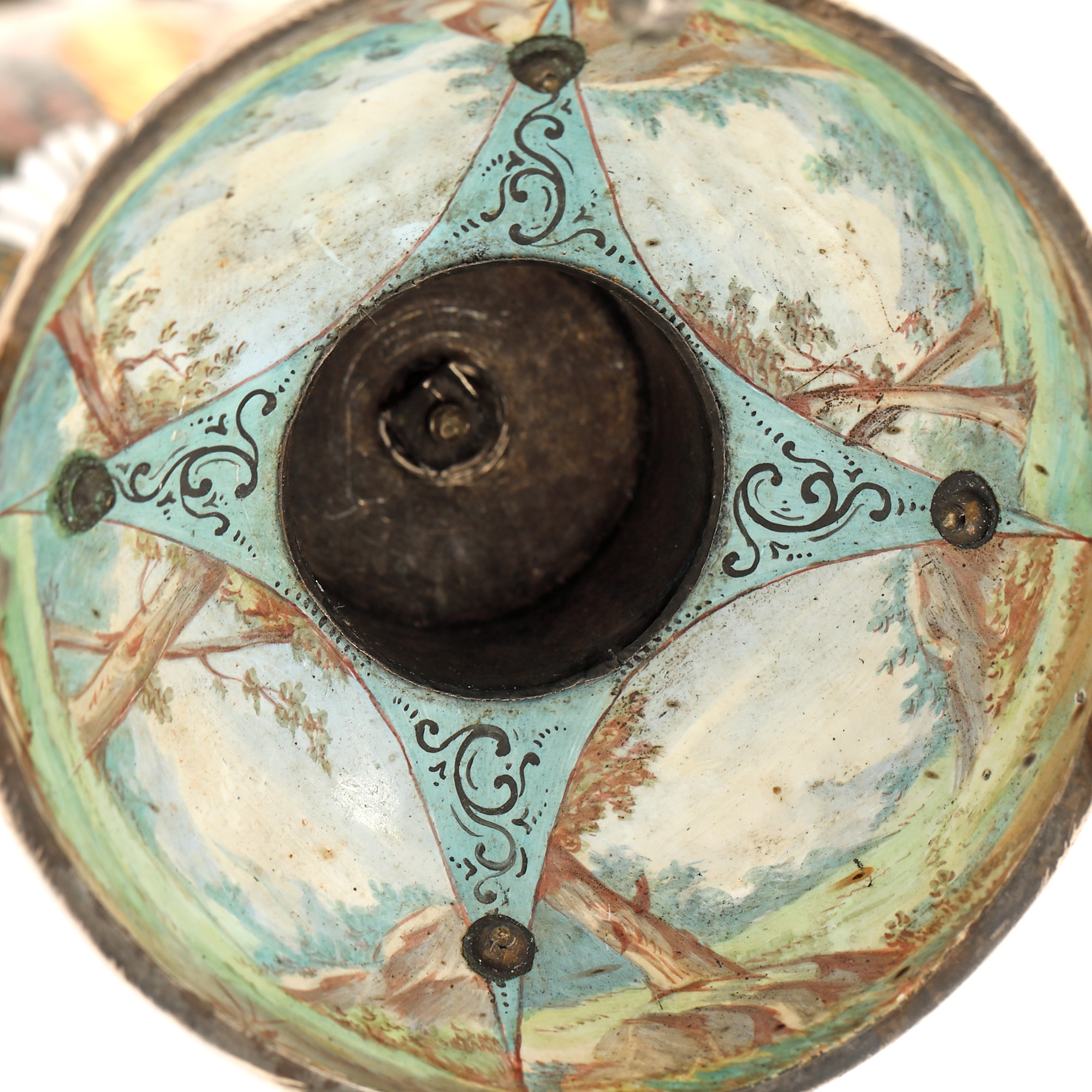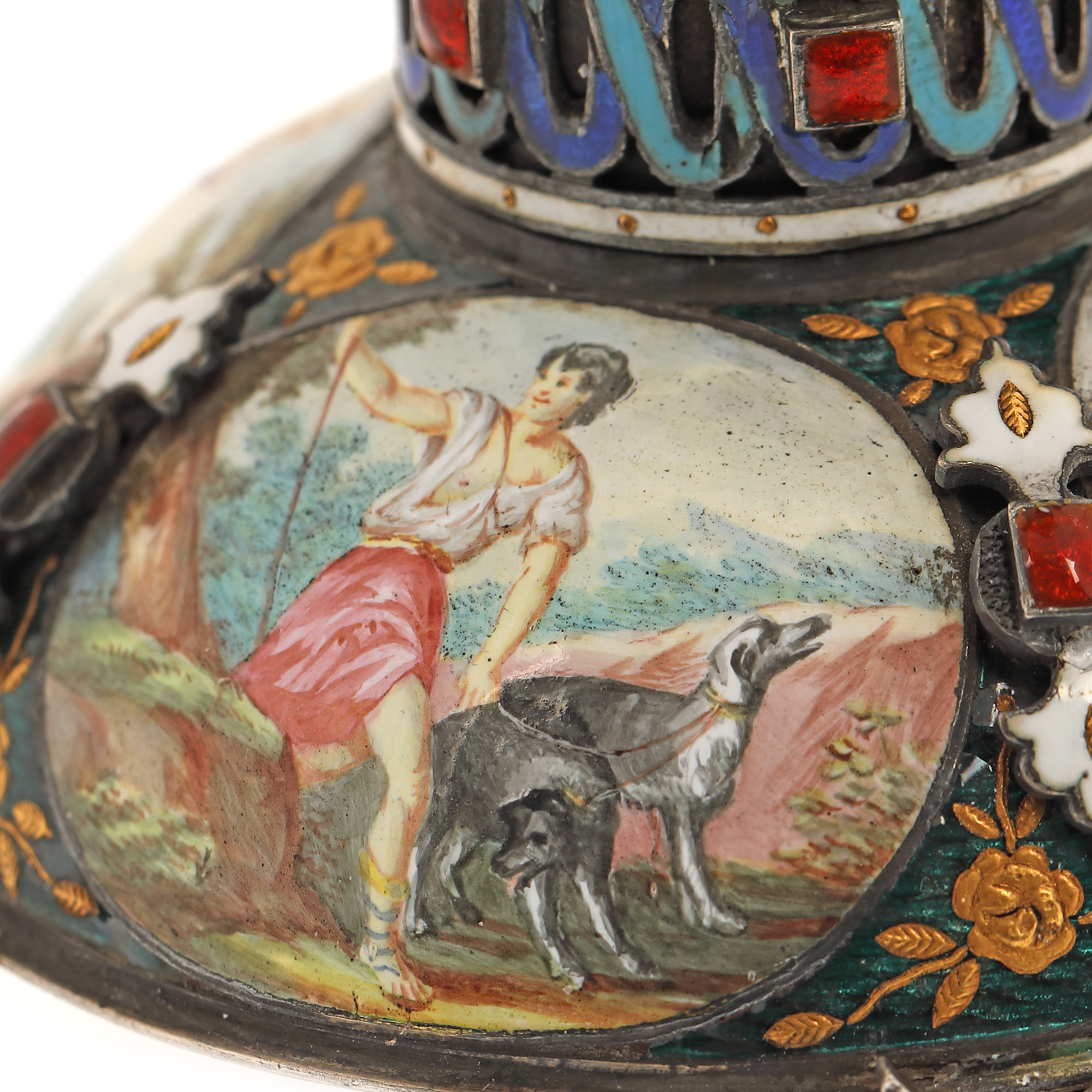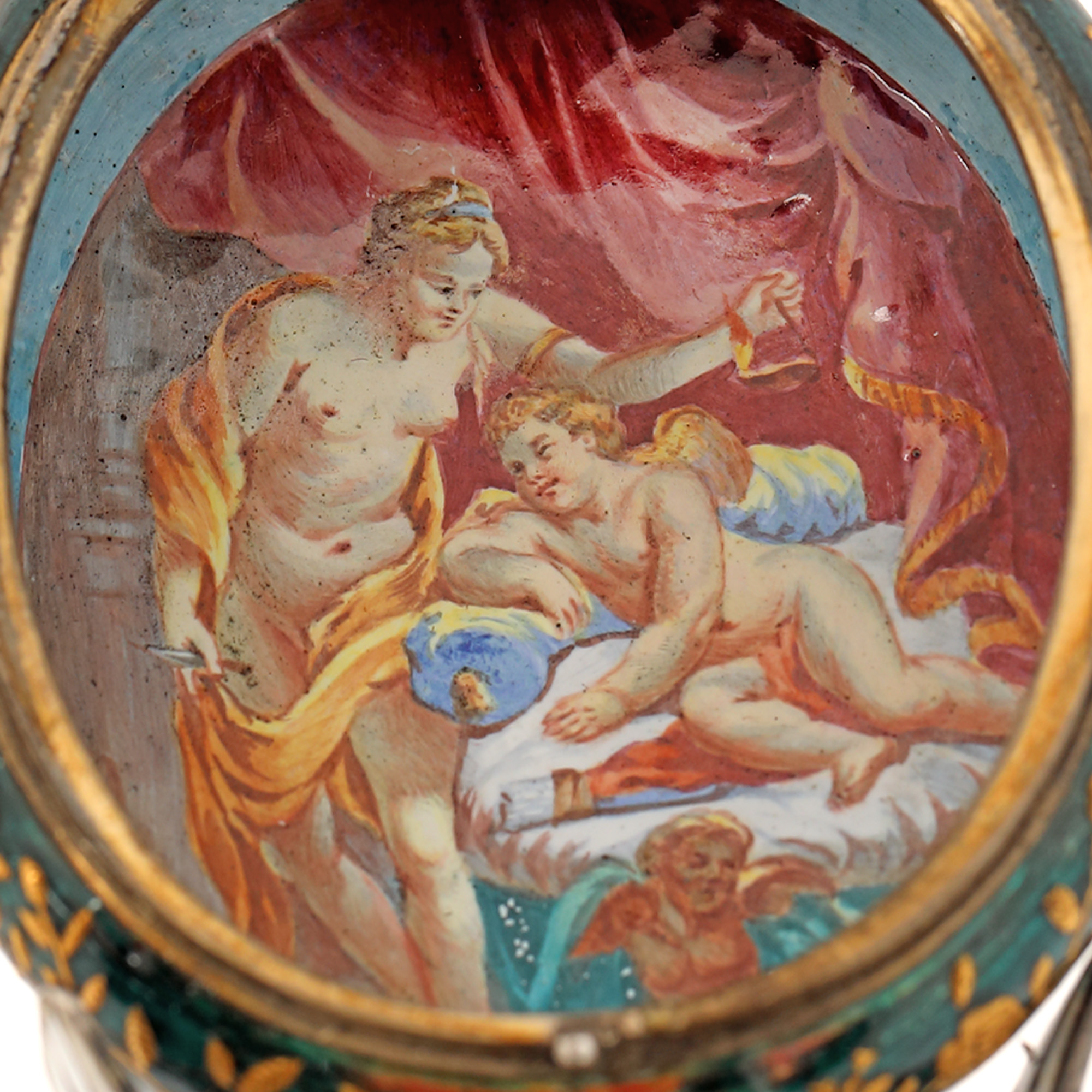 104. "Dragoste și credință" - spectaculoasă operă de ceasornicărie, din argint și email în varii tehnici, pentru birou, cu mecanism Lépine Paris, bogat pictat ori modelat cu motive religioase și mitologice (motivul Răpirii Europei de către Zeus, motivul dragostei între Adonis și Afrodita, legenda pelicanului care își hrănește puii cu sângele pieptului său), cca. 1880