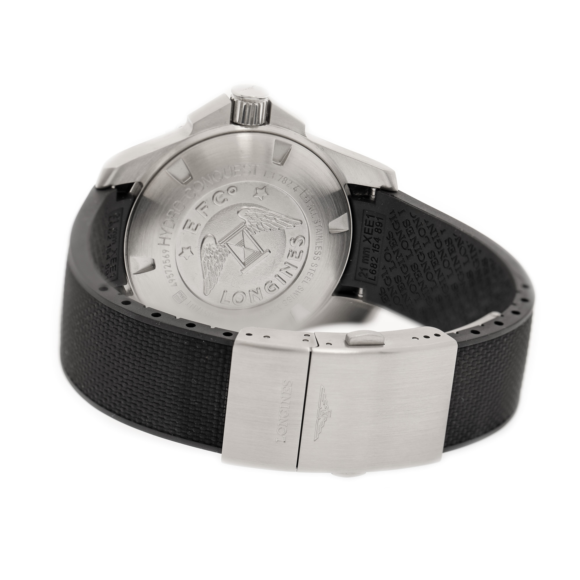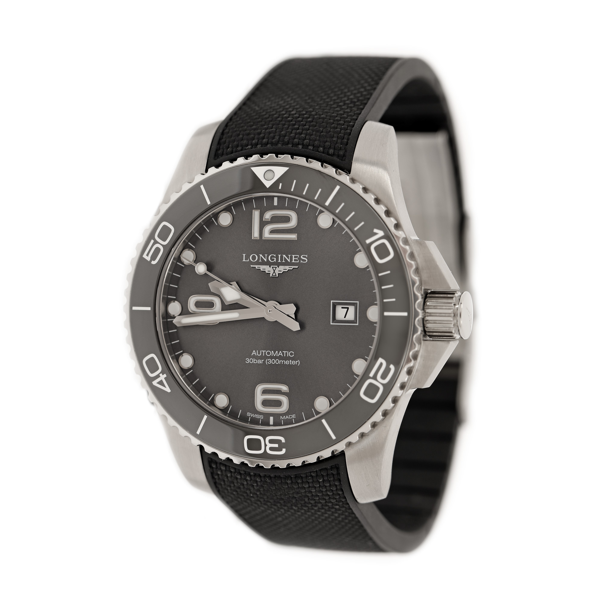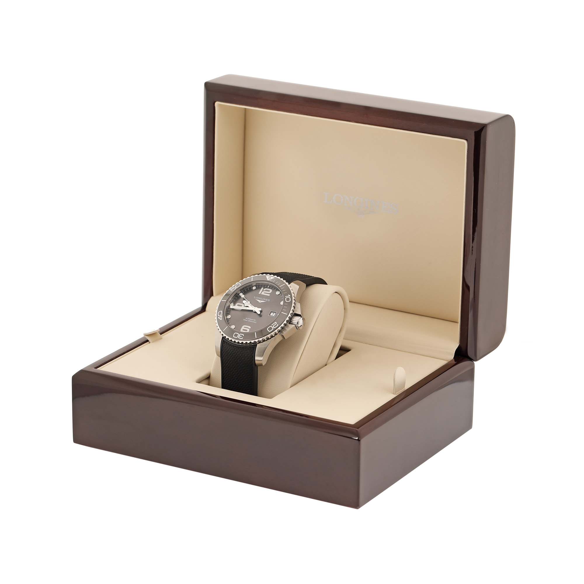 Longines Hydro Conquest de mână, bărbătesc, referință L3.782.4. Mecanism automatic, calibrul L888, bezel rotativ, unidirecțional. Cadran de culoare gri închis, indici numerale arabe pentru orele 6, 9 și 12, registru pentru dată în dreptul orei 3. Curea originală, din cauciuc, de culoare neagră, cu sistem de închidere clasic. Accesorii: cutia originală, card de garanție.