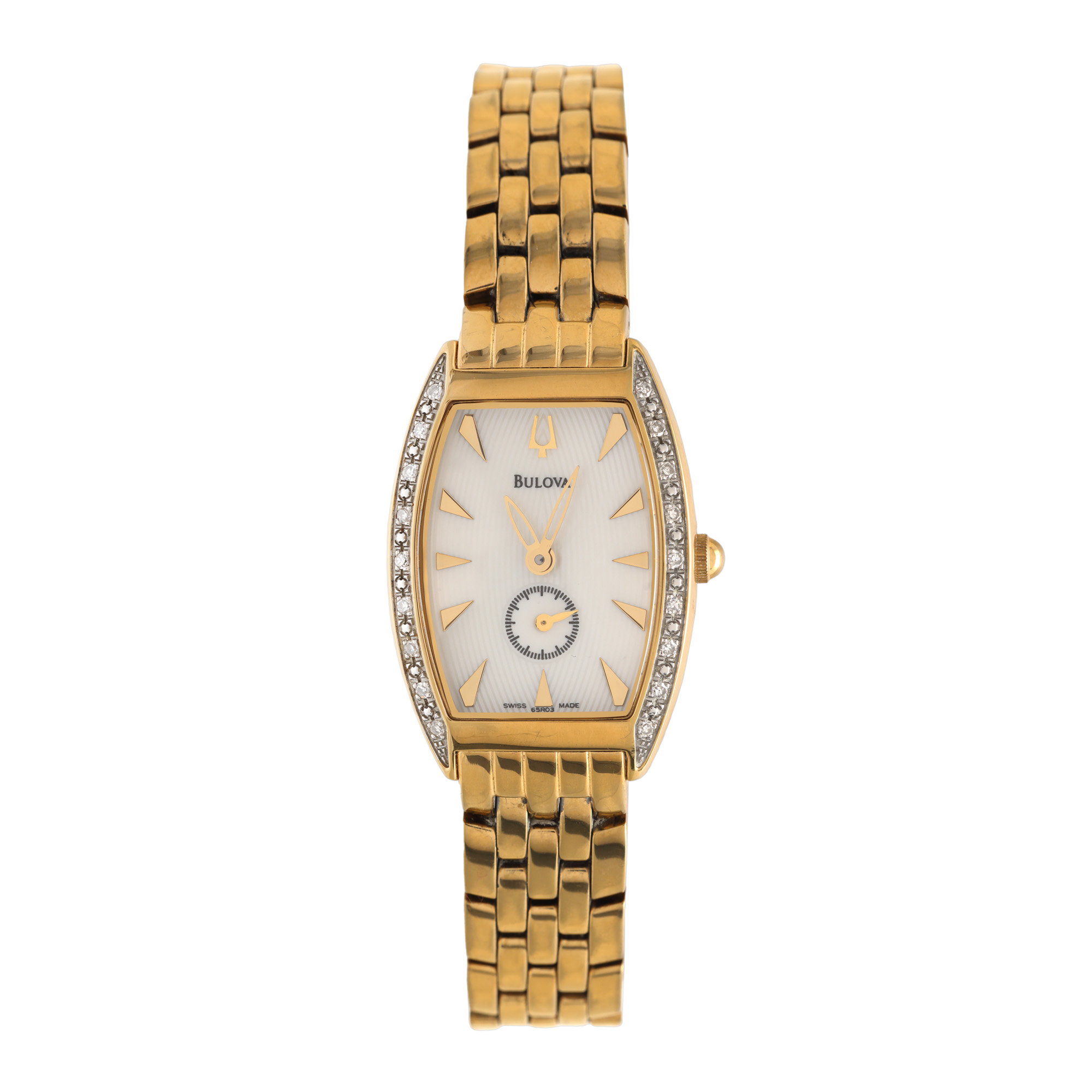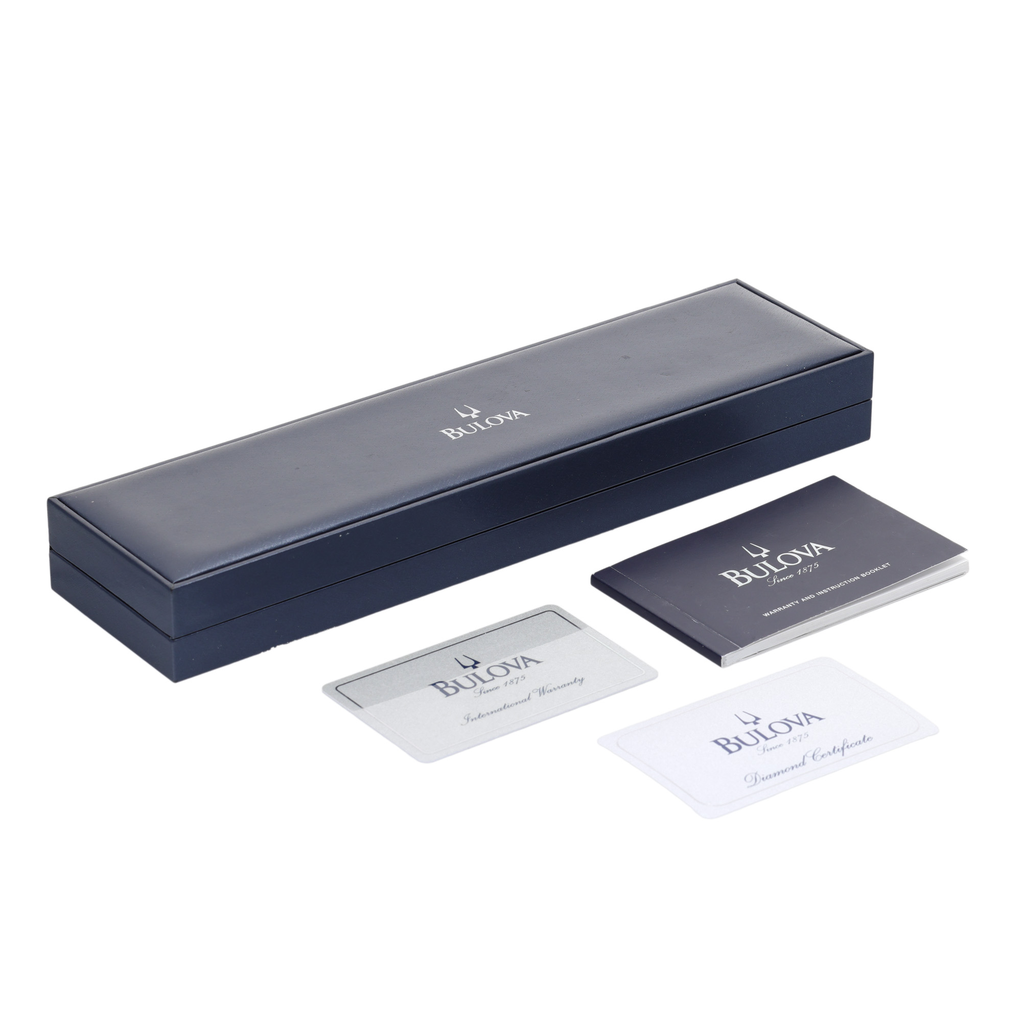 Ceas Bulova, cu diamante, de mână, de damă. Mecanism quartz. Bezel decorat cu 18 diamante. Cadran de culoare alb, decorat în tehnică guilloche, indici săgeți, registru pentru secundar în dreptul orei 6. Brățară originală, din oțel, cu sistem de închidere de tip deployant. Accesorii: cutia originală, manual de utilizare, card de garanție, certificat de autenticitate pentru diamante.