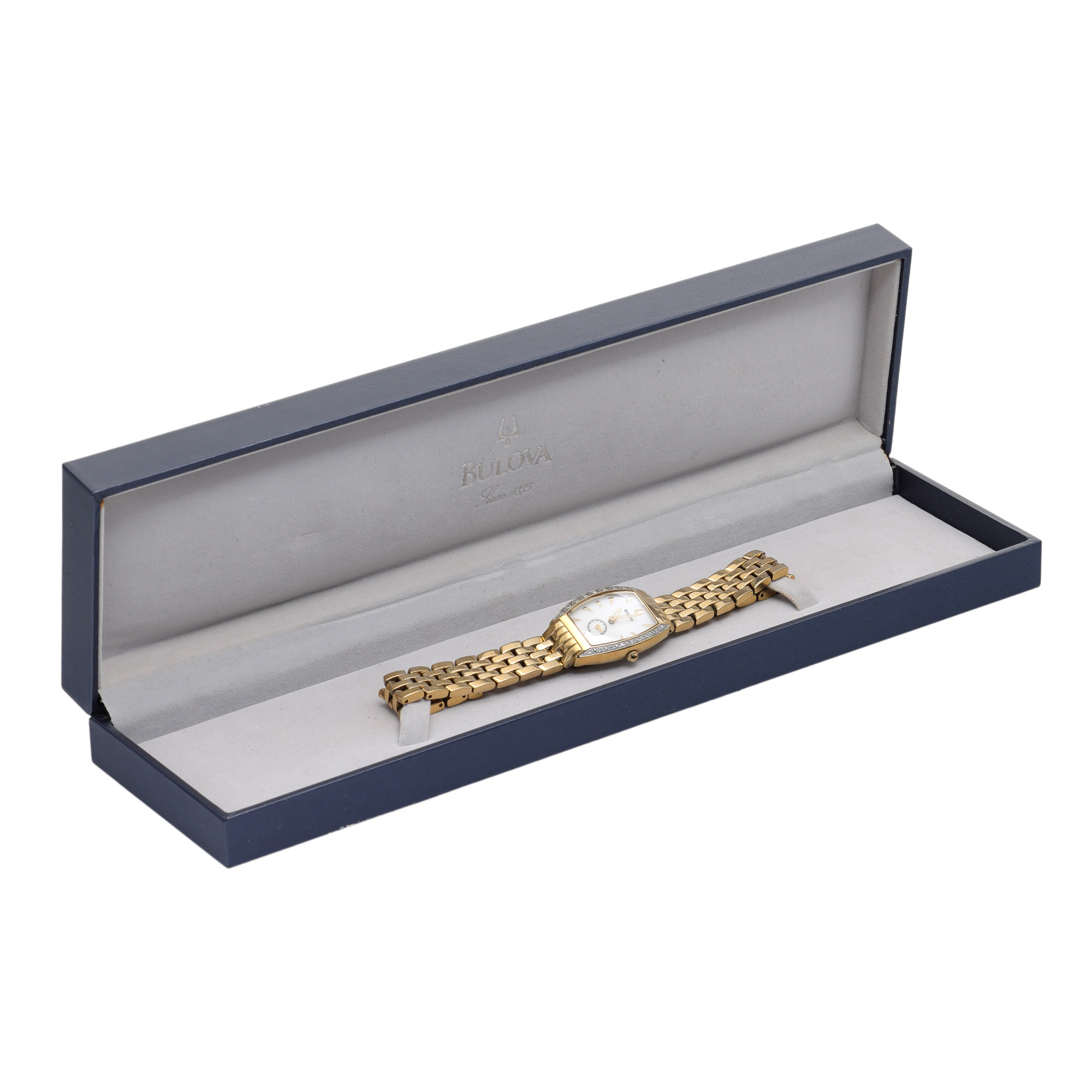 61. Ceas Bulova, cu diamante, de mână, de damă, însoțit de cutia originală, card de garanție și certificat de autenticitate pentru diamante [Cca. 1990]