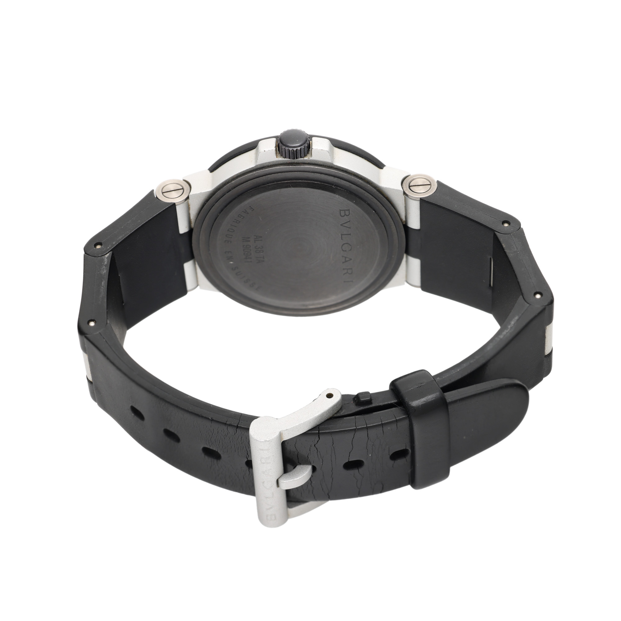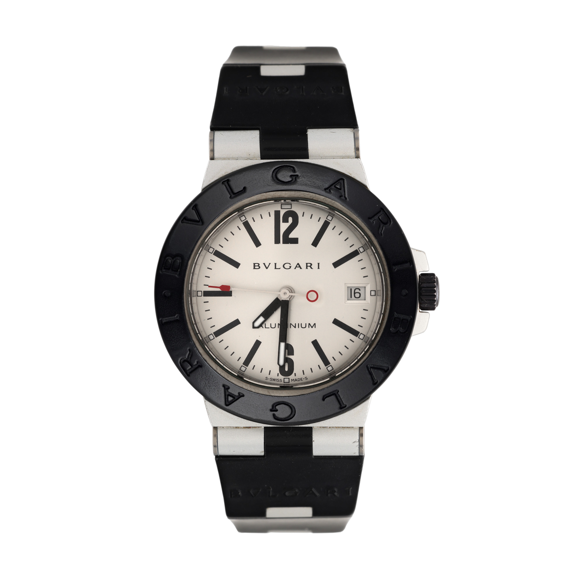 Ceas Bvlgari Diagono Aluminium, din aluminiu, de mână, unisex, referință AL38A. Mecansim automatic, calibrul 220. Cadran de culoare alb, indici cu numerale arabe pentru orele 12 și 6, indici liniari pentru restul orelor, cu un registru pentru dată în dreptul orei 3. Curea originală din cauciuc, cu îmbinări din aluminiu, cu sistem de închidere de tip clasic. Accesorii: cutia originală, card de garanție, certificat de autenticitate și broșuri.