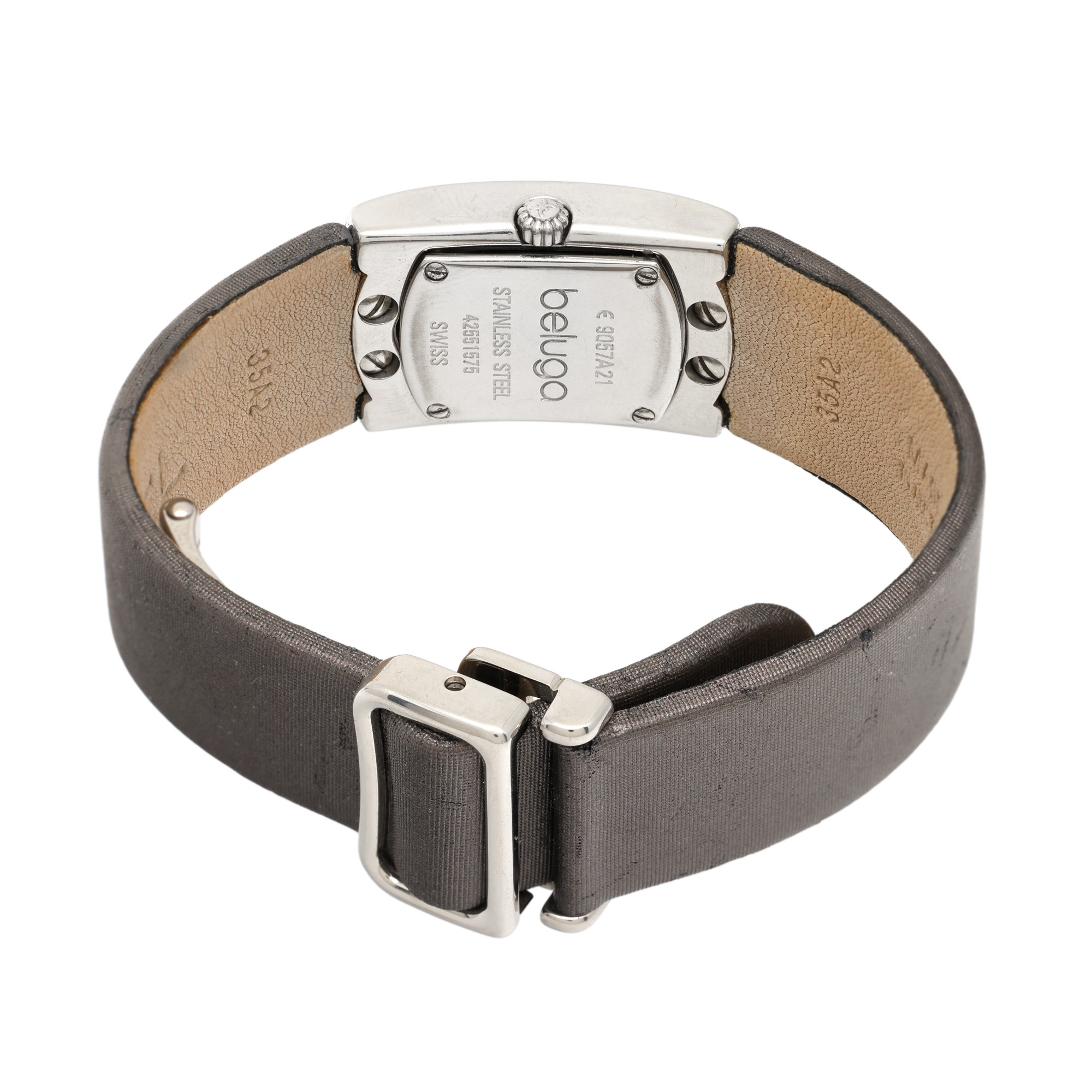 Ceas Ebel Beluga, cu diamante, de mână, de damă, referință 9057A21. Mecanism quartz. Cadran de culoare argintiu, indici din diamante pentru orele cardinale. Curea originală, din piele îmbrăcată în material textil satinat, cu sistem de închidere de tip deployant.
