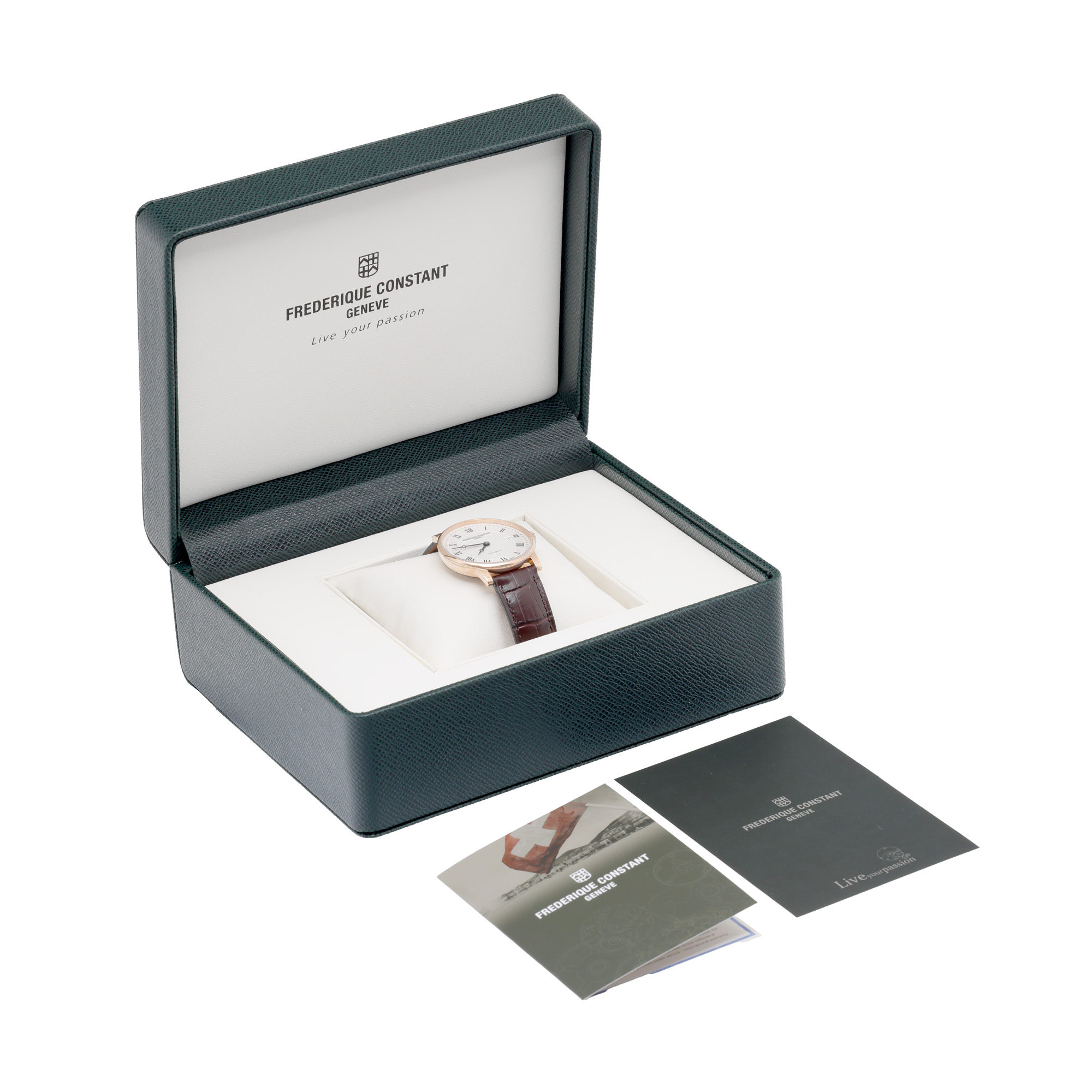 87. Ceas Frederique Constant, din aur roz, de mână, bărbătesc, însoțit de certificat de autenticitate și cutia originală [Cca. 2023]