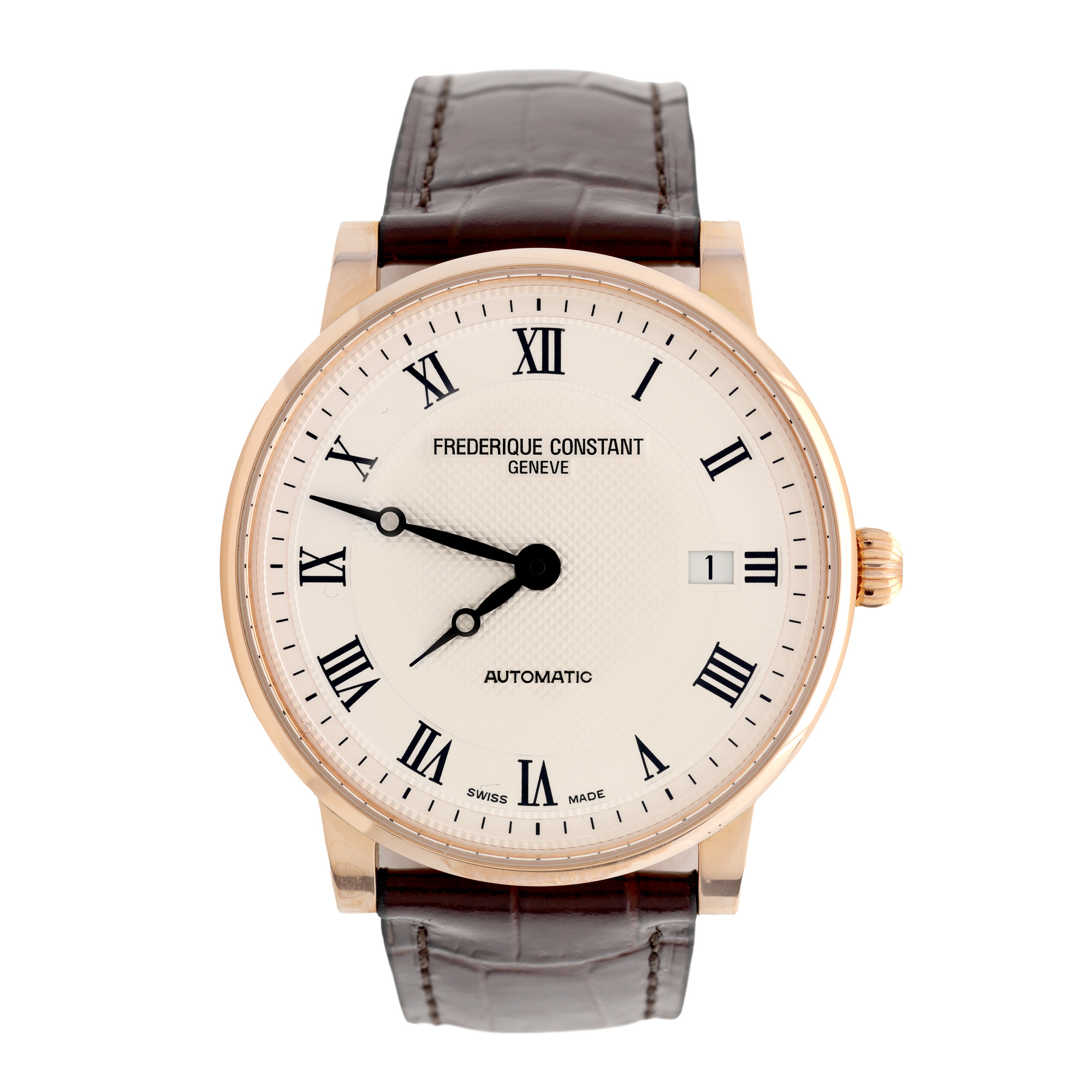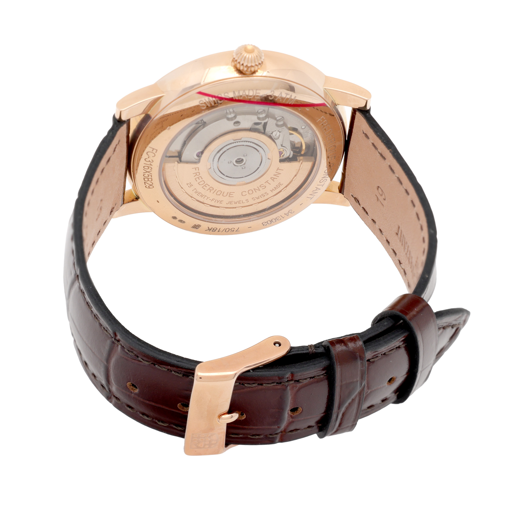 Ceas Frederique Constant, din aur roz, de mână, bărbătesc, referință FC-316MC5B9. Mecanism automatic, calibrul FC-316. Cadran de culoare alb, decorat în tehnica guilloche, cu un registru pentru dată în dreptul orei 3. Curea originală, din piele, de culoare maro, cu sistem de închidere de tip clasic. Accesorii: certificat de autenticitate și cutia originală.