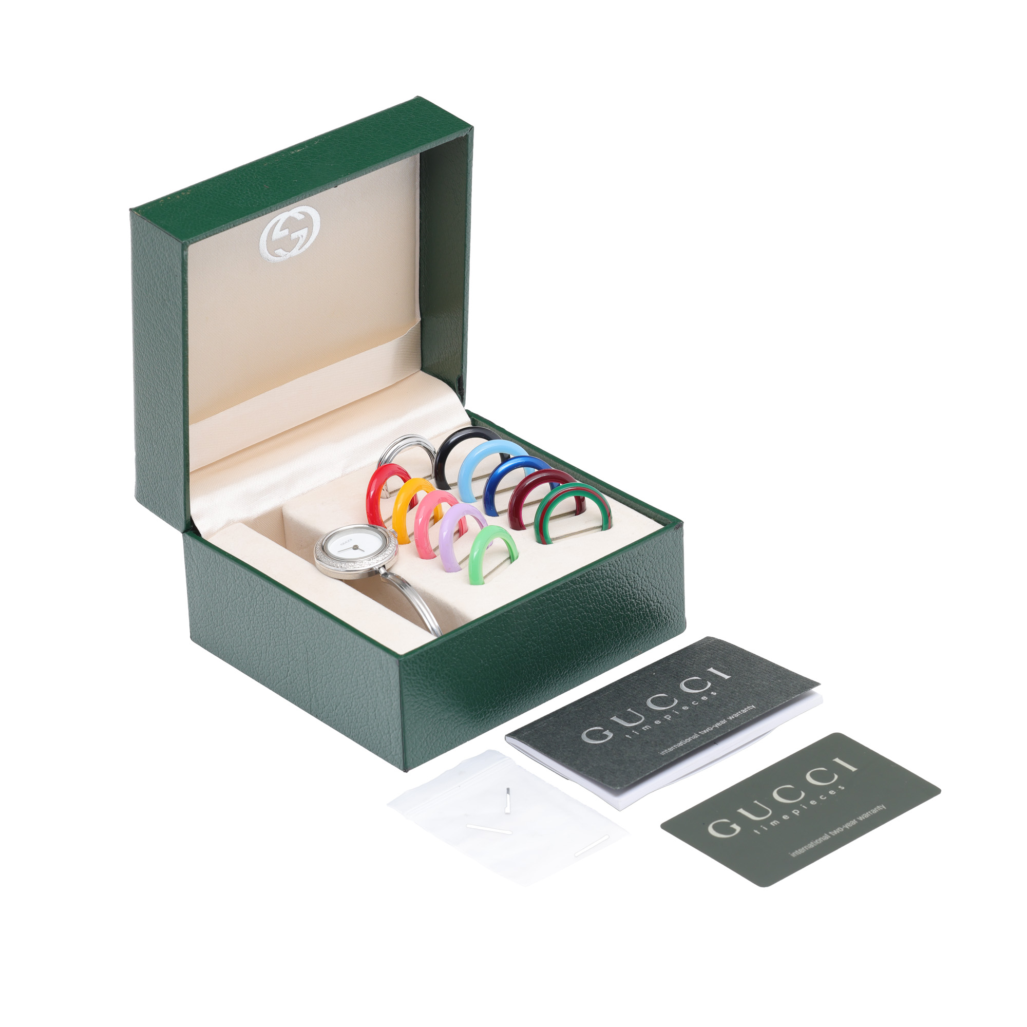 75. Ceas Gucci 11.12 Bezels, de mână, de damă, cu 11 bezeluri adiționale, însoțit de cutia originală, card de garanție și broșură [1998]