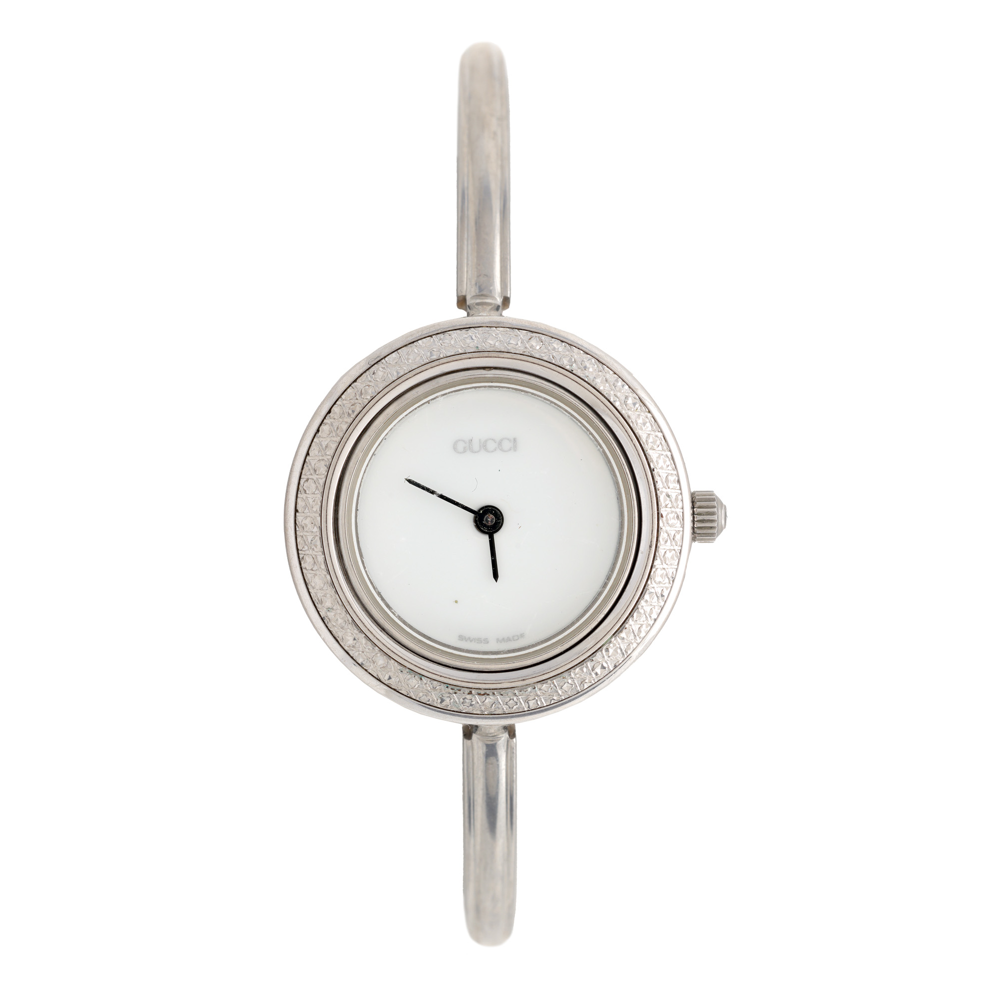 Ceas Gucci 11.12 Bezels, de mână, de damă, referință 11.12.2. Mecanism quartz, cadran de culoare alb, lipsit de indici. Brățară originală, din oțel inoxidabil, cu sistem de închidere cu clemă. Accesorii: 11 bezeluri adiționale, cutia originală, card de garanție, broșură.