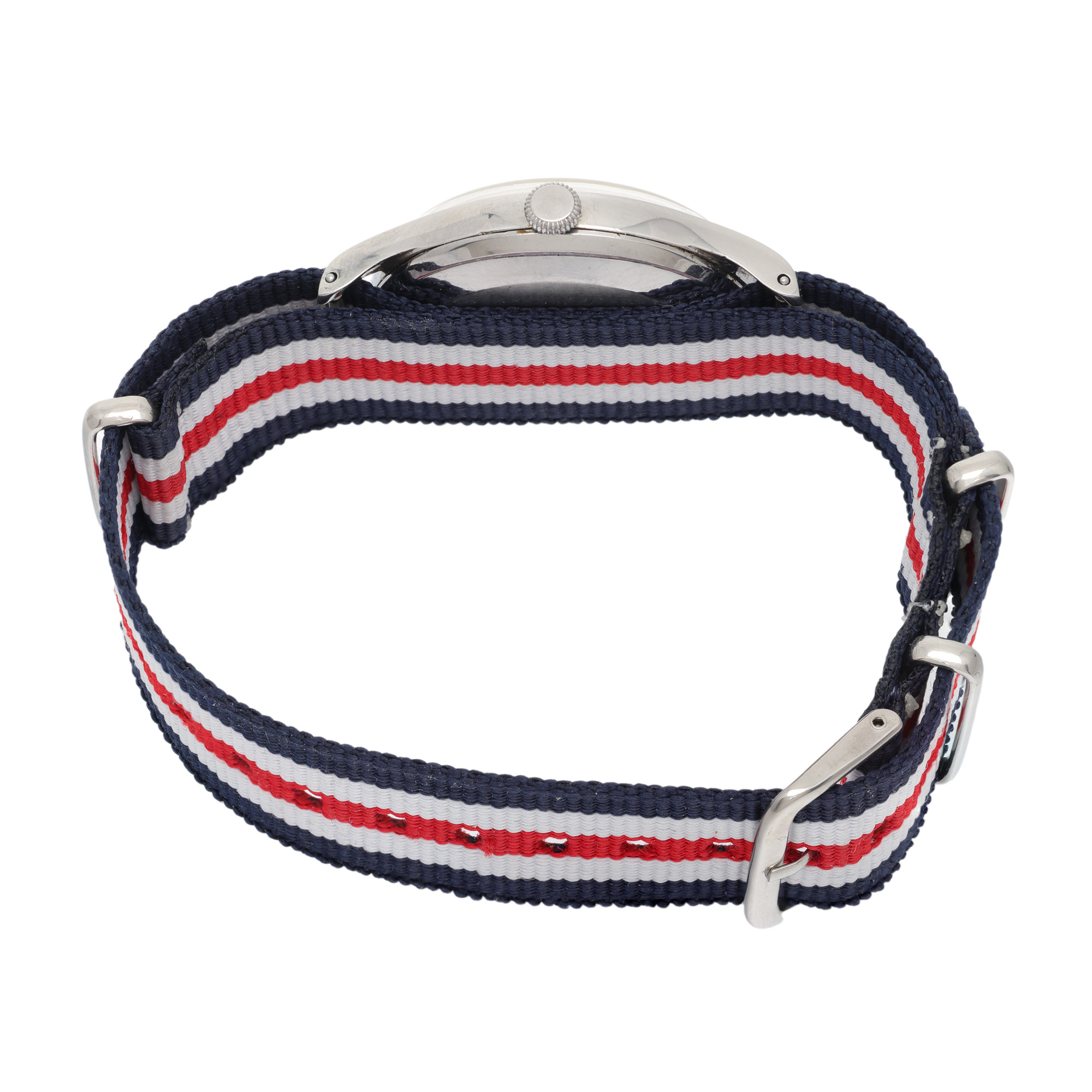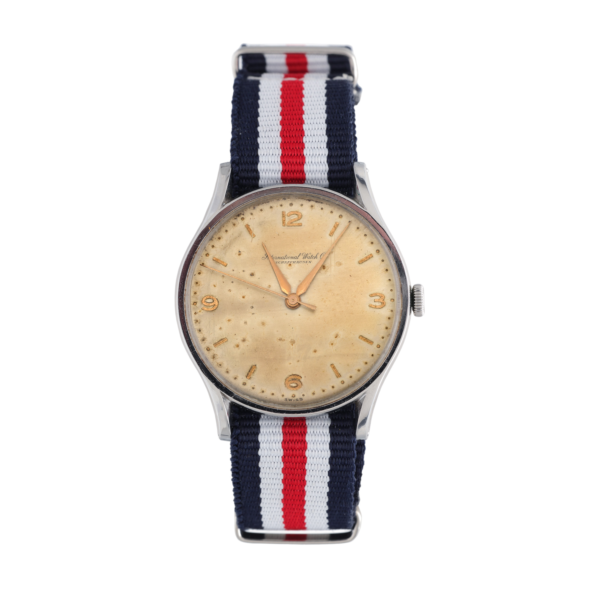 Ceas IWC Calatrava, de mână, bărbătesc. Mecanism cu armare manuală, calibrul 89. Cadran de culoare alb patinat, indici cu numerale arabe pentru orele 12, 3, 6 și 9, indici liniari pentru restul orelor. Curea adăugată aftermarket din material textil, cu sistem de închidere de tip clasic. Observații: cadranul este parțial oxidat.