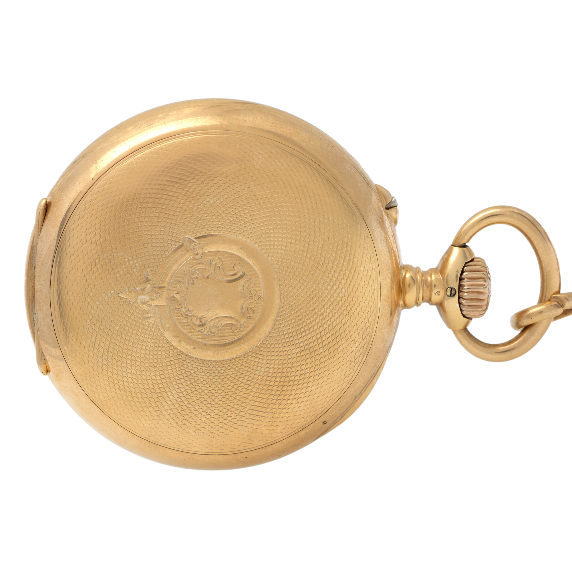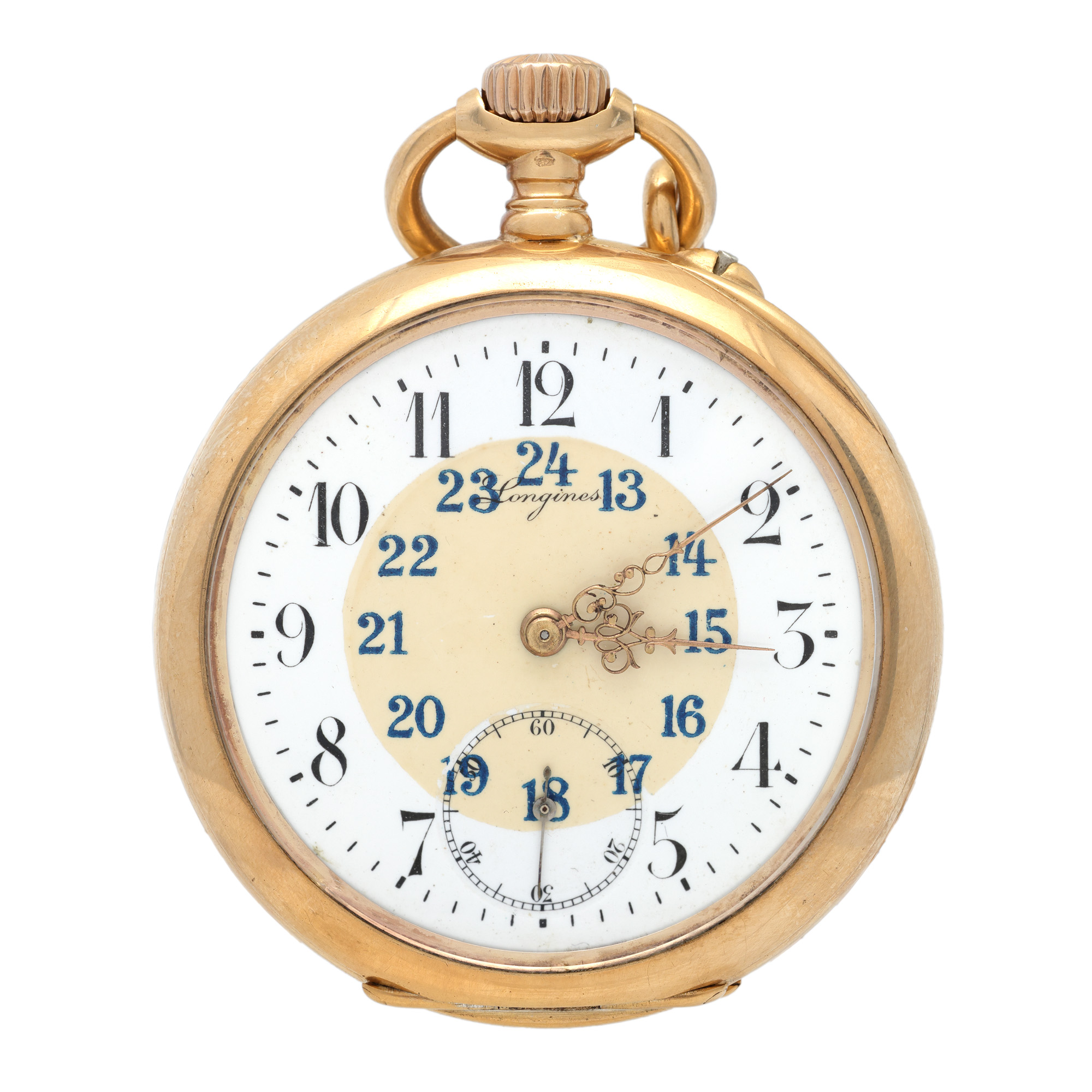 Ceas Longines, din argint aurit, de buzunar. Mecanism cu armare manuală. Cadran de culoare alb cu indici numerale arabe, registru pentru secundar în dreptul orei 6. Accesorii: lanț din argint aurit.