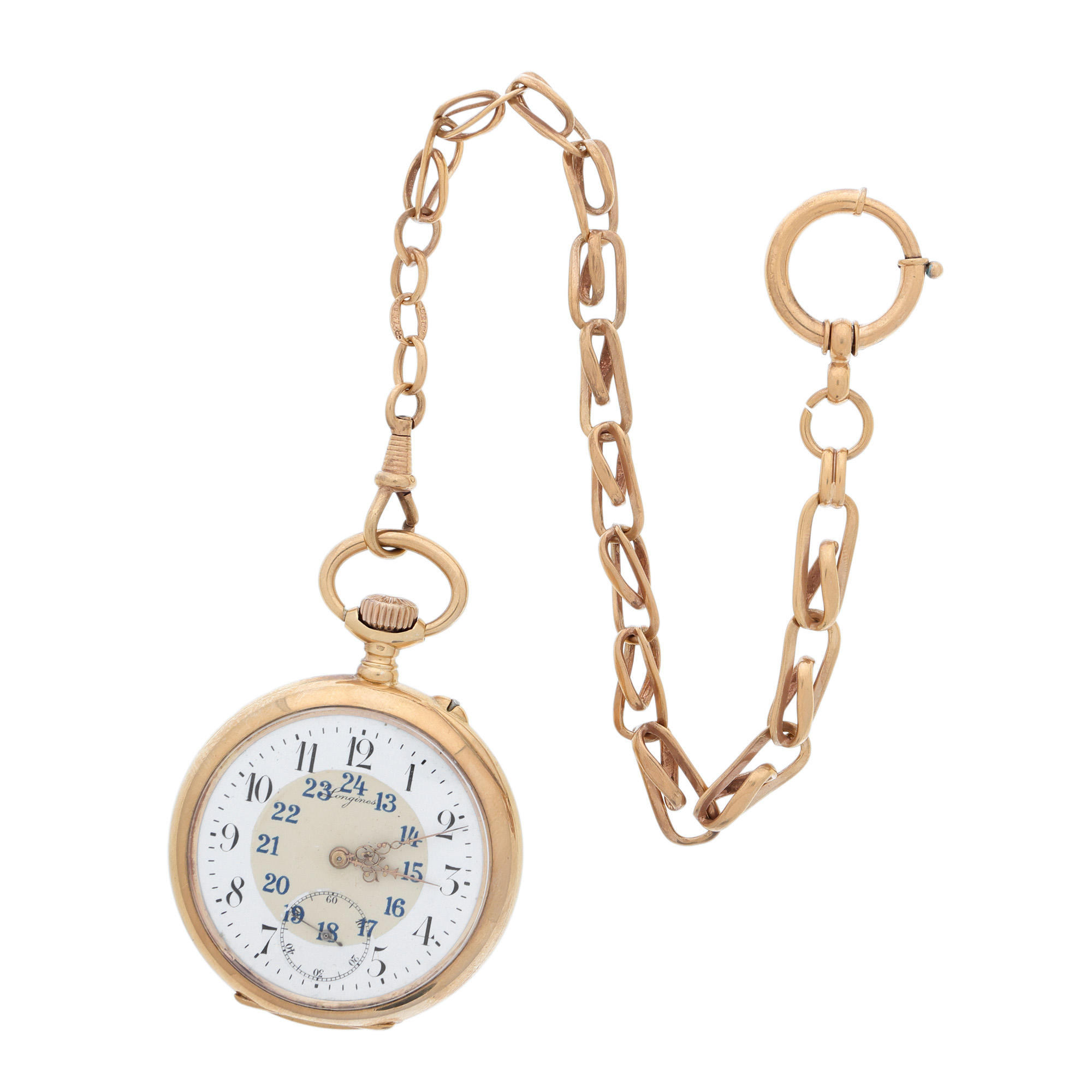 65. Ceas Longines, din argint aurit, de buzunar, însoțit de lanț din argint aurit [Cca. 1930]
