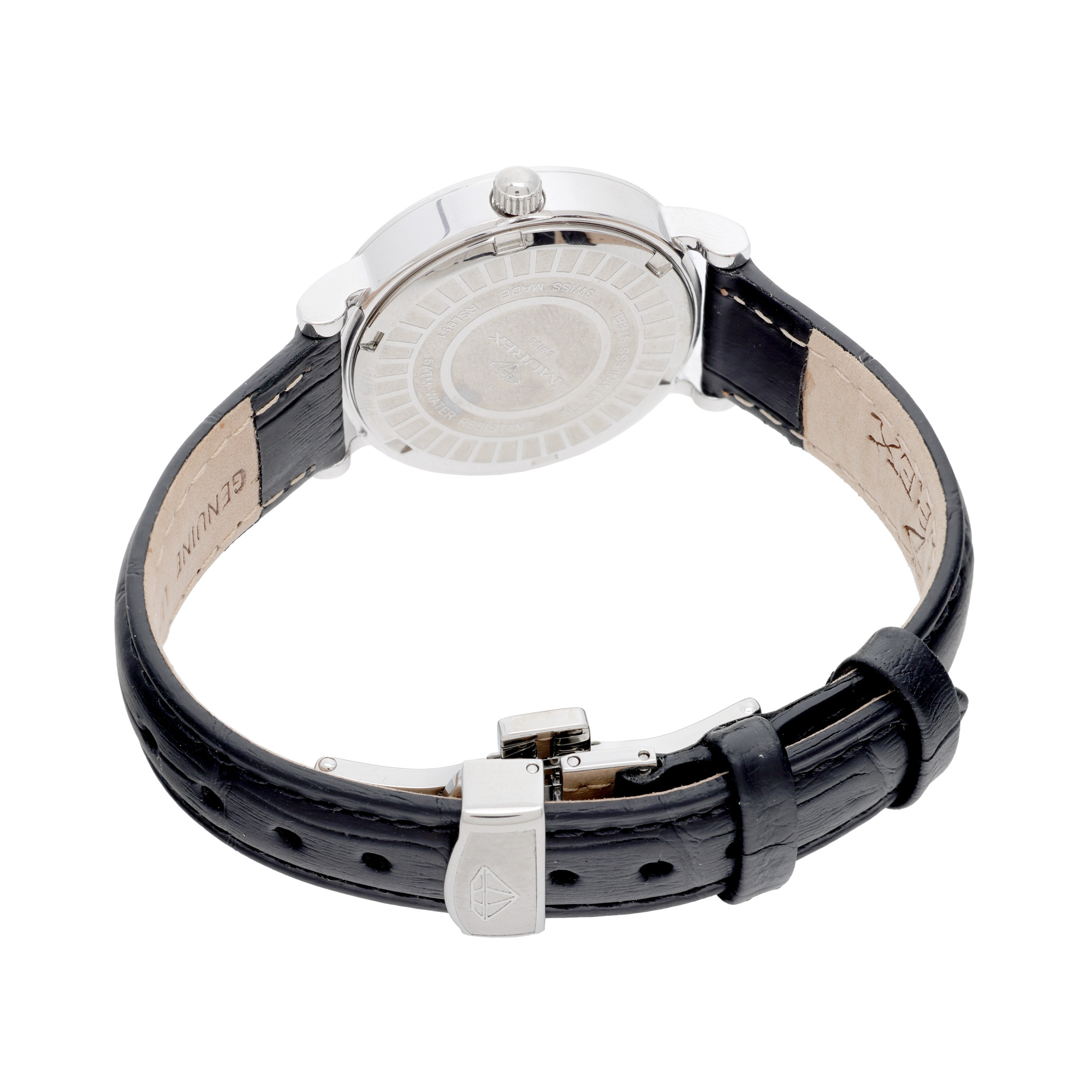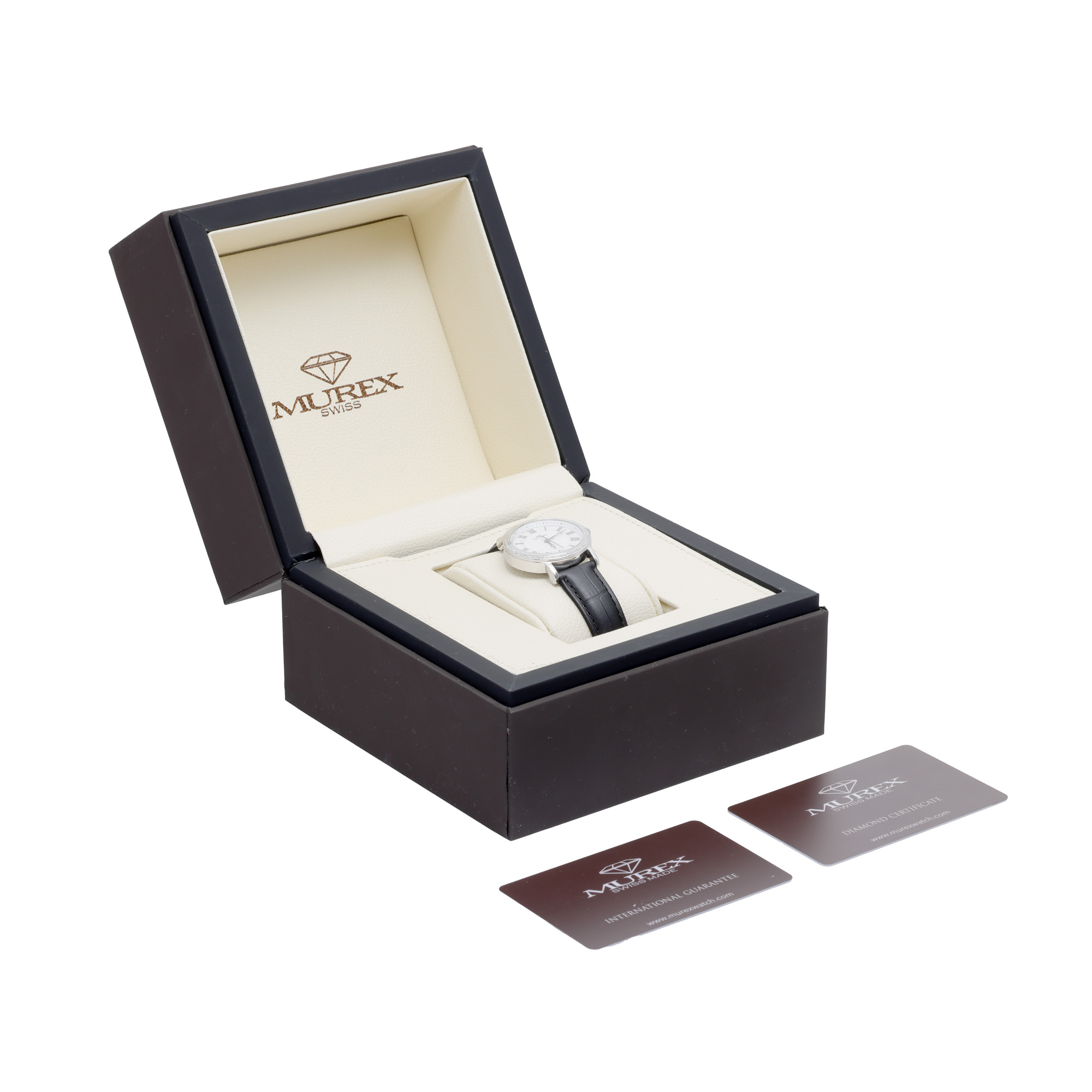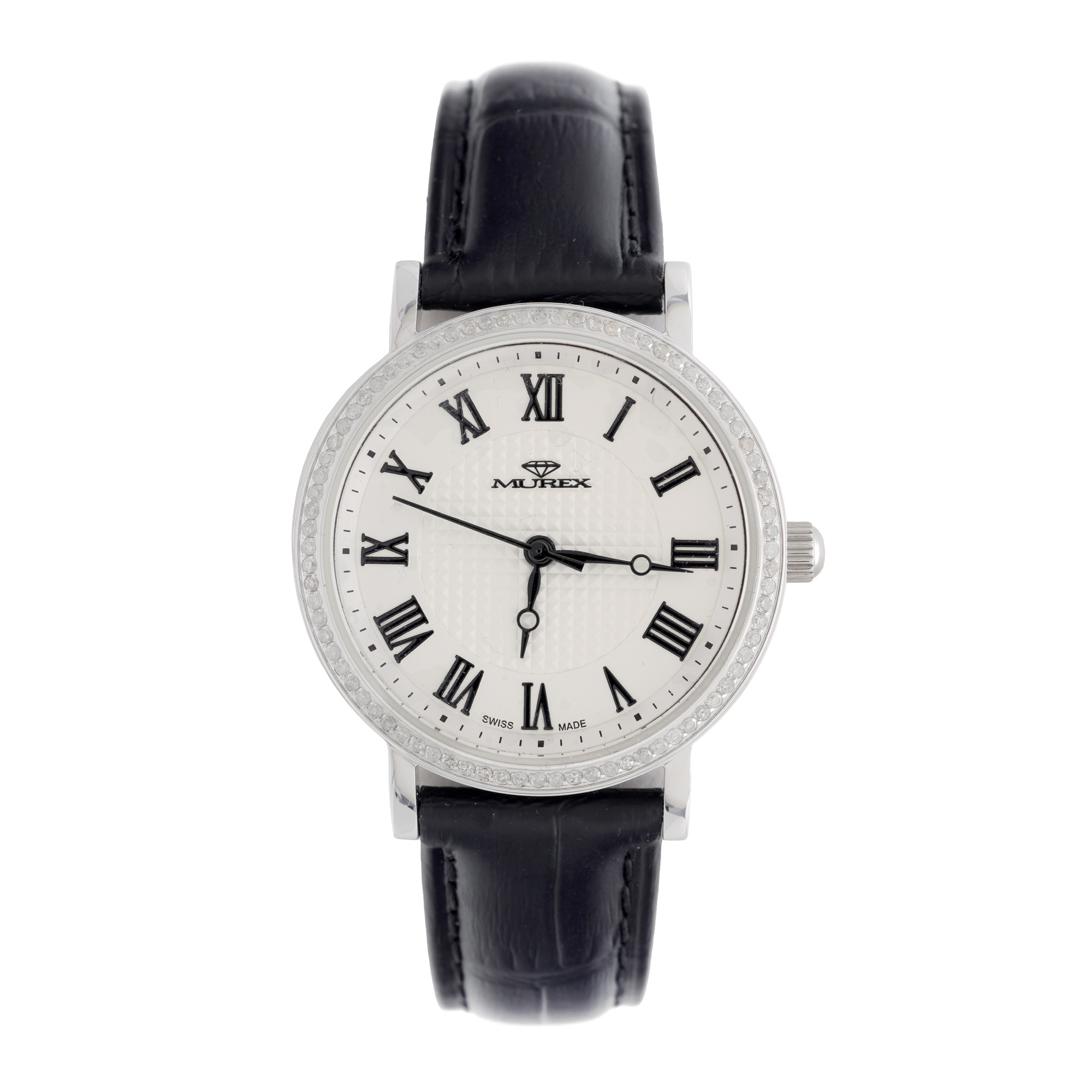 Ceas Murex D1, nou, cu diamante, de mână, de damă. Mecanism quartz, calibrul Ronda. Bezel fix decorat integral cu diamante. Cadran de culoare alb și argintiu, executat în tehnică guilloche, indici numerale romane. Curea originală, din piele, de culoare neagră, cu sistem de închidere de tip deployant. Accesorii: cutia originală, certificat de garanție și certificat de autenticitate pentru diamante.