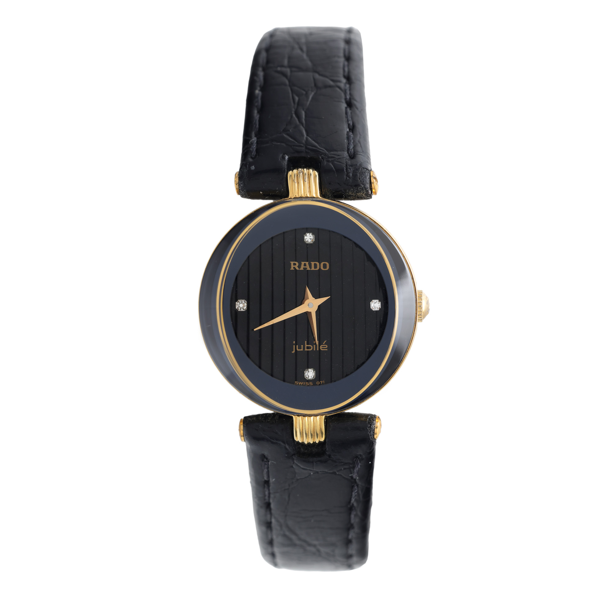 Ceas Rado Jubilee, cu diamante, de mână, de damă, referință 153.3695.2. Mecanism quartz. Cadran de culoare negru, indici diamante pentru orele cardinale. Curea originală, din piele, de culoare neagră, cu sistem de închidere clasic cu cataramă.