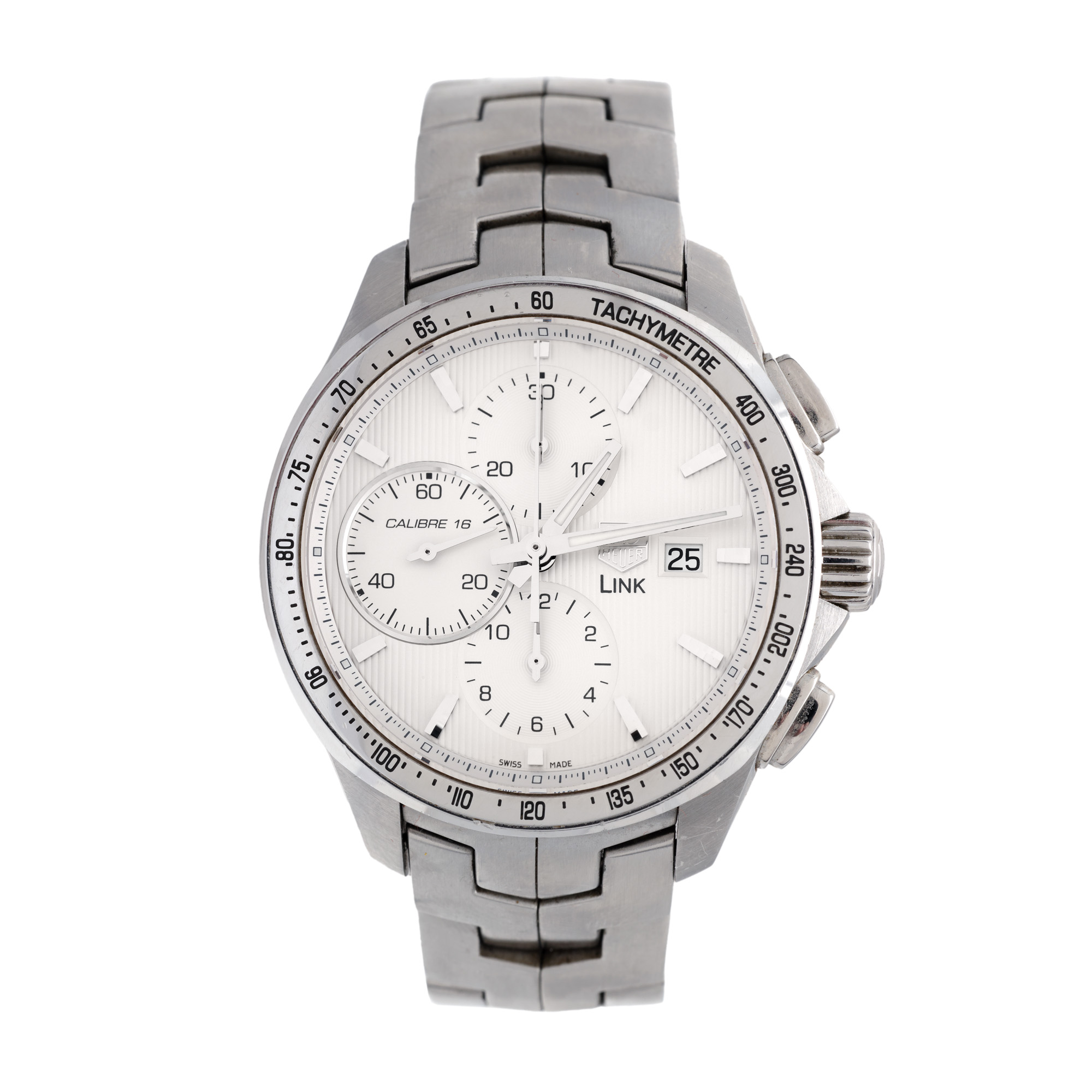 Ceas Tag Heuer Link, de mână, bărbătesc, referință CAT2011.BA0952. Mecanism automatic, calibrul 16, cu funcție de chronograph. Cadran de culoare alb, indici baghete, registru pentru dată în dreptul orei 3, registru pentru secundar în dreptul orei 9, două registre pentru chronograph în dreptul orelor 6 și 12. Brățară originală, din oțel, cu sistem de închidere de tip deployant.