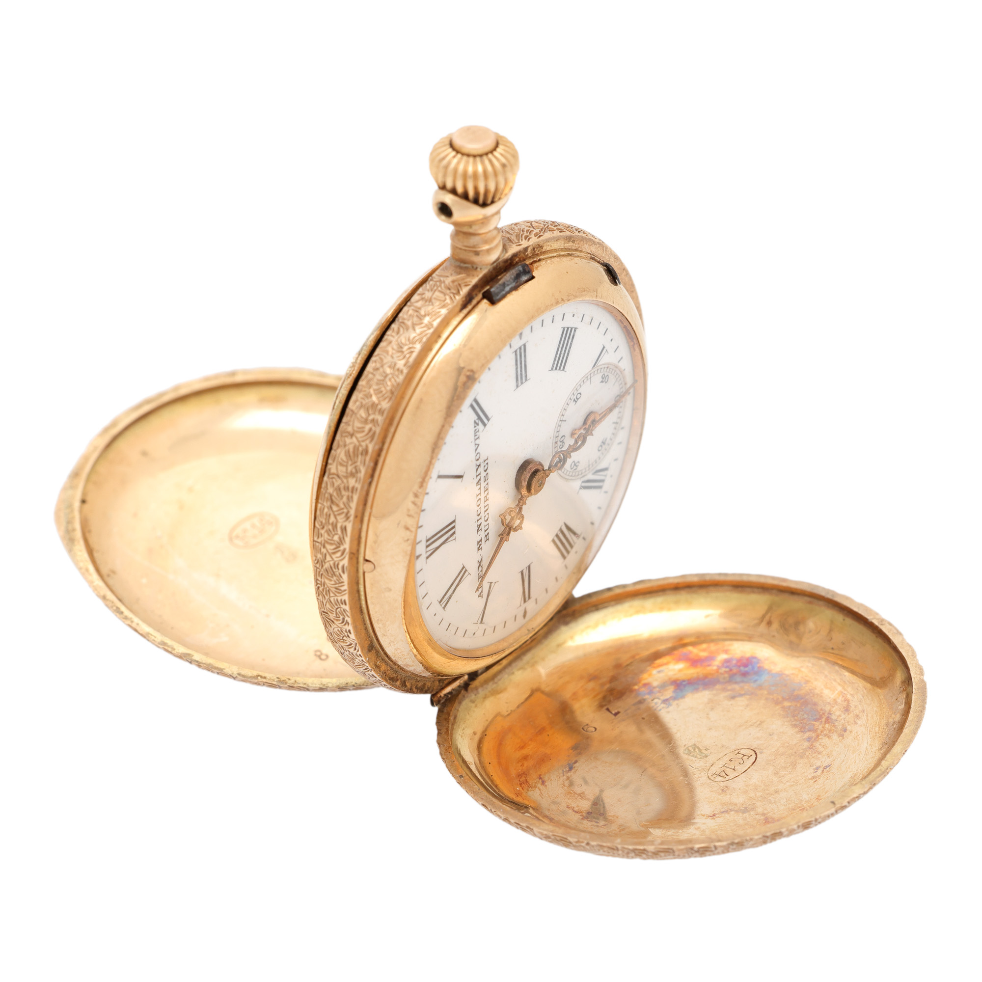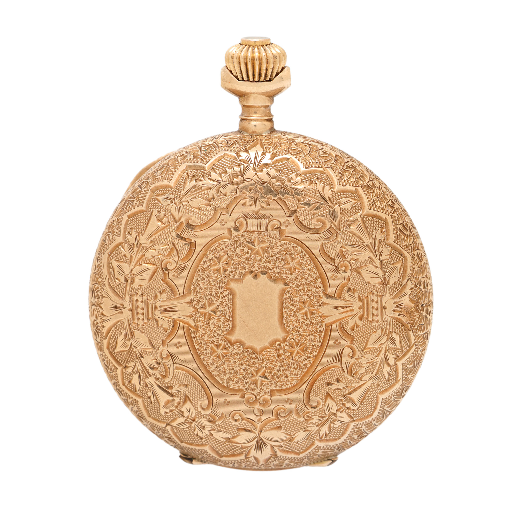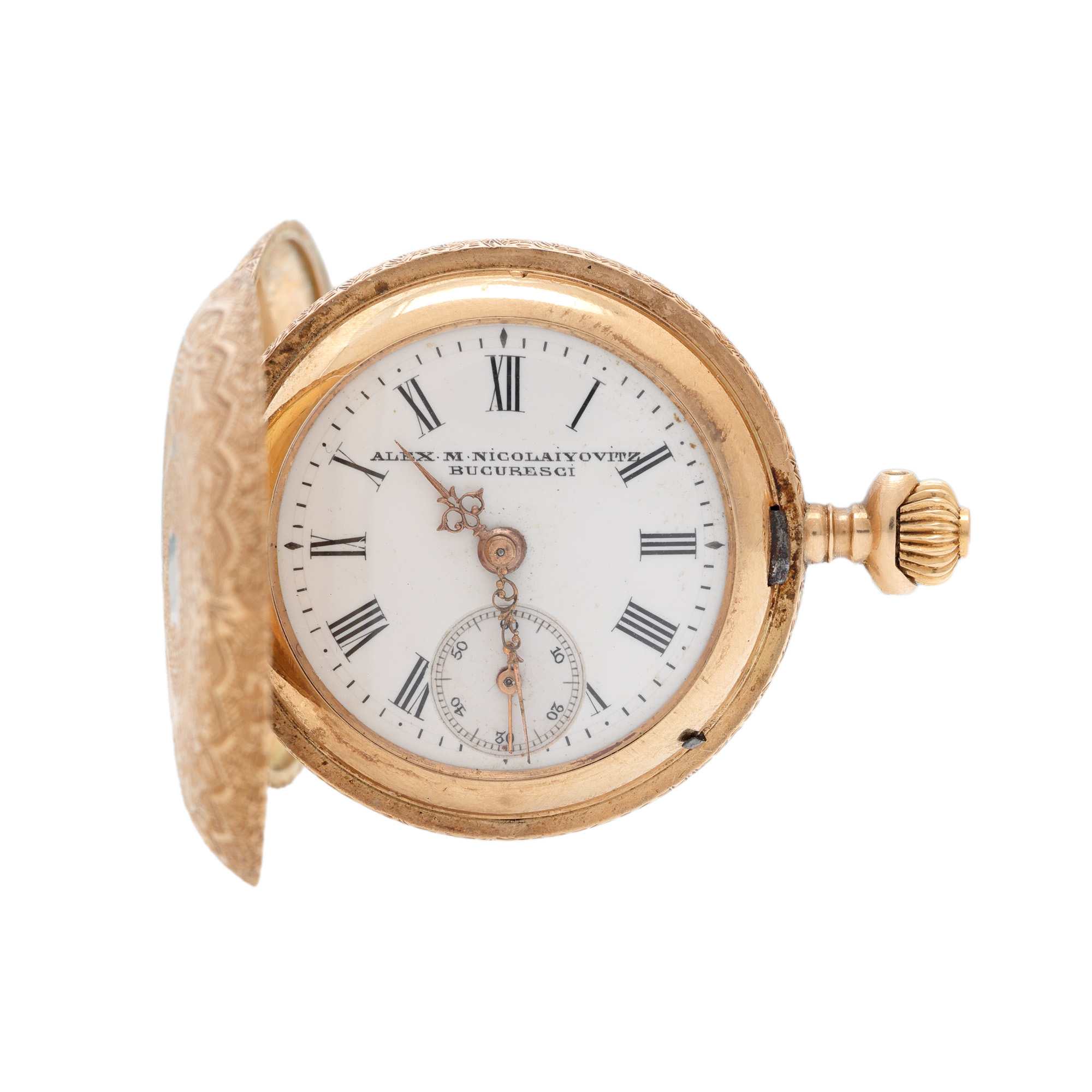 54. Rar ceas Alex M. Nicolaiyovitz, Bucuresci, din aur gravat, de mână, de damă, cu cartuș monogramabil [Cca. 1900]