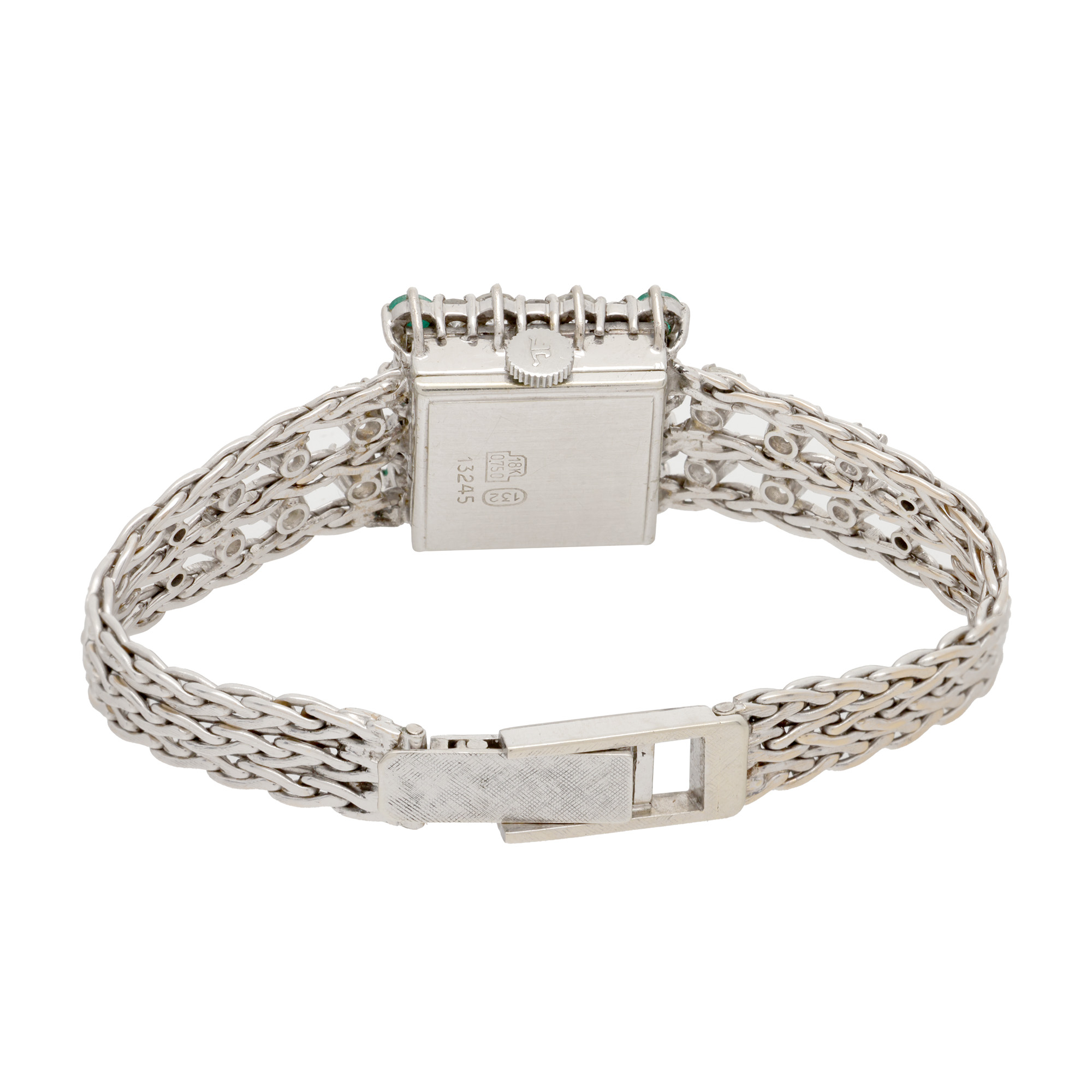 46. Rar ceas Jaeger LeCoultre, din aur alb, cu diamante și smaralde, de mână, de damă [Cca. 1970]