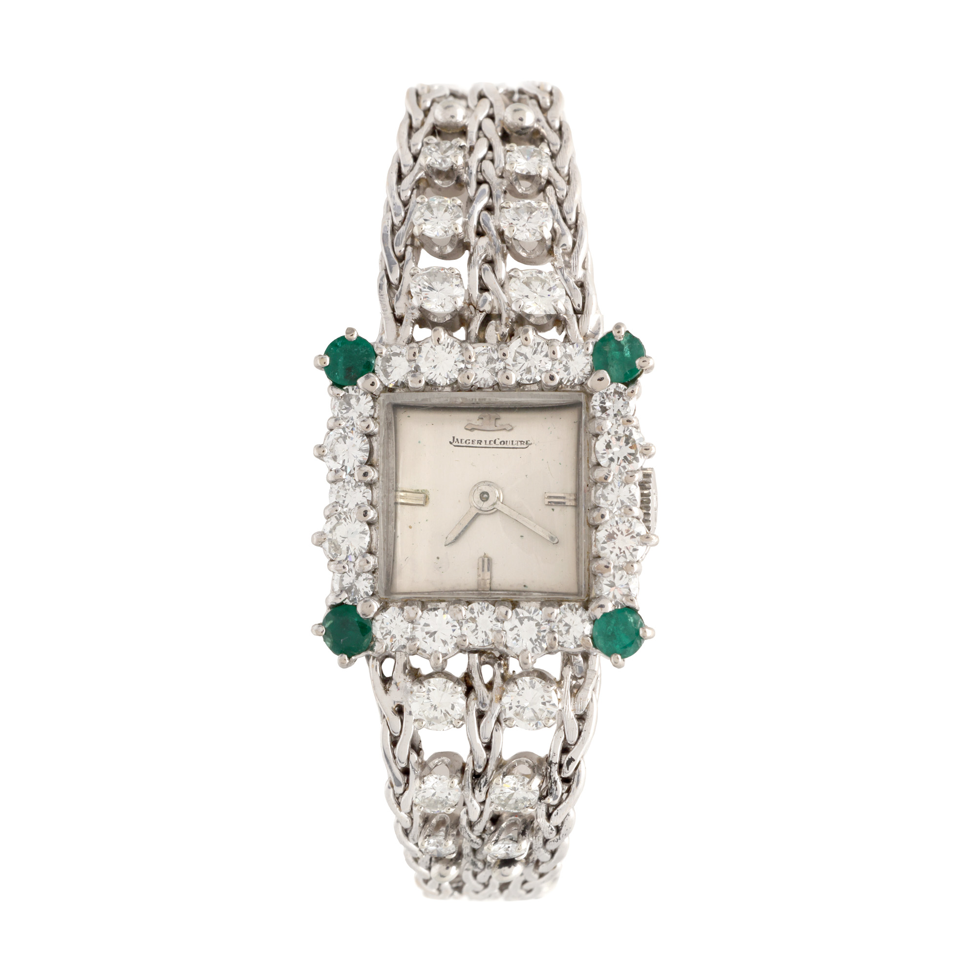Ceas Jaeger LeCoultre, din aur alb, cu diamante și smaralde, de mână, de damă. Mecanism cu armare manuală, cadran de culoare argintiu, indici liniari pentru orele 3 și 9. Brățară originală, din aur alb, cu diamante, cu sistem de închidere cu clemă.