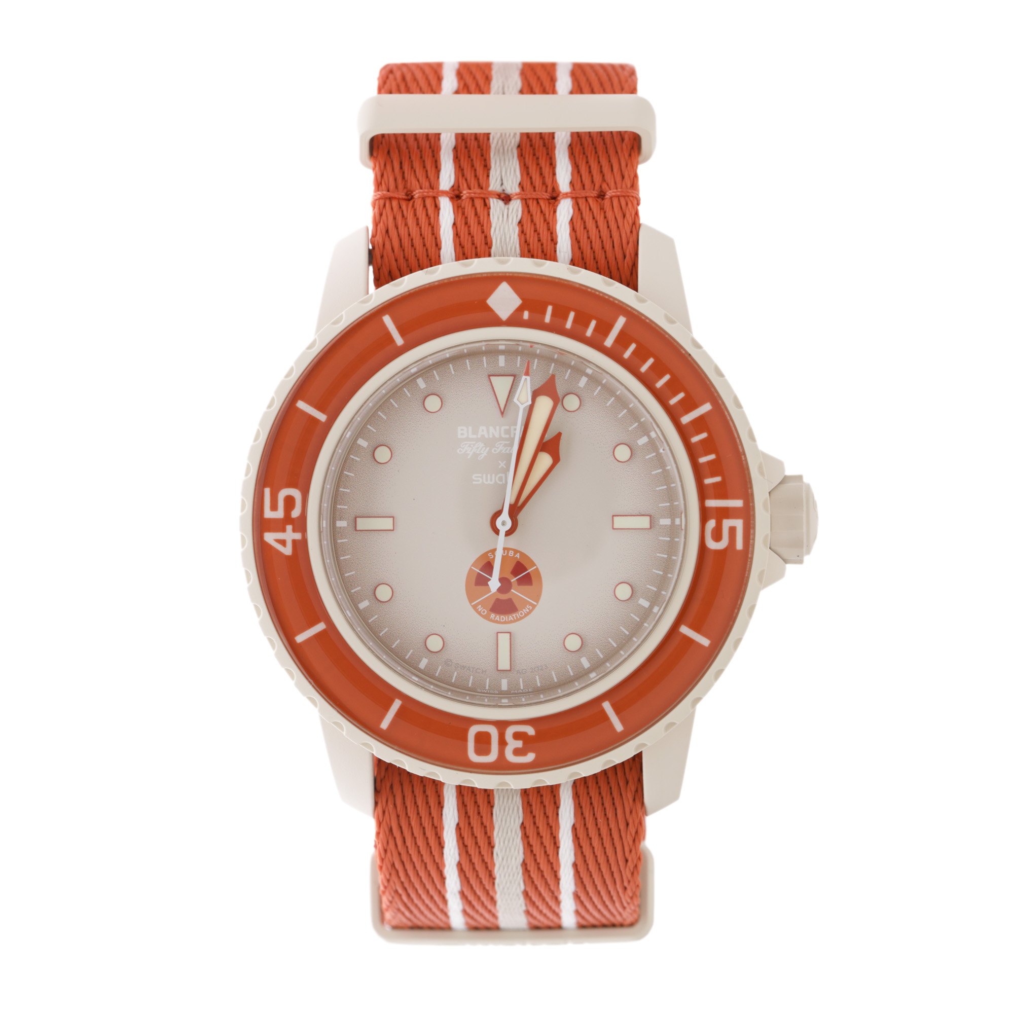 Ceas BlancPain & Swatch Scuba Fifty Fathoms Arctic Ocean, nou, de mână, unisex, referință SO35P100. Mecanism automatic, calibrul System 51, bezel rotativ unidirecțional, anterior vitrat. Cadran de culoare alb, indici triunghiulari, cu un registru pentru dată între orele 4 și 5. Curea originală, din material textil, multicoloră, cu sistem de închidere de tip clasic. Accesorii: cutia originală.