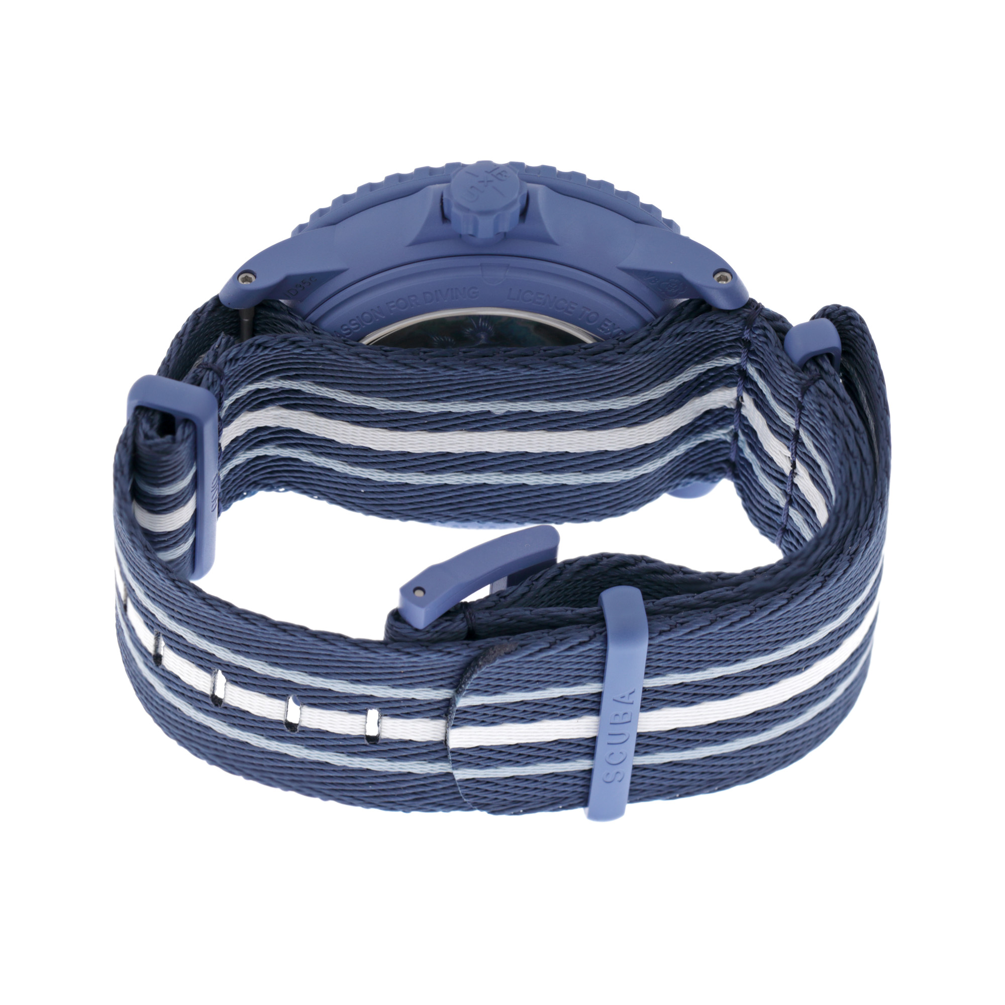 Ceas BlancPain & Swatch Scuba Fifty Fathoms Atlantic Ocean, nou, de mână, unisex, referință SO35P100. Mecanism automatic, calibrul System 51, bezel rotativ unidirecțional, anterior vitrat. Cadran de culoare alb, indici triunghiulari, cu un registru pentru dată între orele 4 și 5. Curea originală, din material textil, multicoloră, cu sistem de închidere de tip clasic. Accesorii: cutia originală.