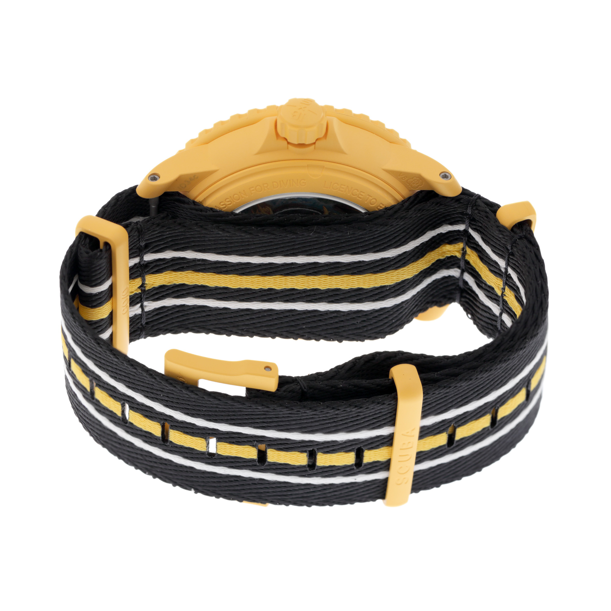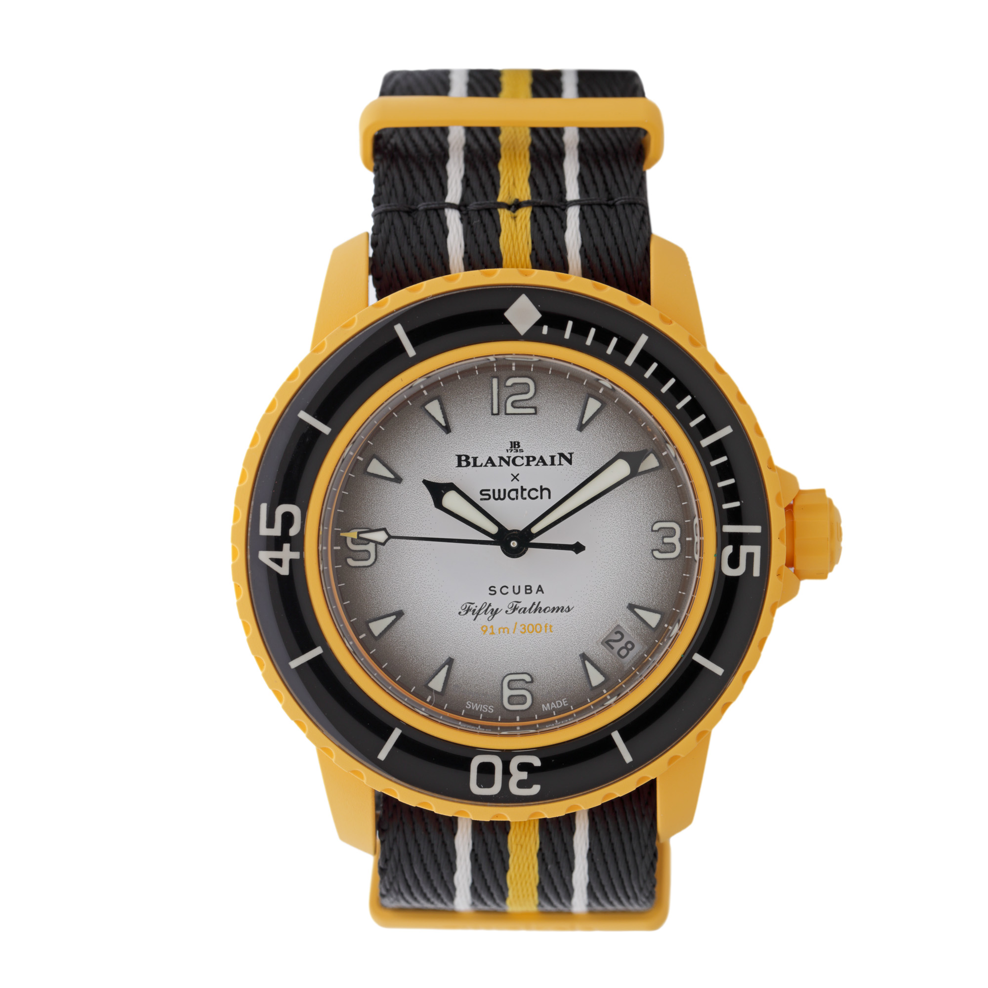 Ceas BlancPain & Swatch Scuba Fifty Fathoms Pacific Ocean, nou, de mână, unisex, referință SO35P100. Mecanism automatic, calibrul System 51, bezel rotativ unidirecțional, anterior vitrat. Cadran de culoare alb, indici triunghiulari, cu un registru pentru dată între orele 4 și 5. Curea originală, din material textil, multicoloră, cu sistem de închidere de tip clasic. Accesorii: cutia originală.